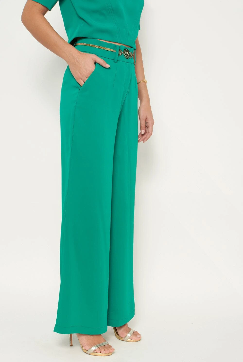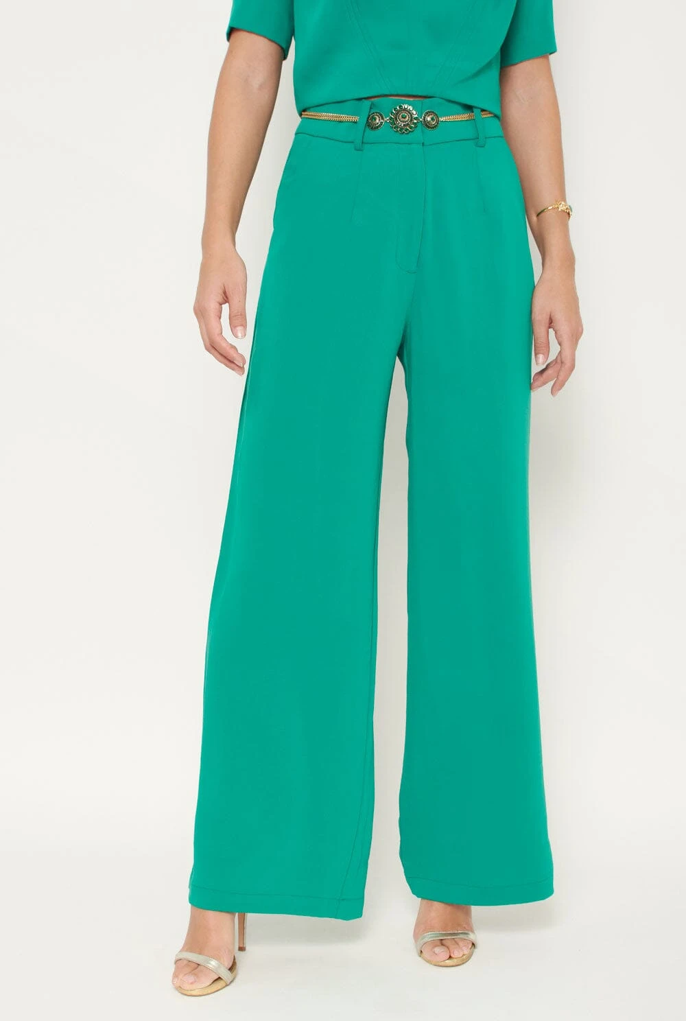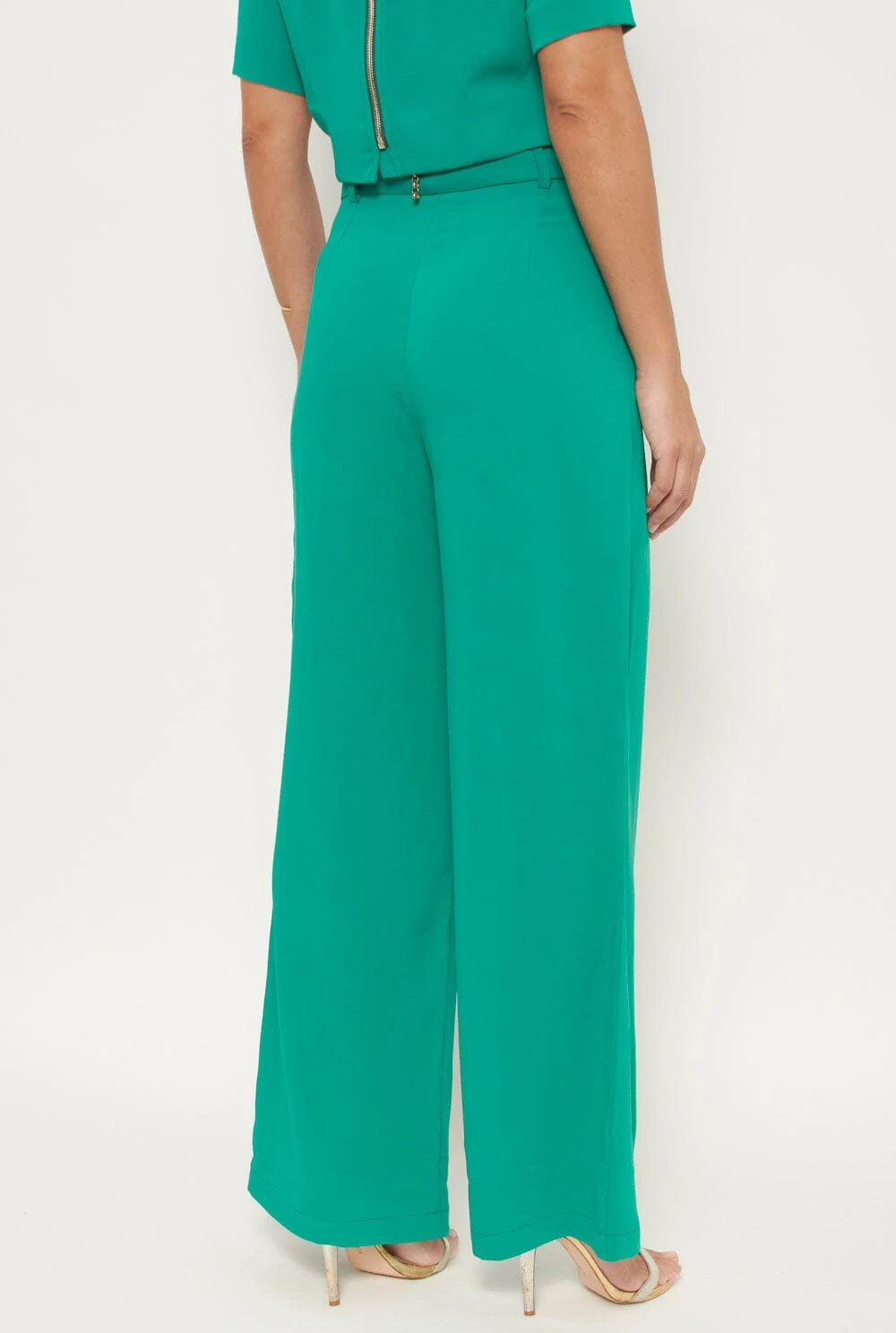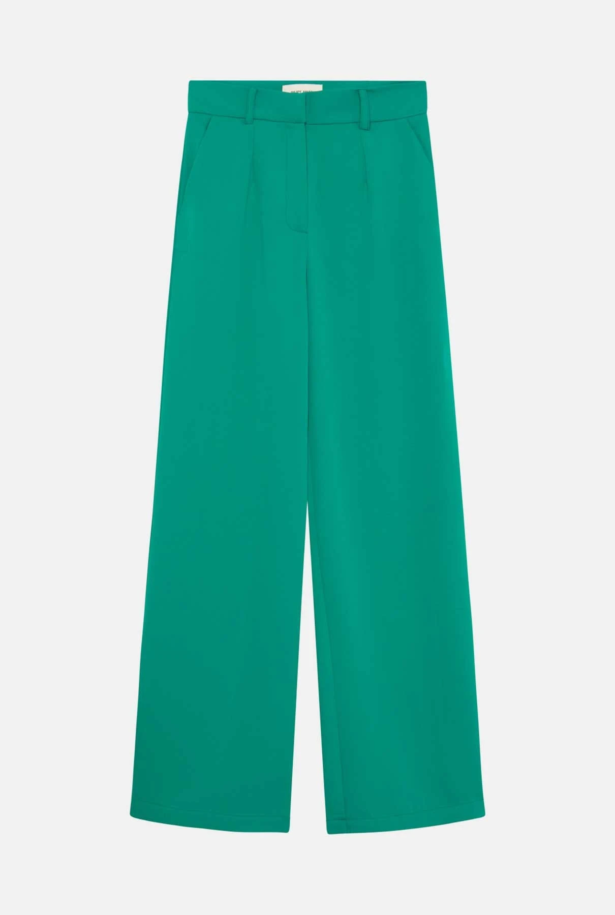 High-waisted, wide-leg trousers in green. With pockets and belt loops. Front zip fastening with metal hook.