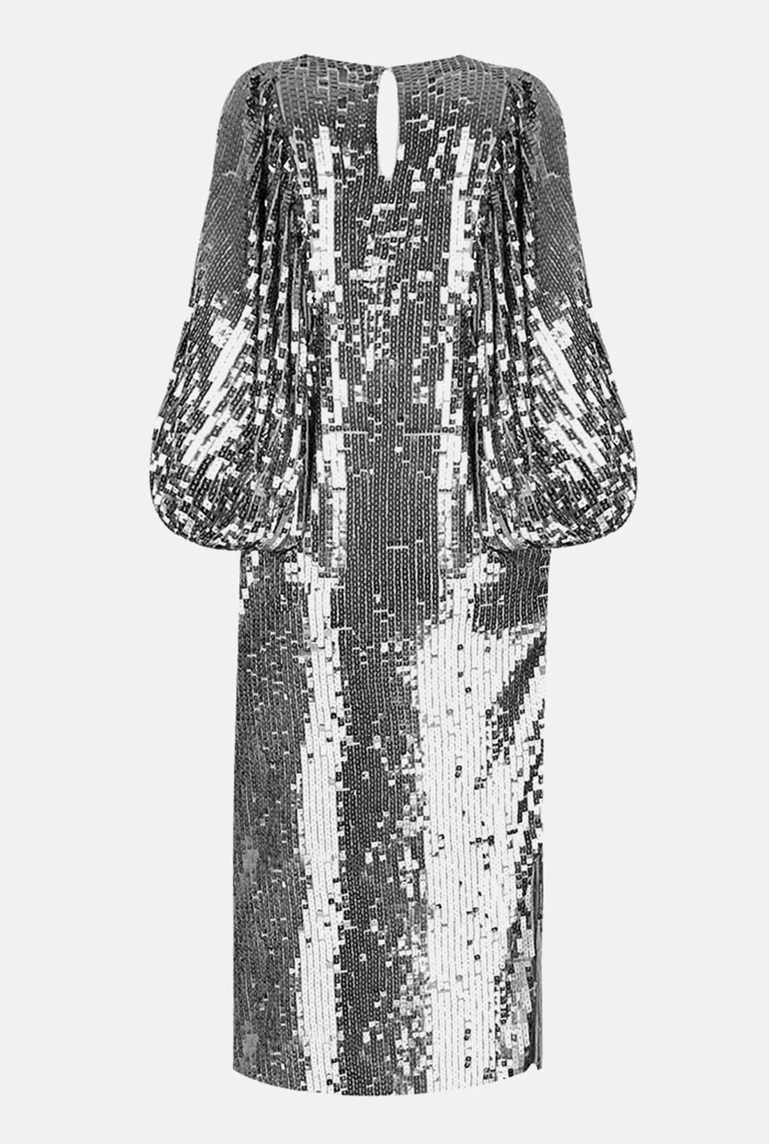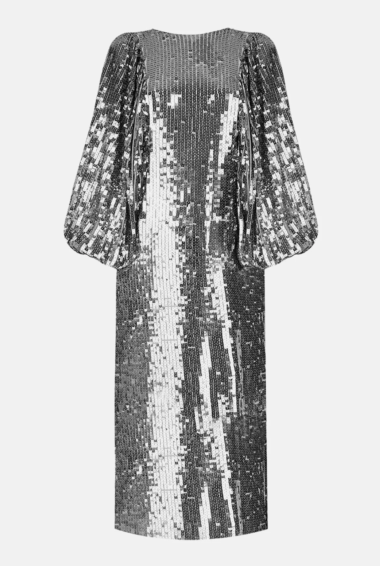 Party dress in silver sequin fabric. Puffed sleeves, round neckline and summary fastening at the back. It has a lining so that the sequin fabric does not rub against the skin.