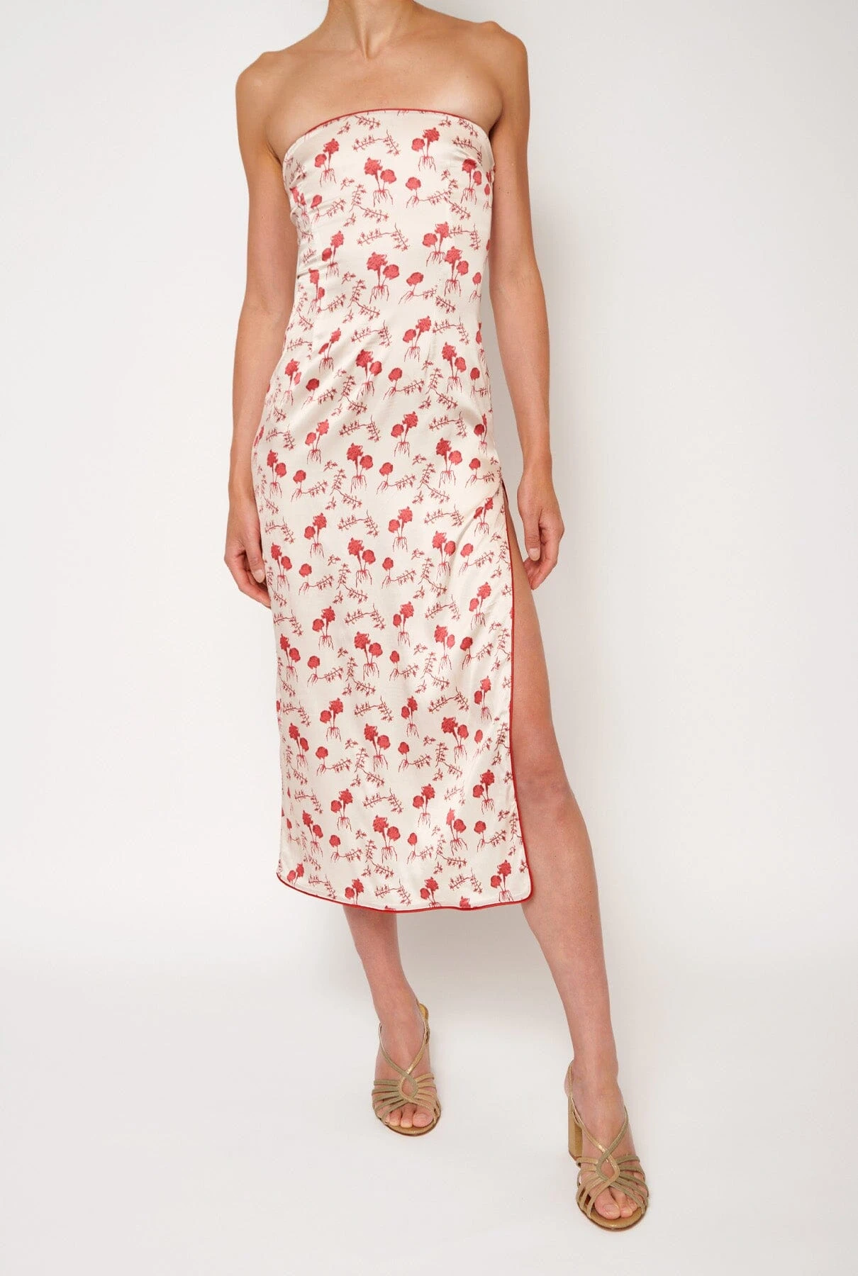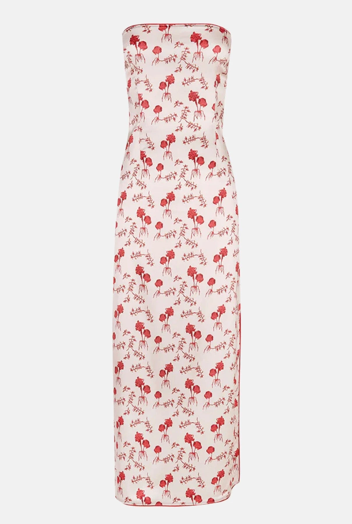 The strapless design adds a touch of elegance and sophistication to the ensemble, while the midi length provides a sense of refinement and grace. Whether you’re attending a formal event or a casual outing, the Alma dress is the epitome of chic style and effortless glamour.