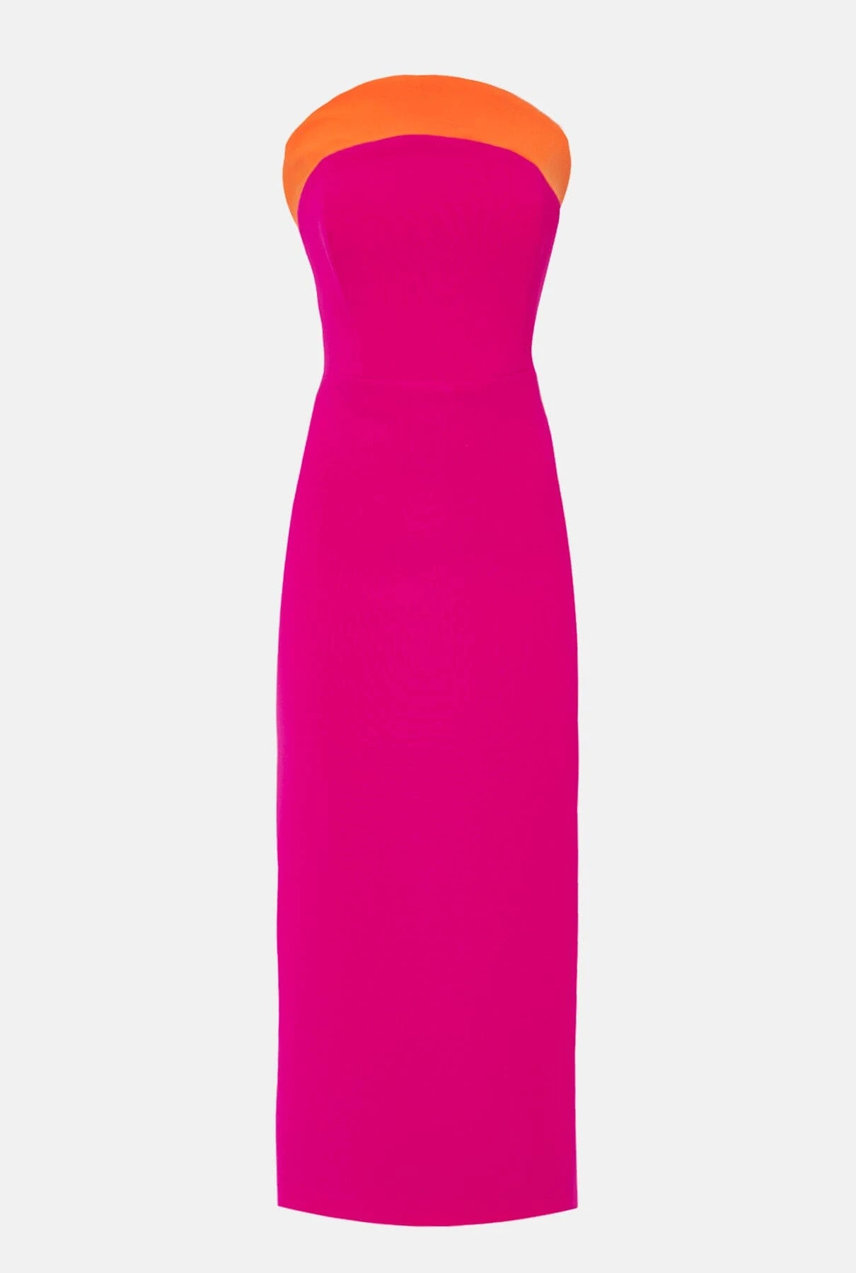 Two-tone midi dress, with asymmetrical strapless neckline. Skirt back opening, lining and zip at the back. Available in three colours. Made in Spain.