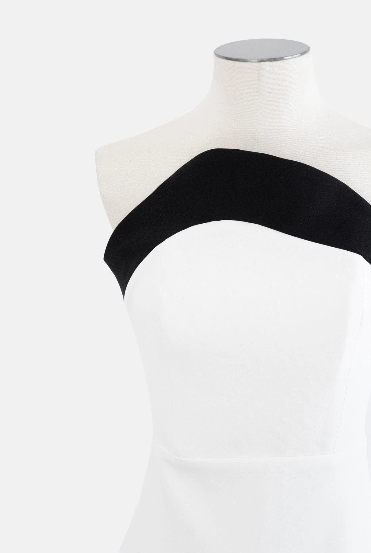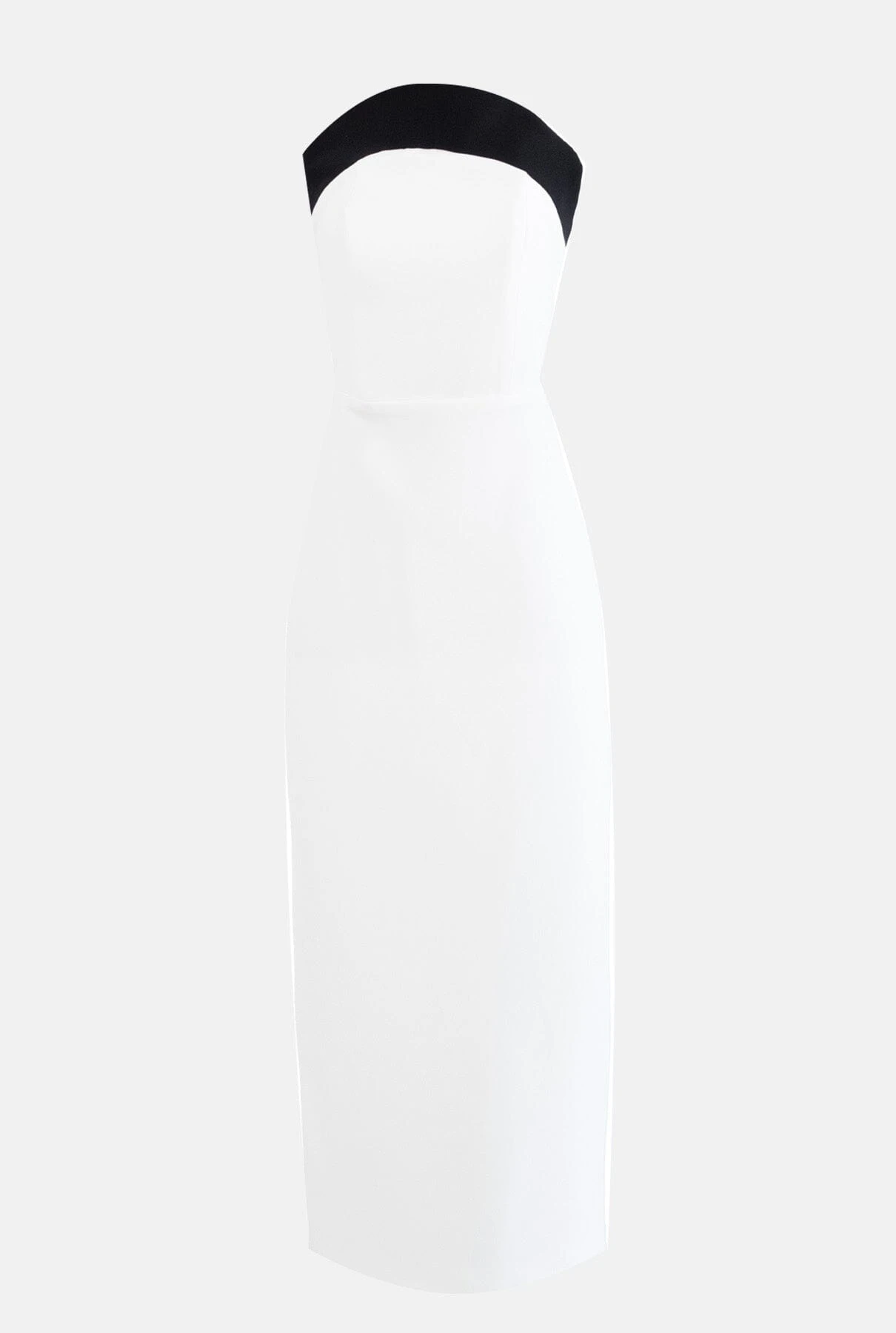 Two-tone midi dress, with asymmetrical strapless neckline. Skirt back opening, lining and zip at the back. Available in three colours. Made in Spain.