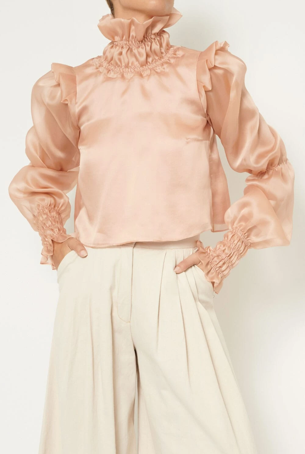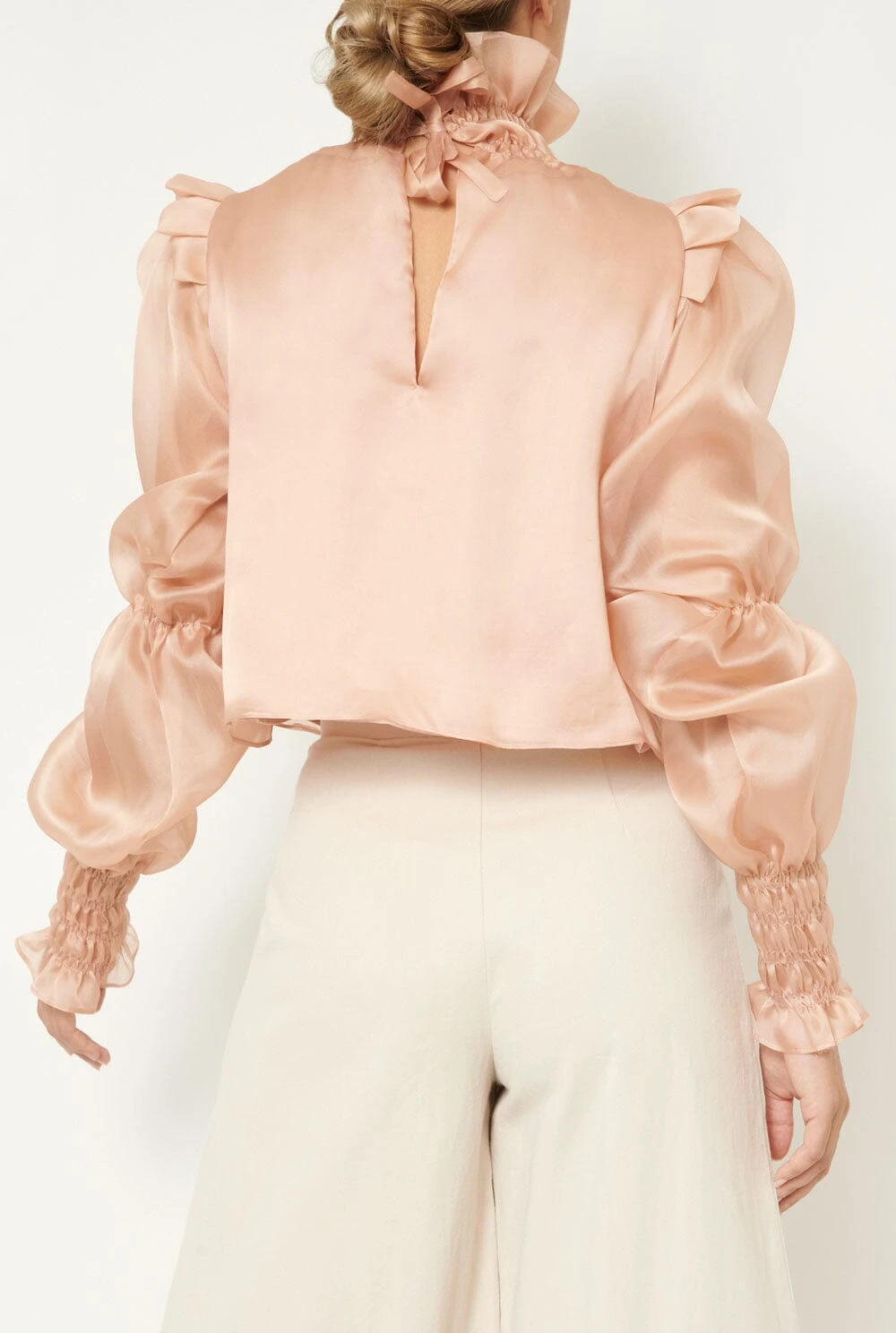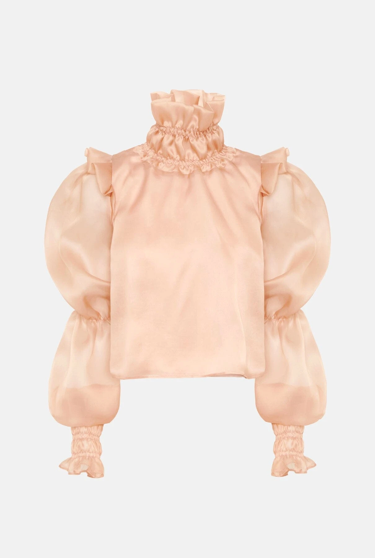 Silk organza blouse with romantic sleeves. Straight and short pattern. Ruffle detail on the neck and sleeves.