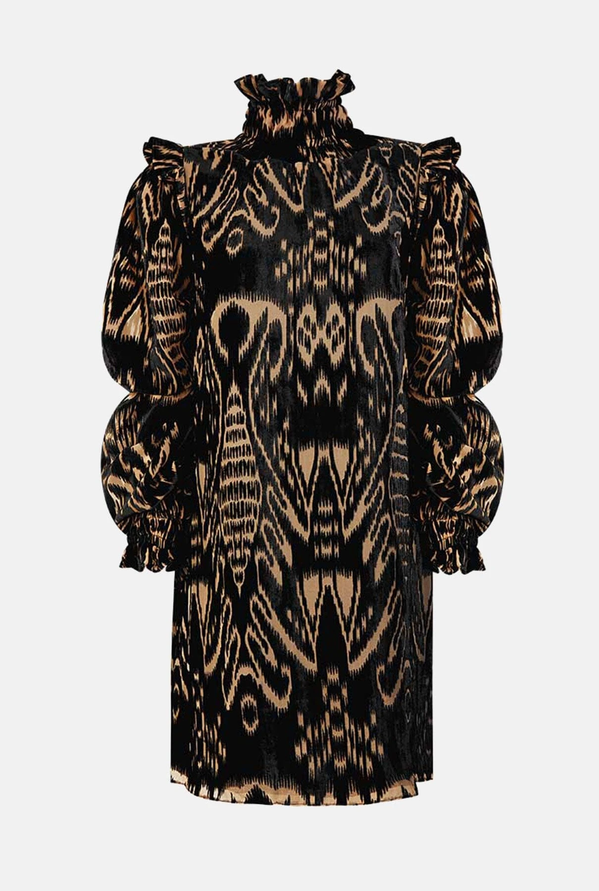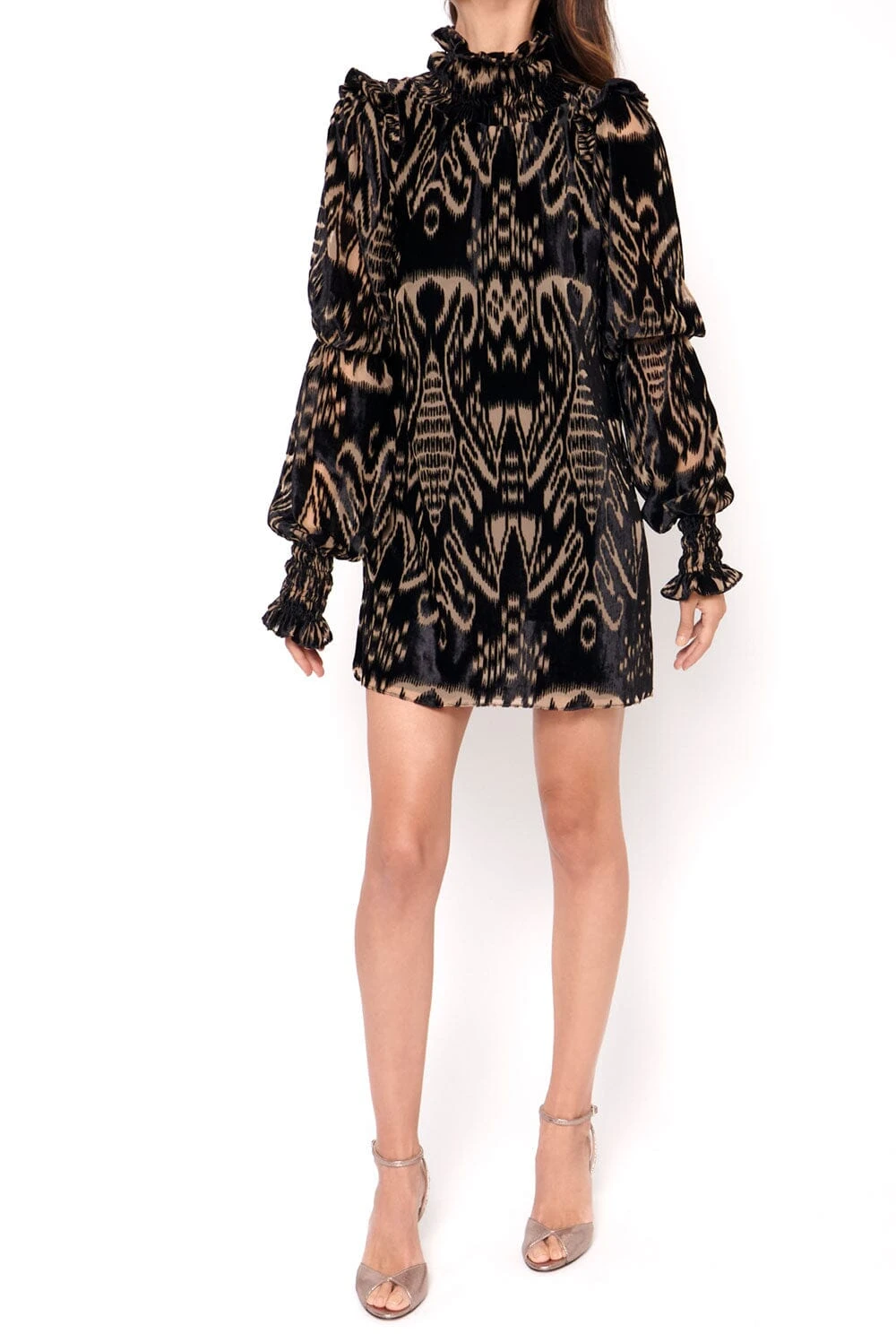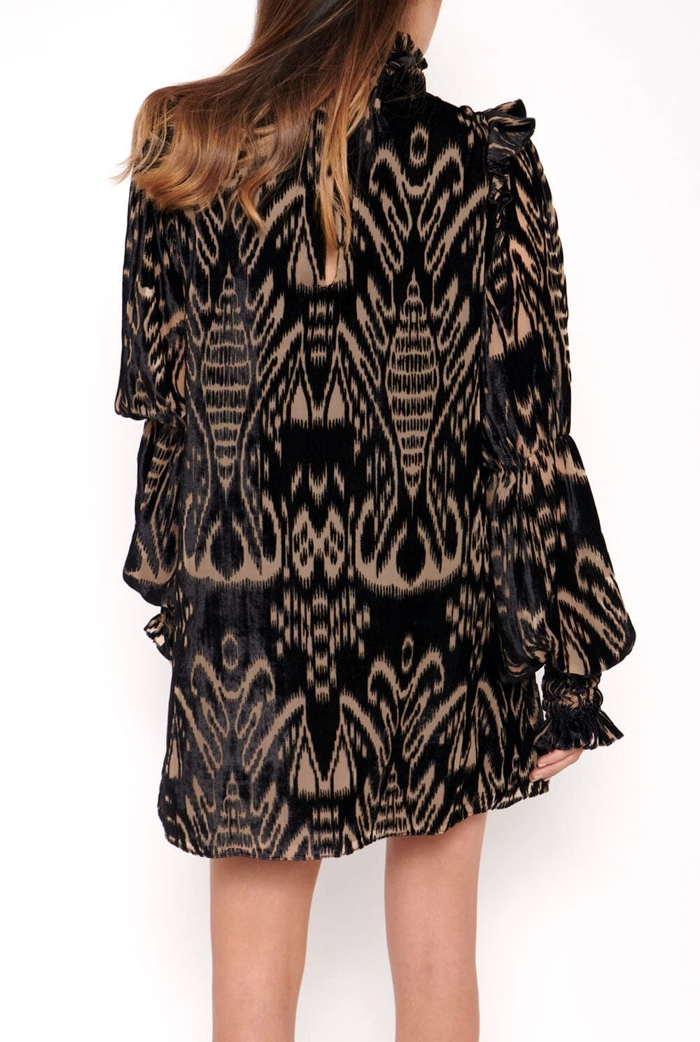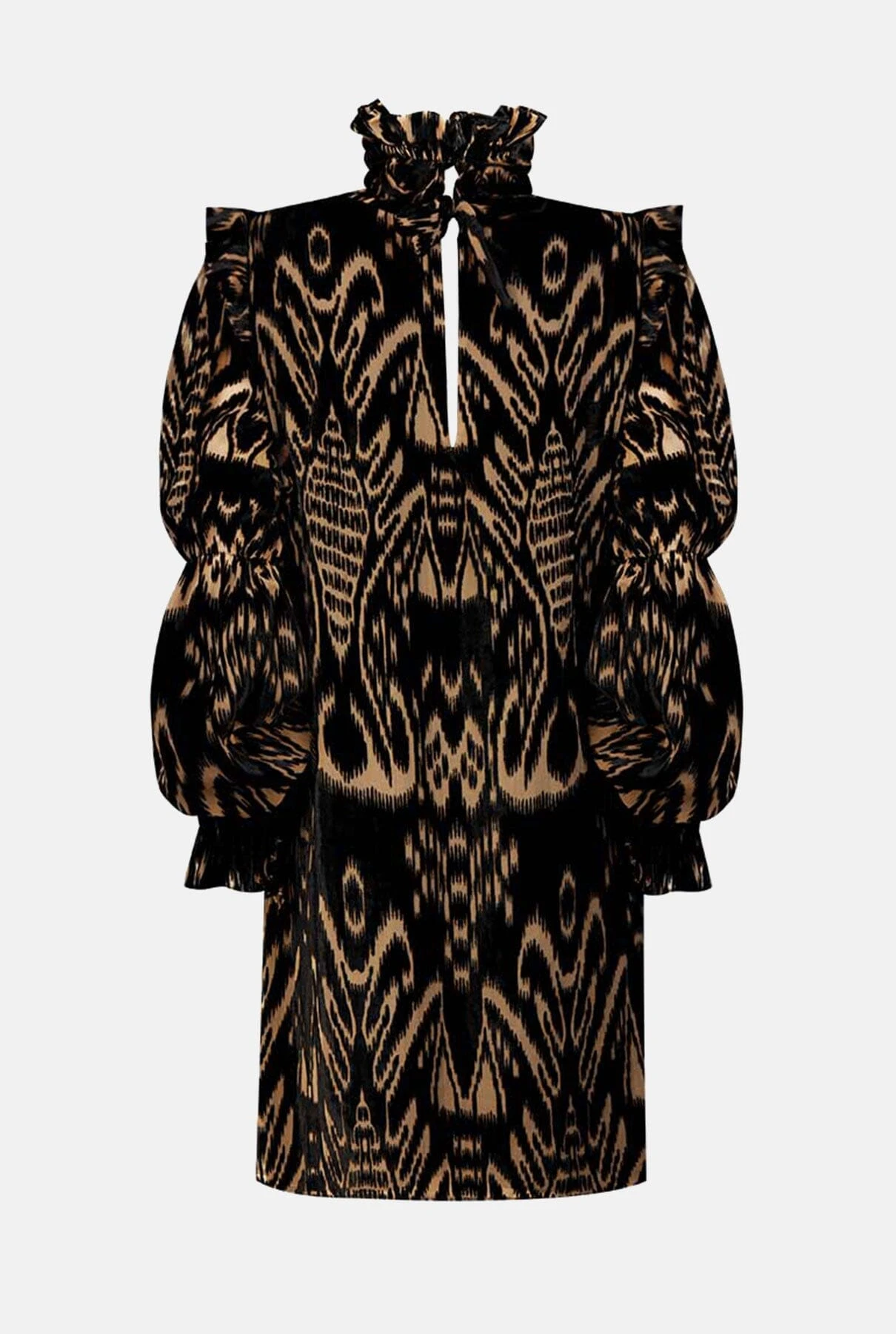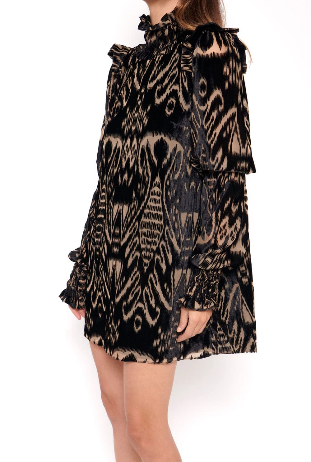 Velvet dress in jacquard fabric with abstract pattern. Mini length and straight silhouette. High neckline with ruffle detail and cuff. Sleeves decorated with a ruffle at the top.
