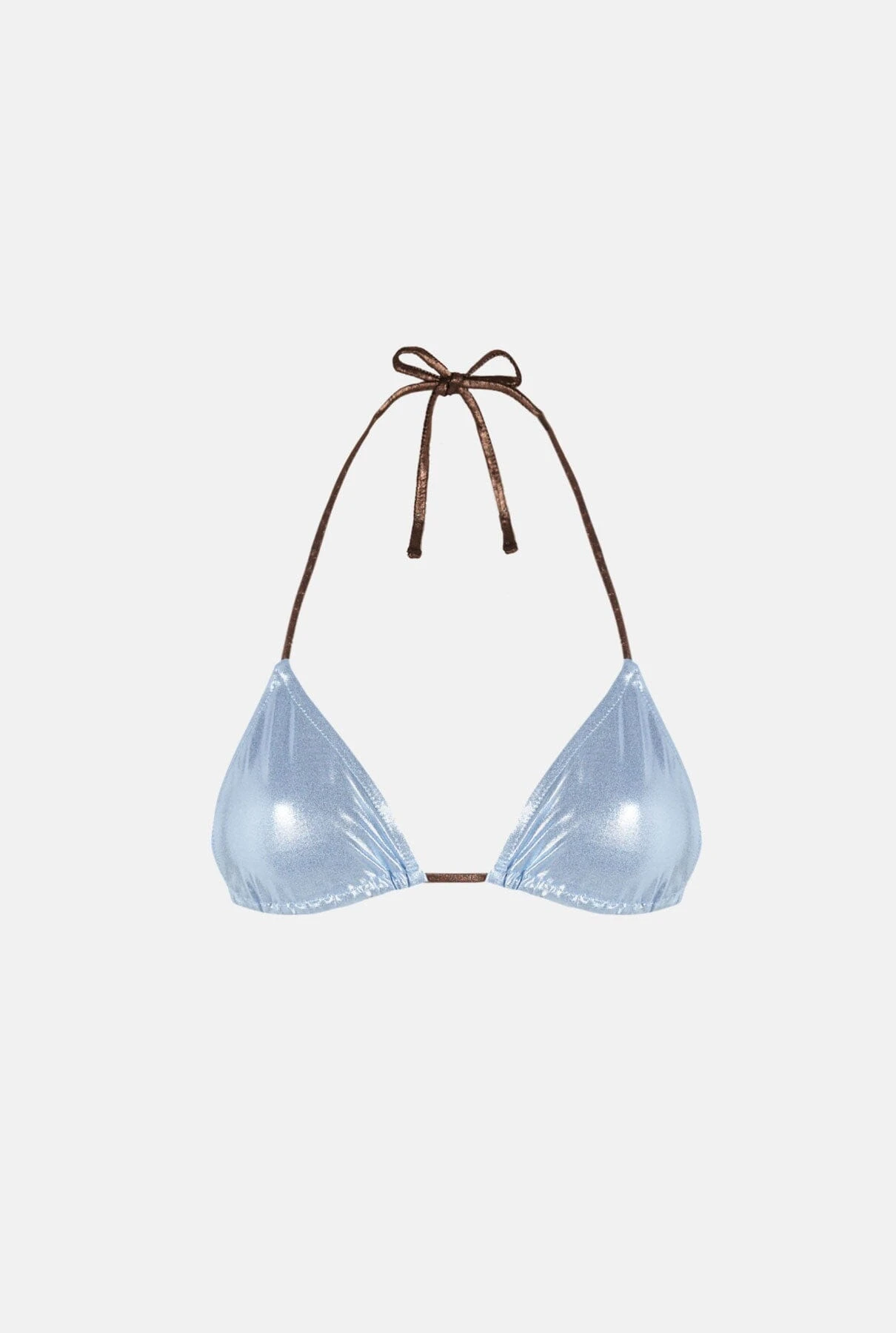 Triangle bikini top in metallic blue with brown adjustable straps.