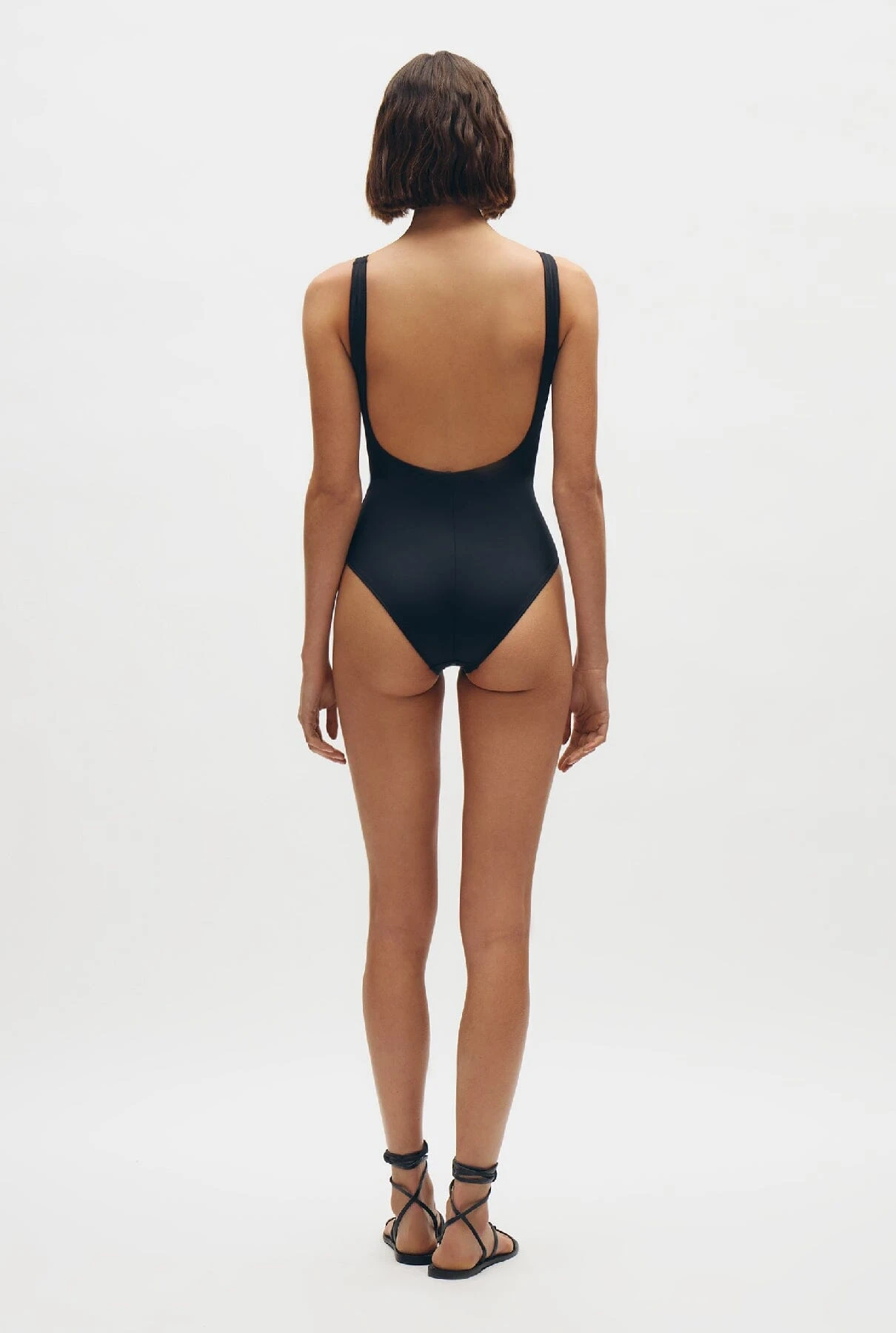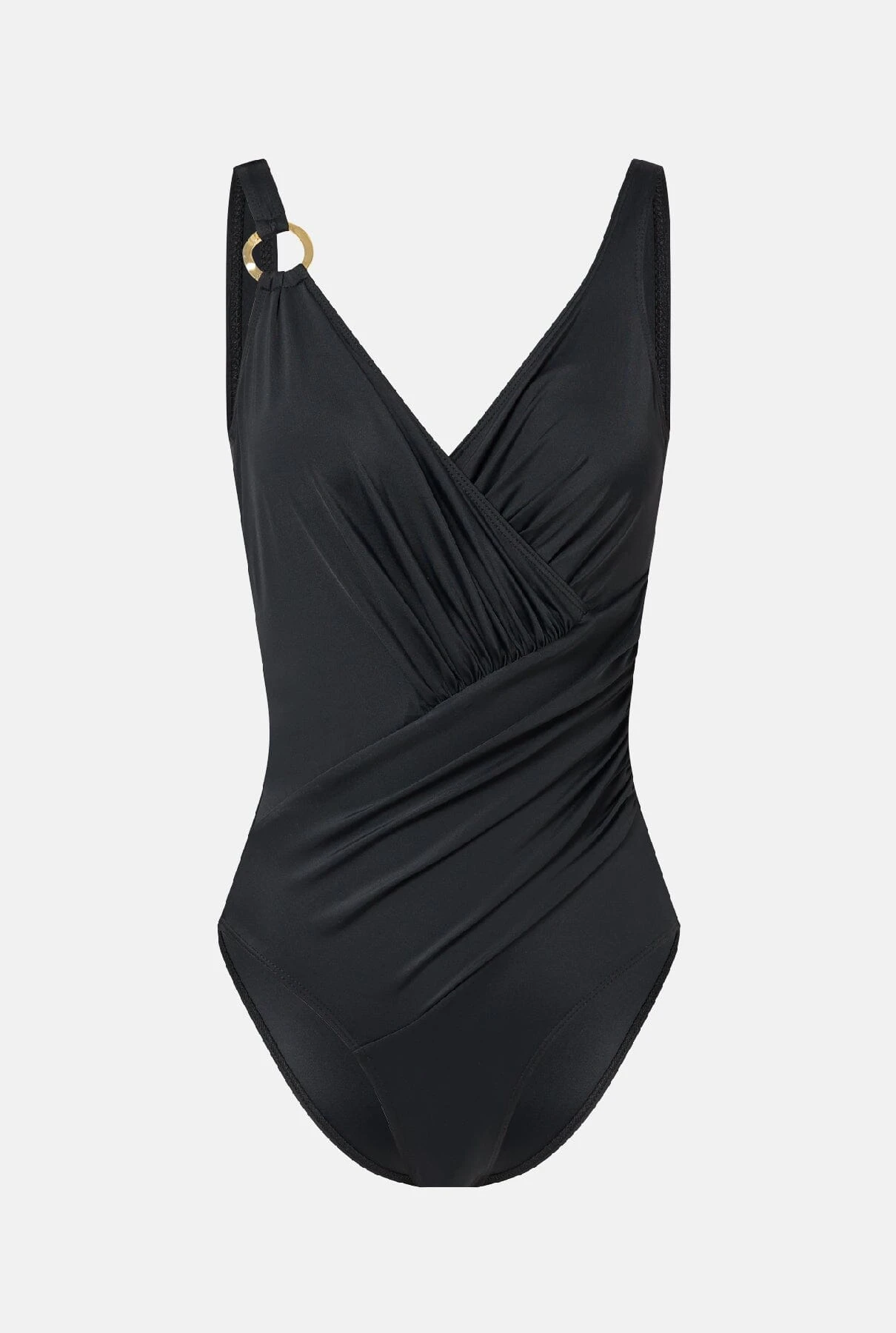 Draped swimsuit, V neckline, shiny fabric with removable foam.