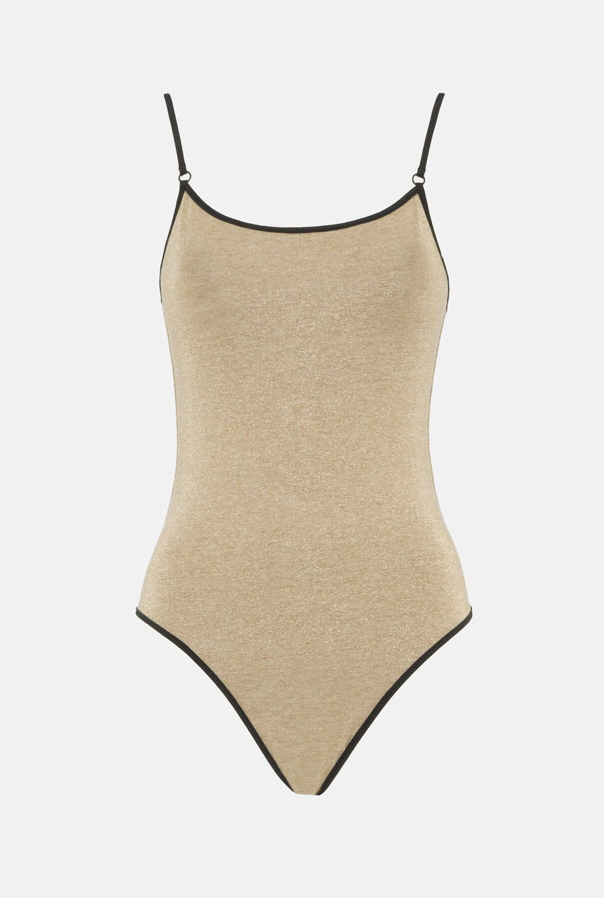 Lightweight swimming costume in gold lurex and black trim. Very thin straps and very comfortable and flattering design that adapts to the silhouette. A must-have in your summer wardrobe. Designed by Wapa Swimwear.