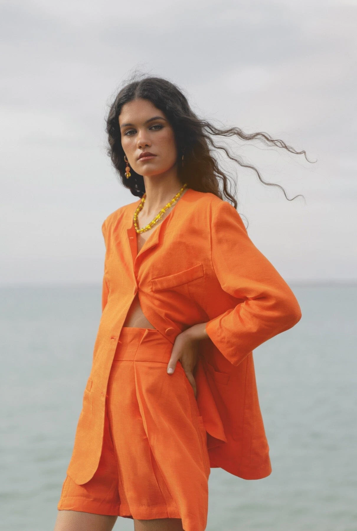 Bermuda de cintura alta confeccionada en tejido de lino en color naranja. Cintura con pliegues, frunces centrales que estilizan la figura y corte recto. Lleva cremallera central y bolsillos traseros.