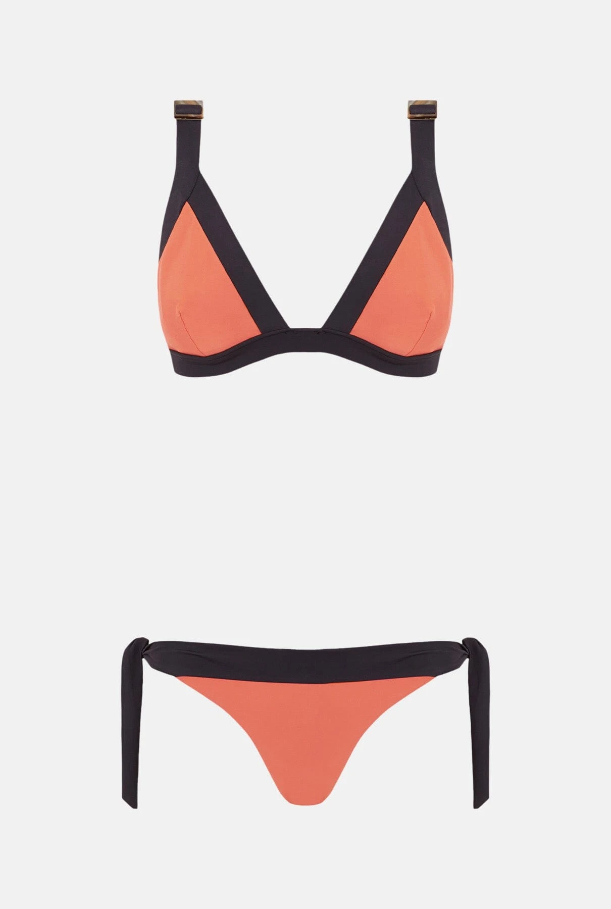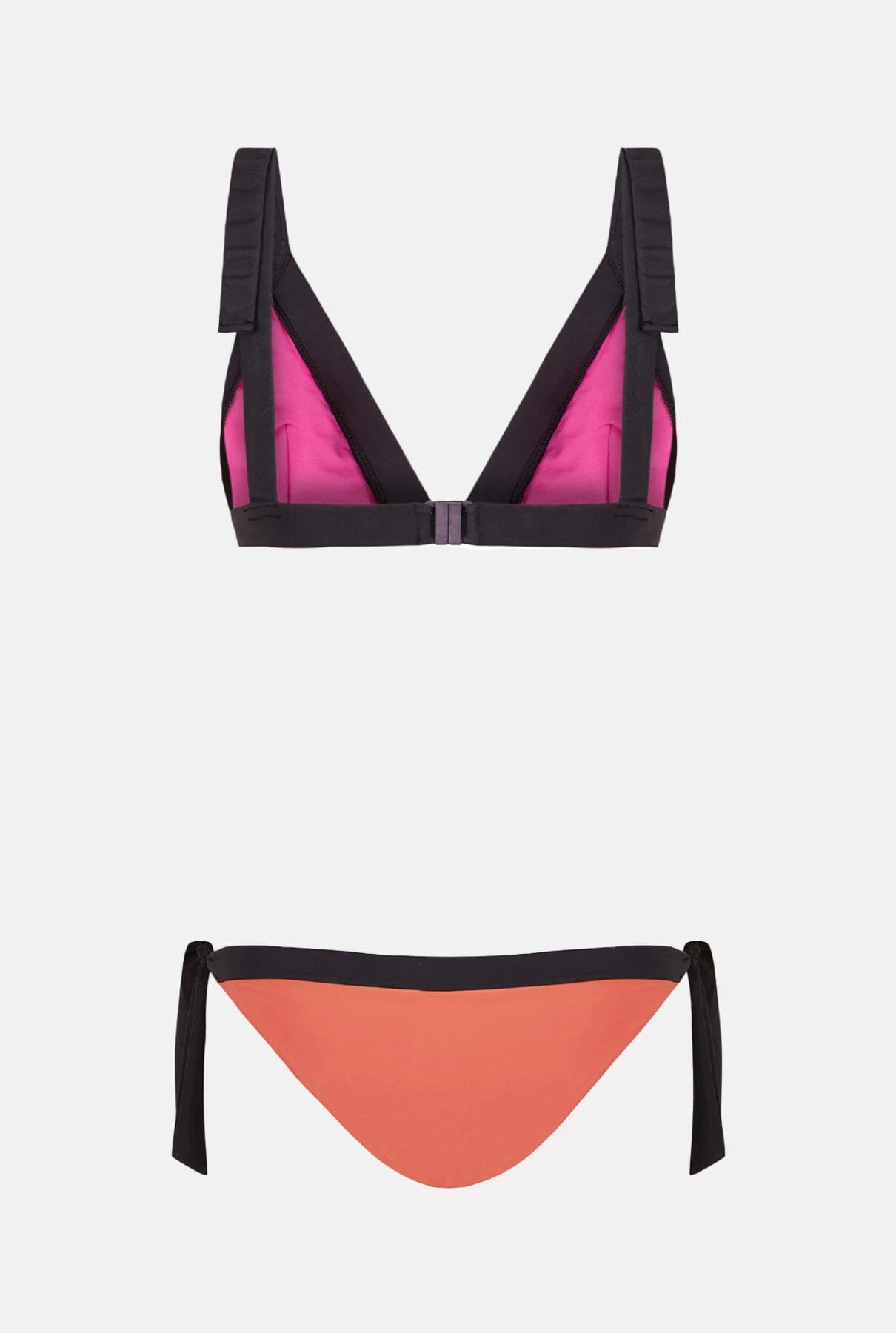 Orange bikini bottom with side tie closure that allows for adjustable fit for women looking for a smaller panty option. Features a purple lining that offers great comfort and versatility.
