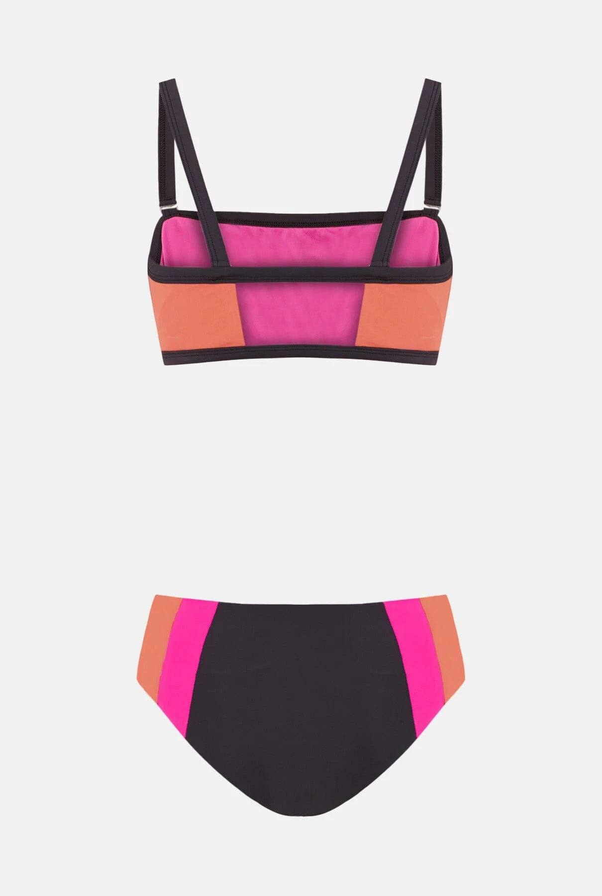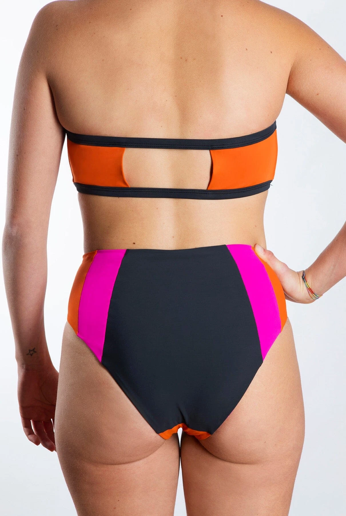 Retro orange tricolor bikini bottom designed to enhance your figure with a modern and flattering style. This versatile piece allows you to easily combine it with different bikini tops to create unique looks. Made with a soft purple lining, this piece is not only stylish, but also comfortable. It fits your body flawlessly, enhancing your curves with style and sophistication.