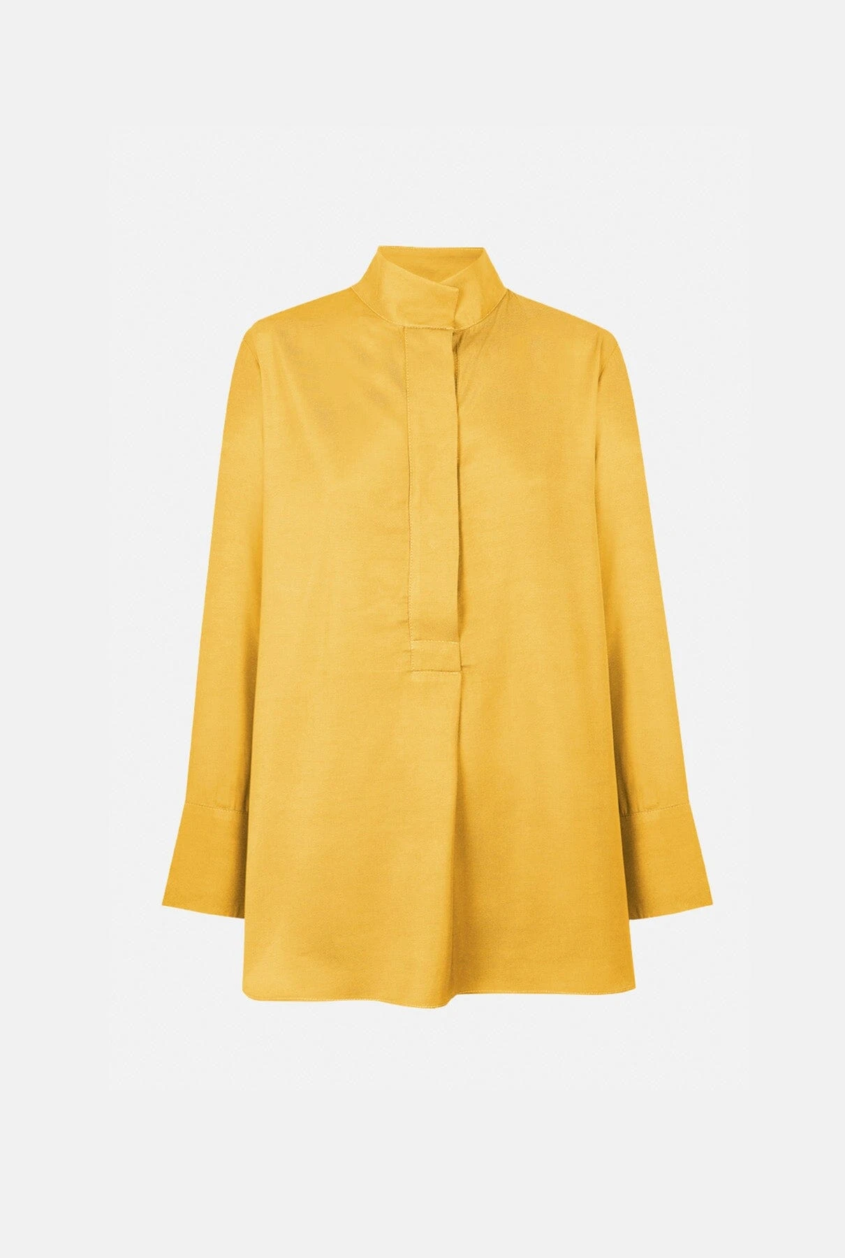 Oversized blouse with wide placket and stand-up collar, wide cuffs, can be folded or loose. You have the option of wearing the neckline very deep or summaryed. It looks especially nice oversized because the fabric has a lot of drape and movement.