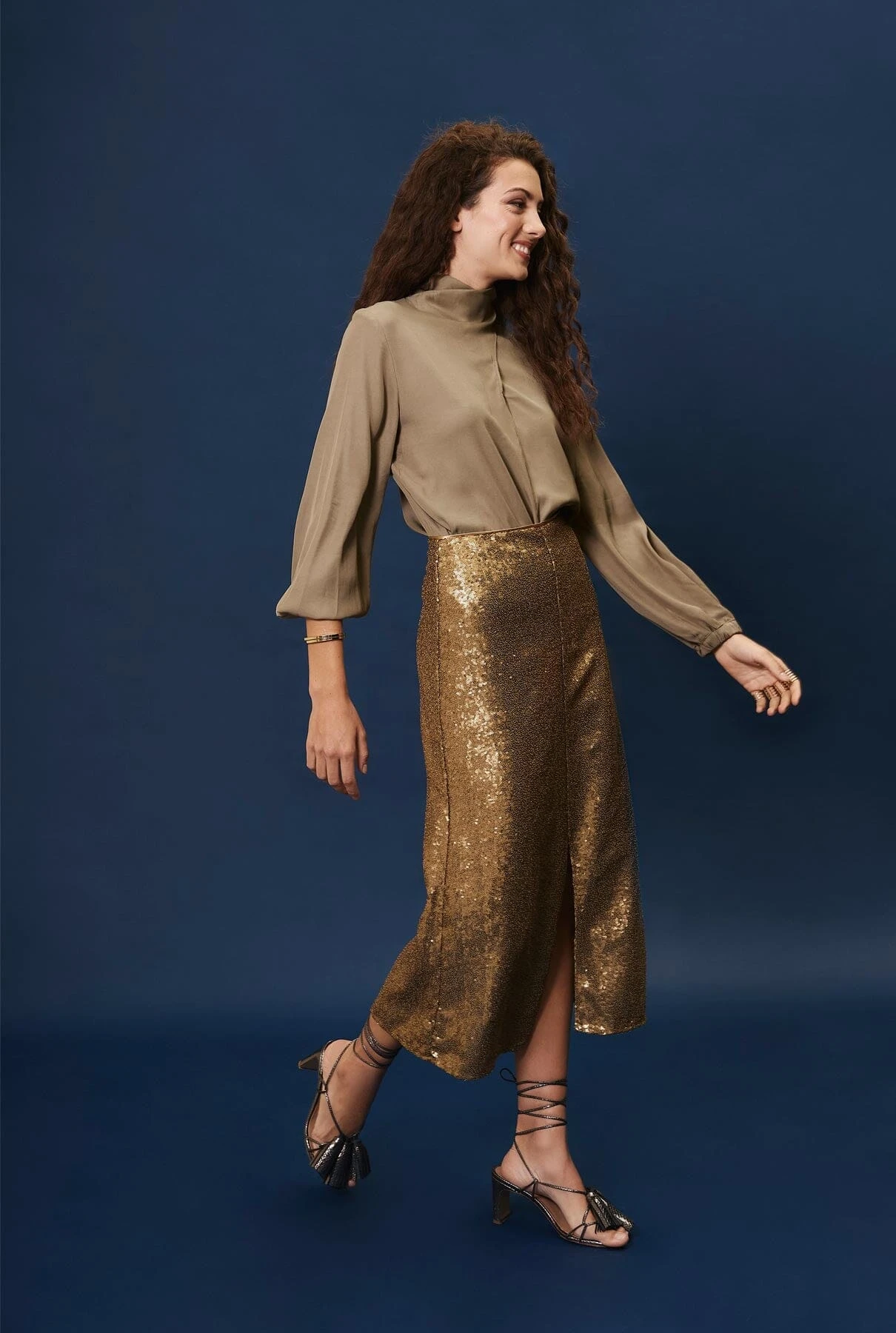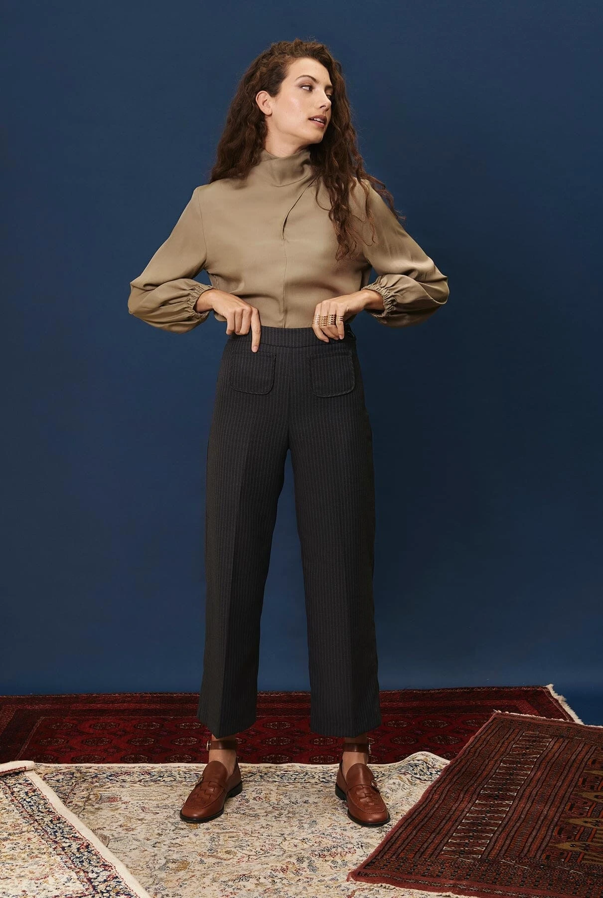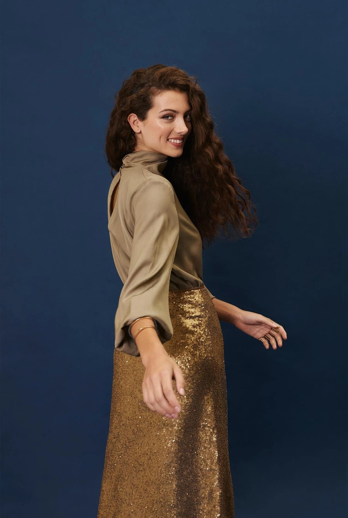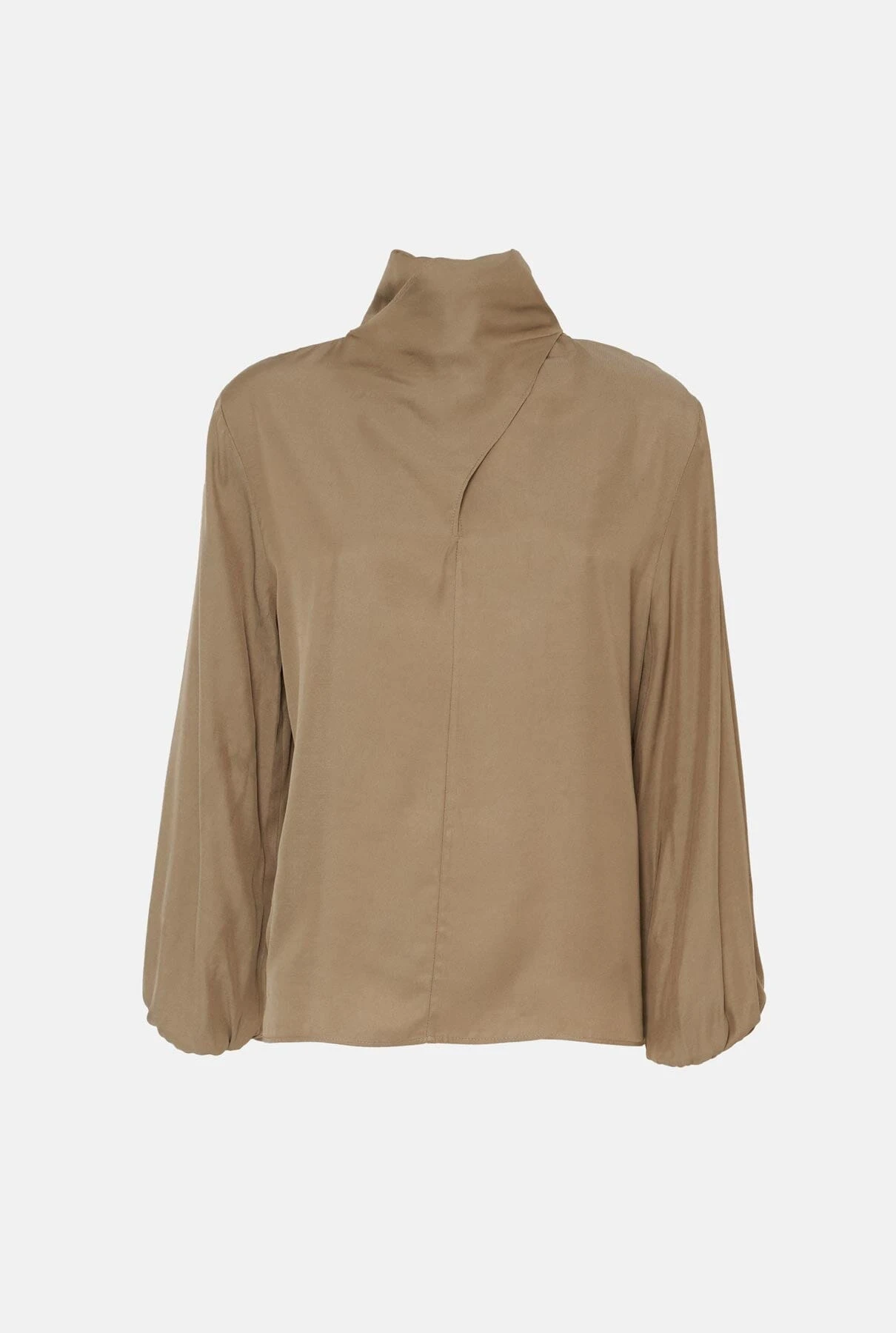 Crossed neckline blouse with a raised collar. It has a puffed sleeve that closes with elastic so you can adjust the height at which to wear it. It is summaryed in the centre back with two summarys where it has pleats. It is made from a flowing fabric.