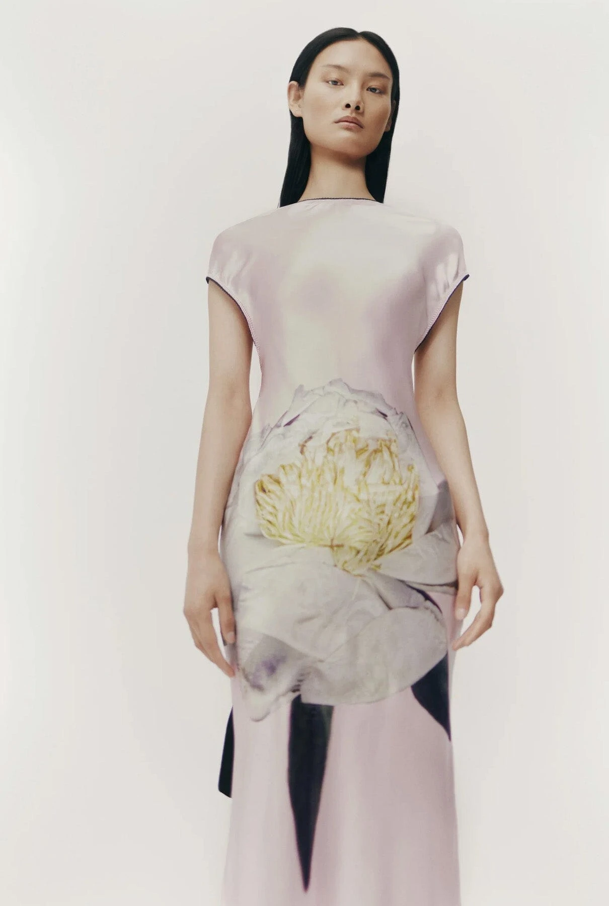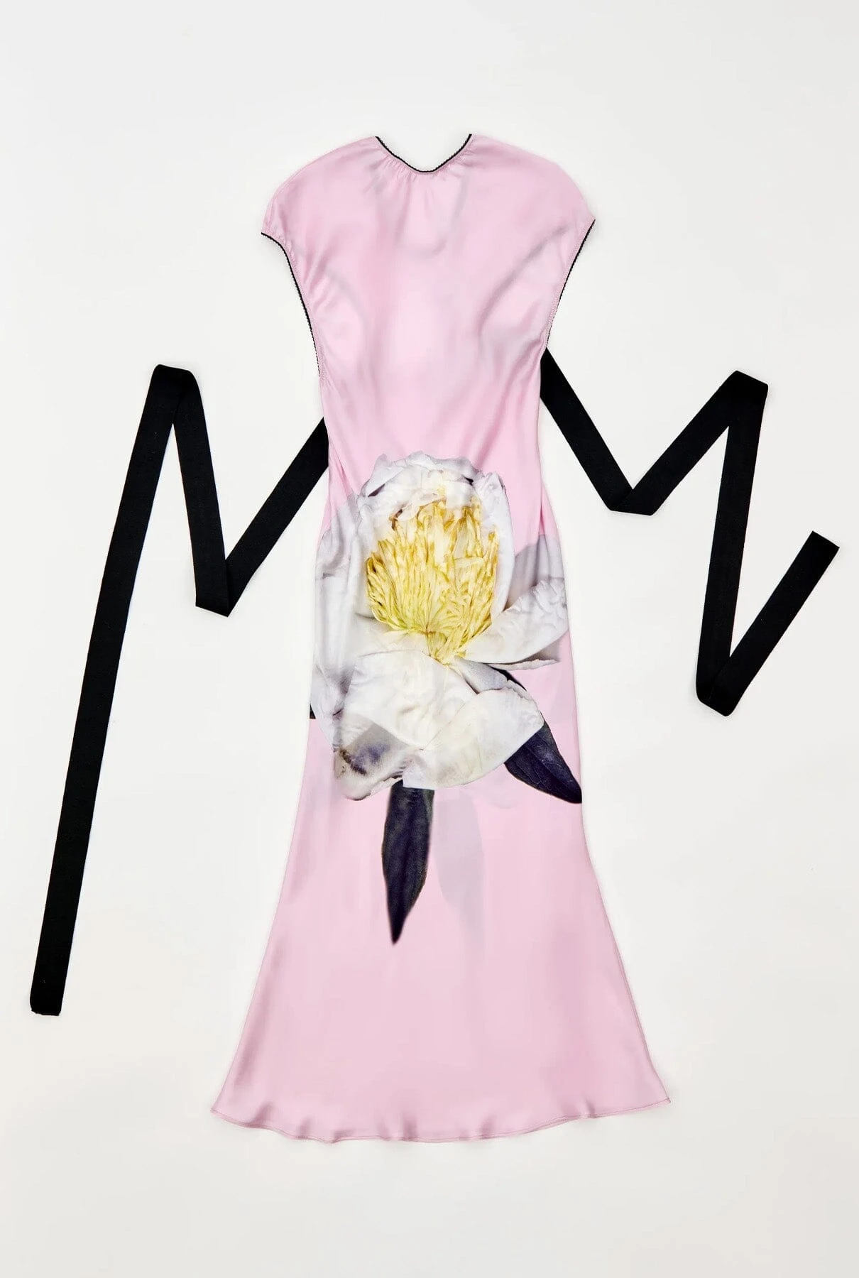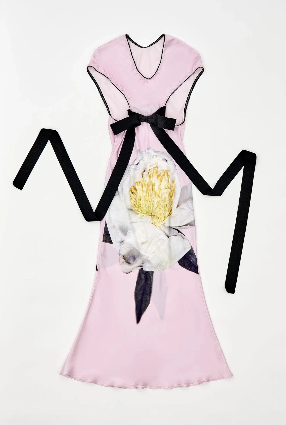 Midi length lingerie dress with large low-cut armholes on the side and back, all the edges of the neckline are finished with elastic lingerie elastic bands slightly gathering the fabric. the back is decorated with a removable contrasting grosgrain ribbon bow.