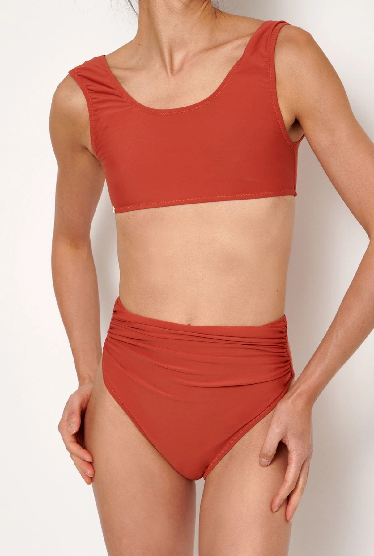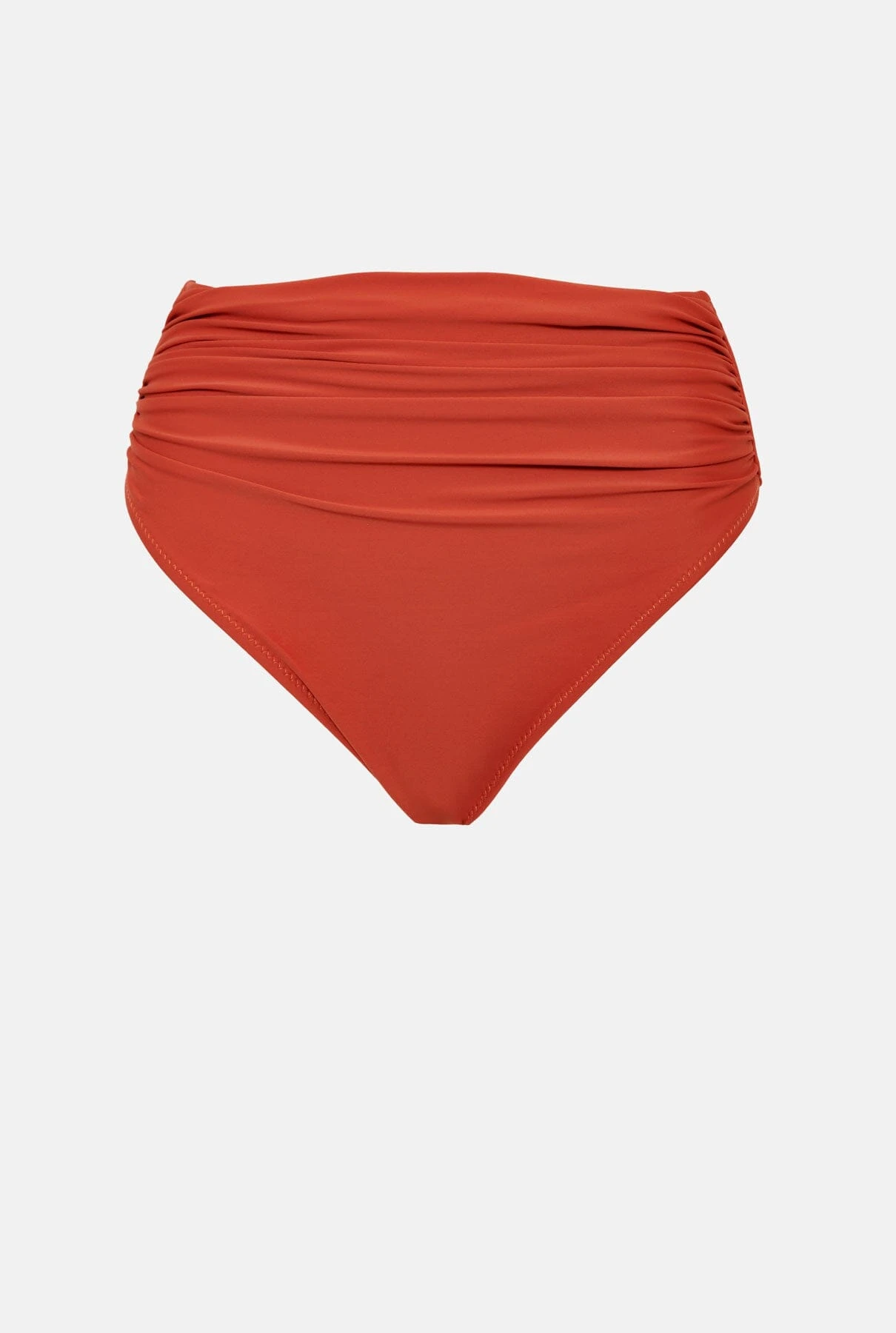 High-waisted panty. The leg is slightly raised and pleated on the sides making a gathering in the central area of the panty, reducing effect. This gathering conceals the tummy and is very flattering. By having the leg slightly raised, it slims and lengthens the leg. It is undoubtedly a spectacular panty.