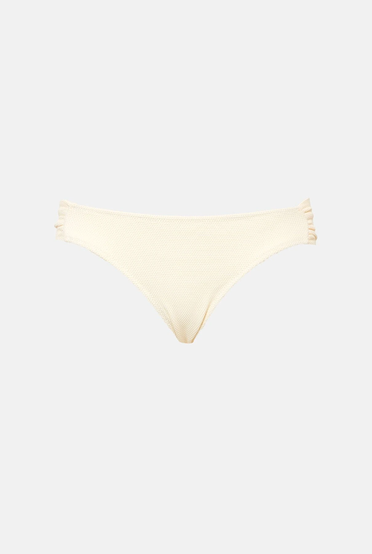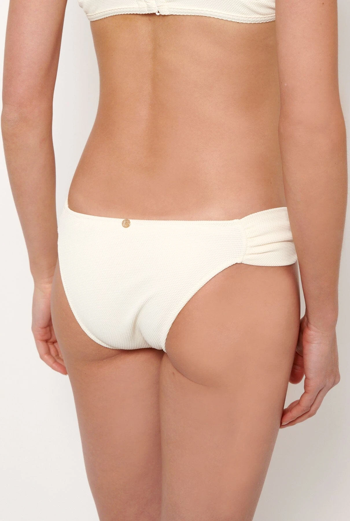 Hip panty with twisted and pleated sides. High-cut and low-cut leg. This piece is lined with polyamide and elastane. It is quick-drying and soft to the touch.