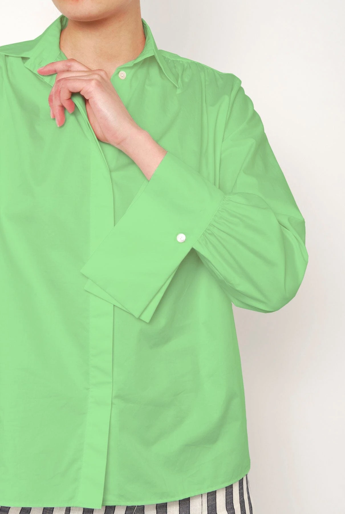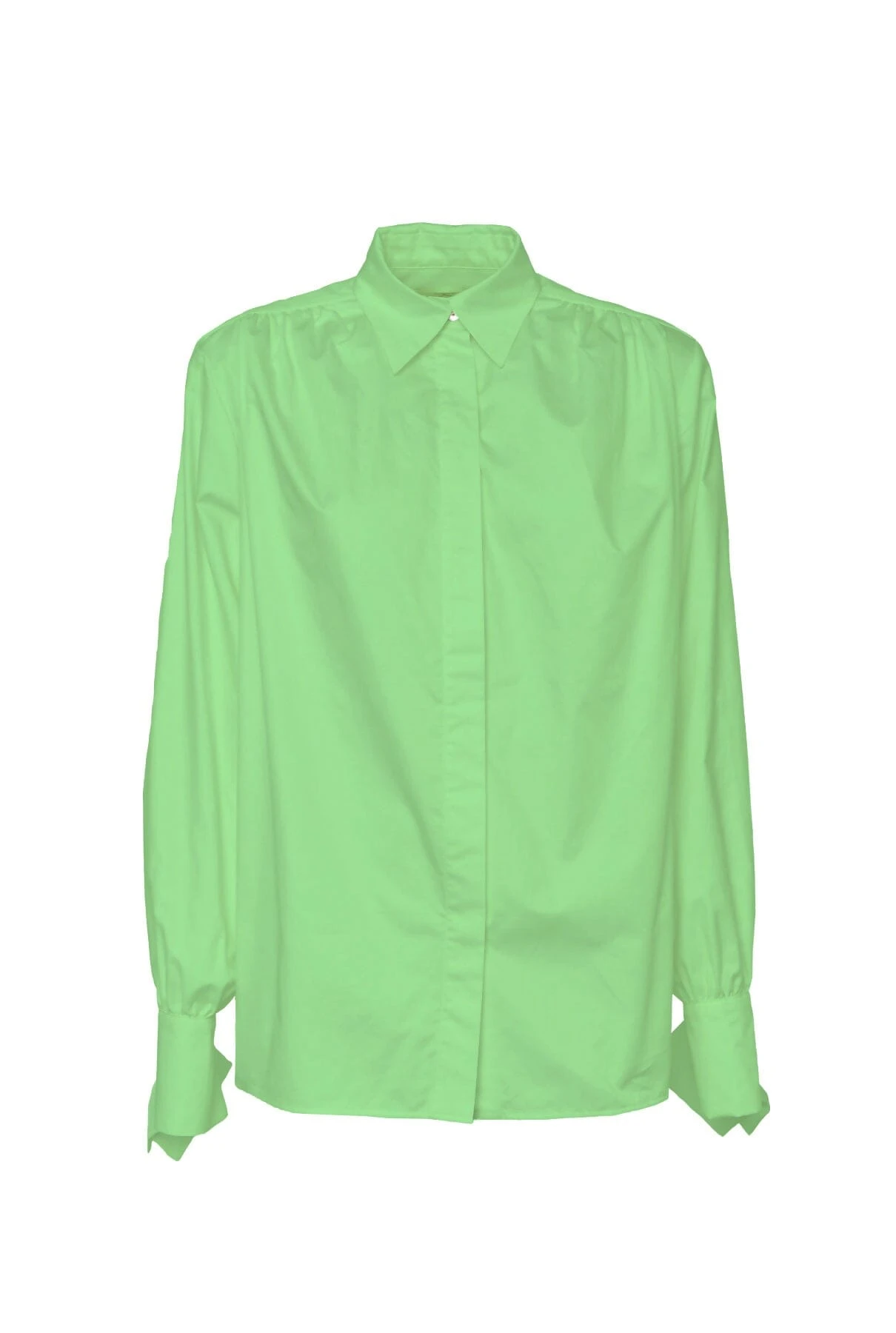 Long sleeve cotton poplin shirt with collar, gathers in the yoke and cuffs design.