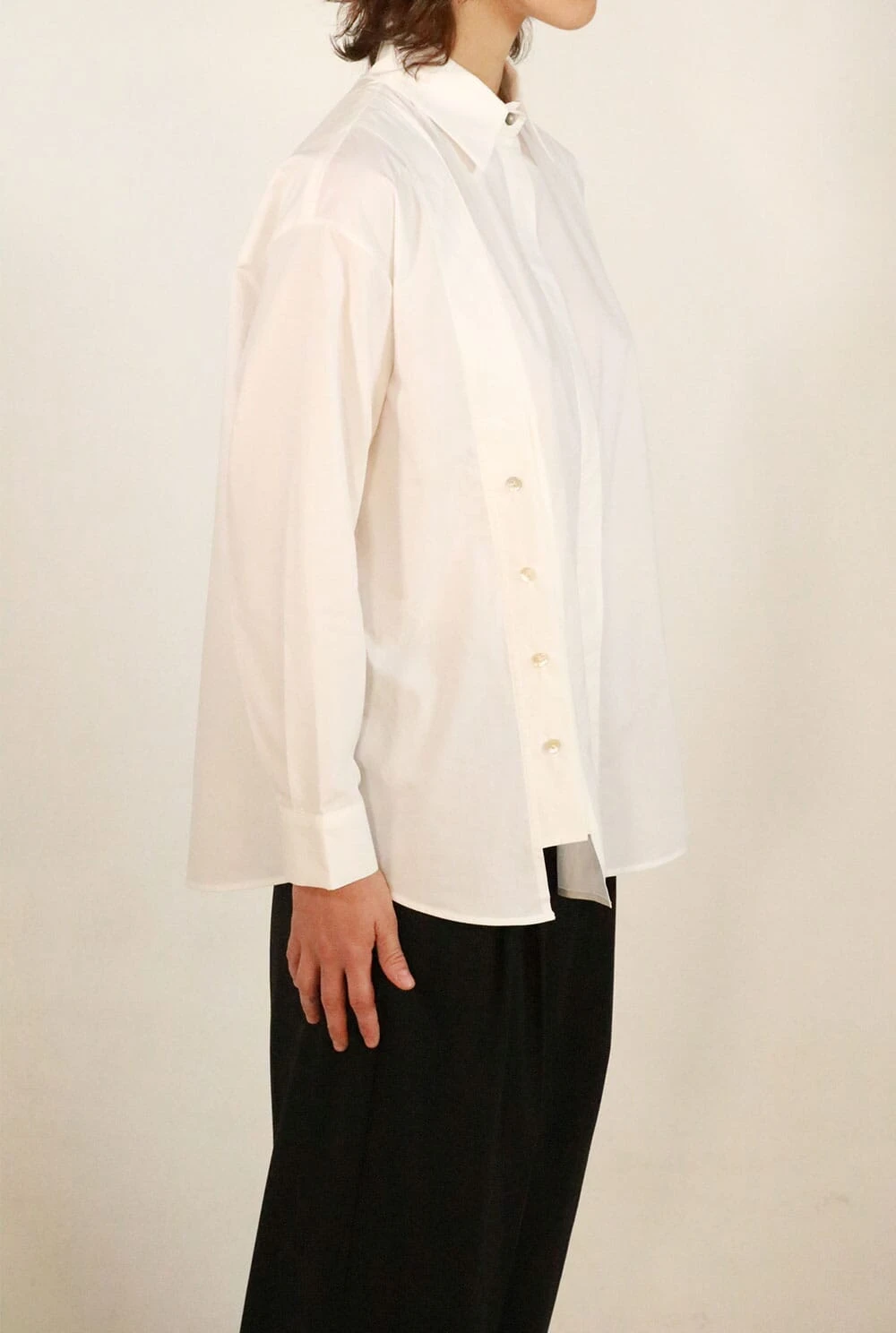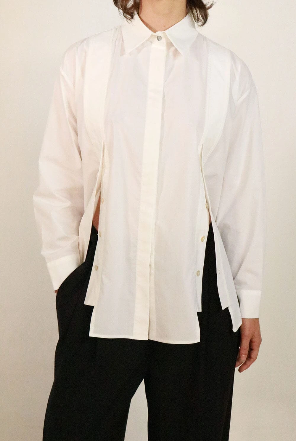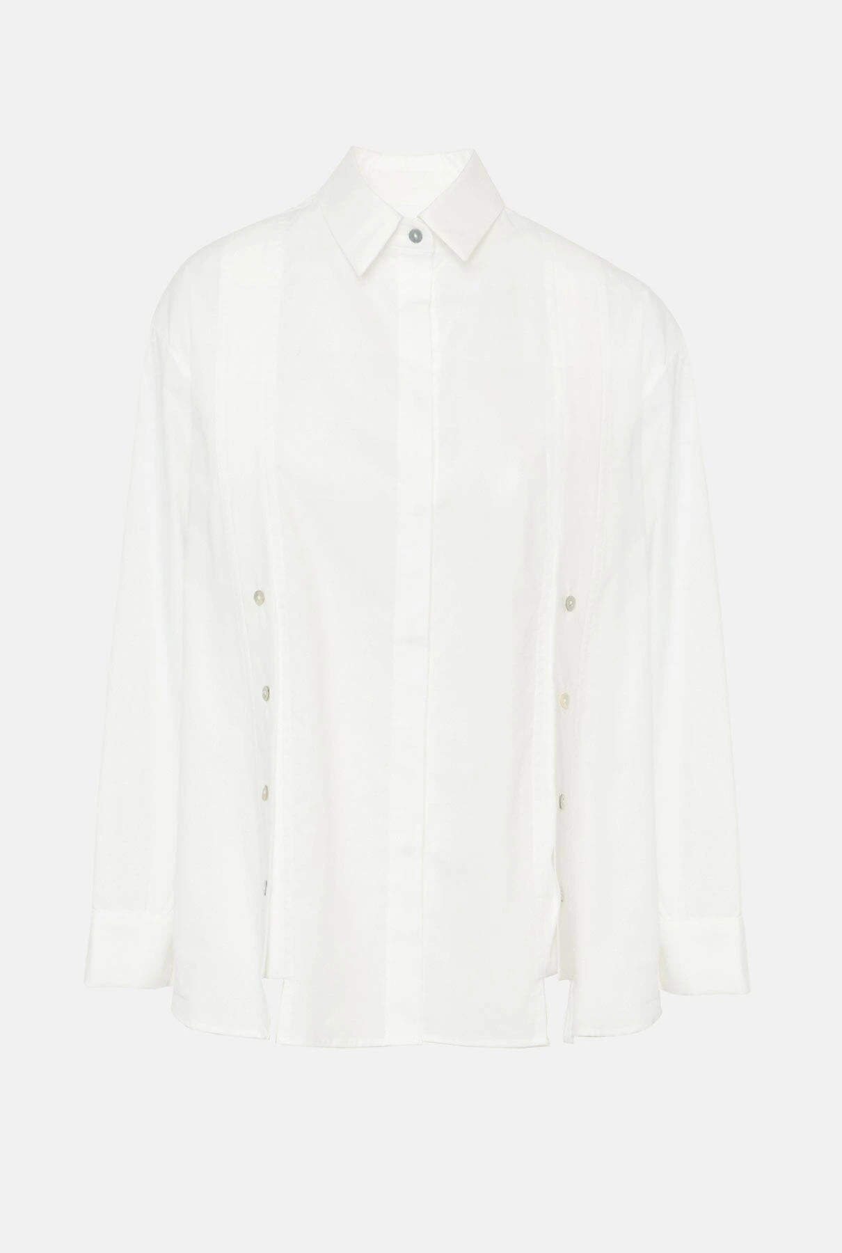 Classic white shirt with two side openings with 4 summarys each, which allow the shirt to be opened on both sides. The main closure is in the center with hidden summarys.The composition is Cotton, it is recommended to wash by hand, although it can also be washed in a washing machine on cotton programs. Do not use bleach, iron at low temperature, do not tumble dry.