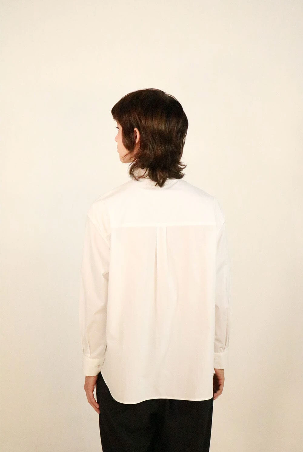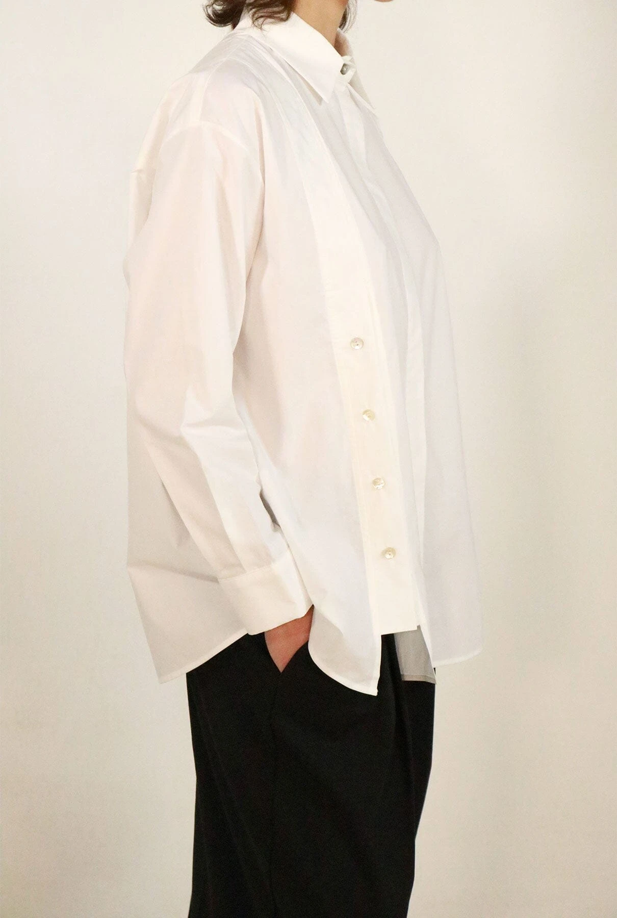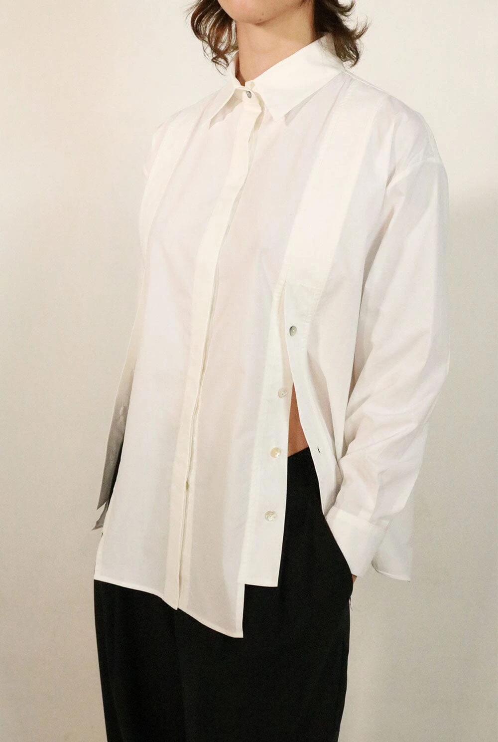 Classic white shirt with two side openings with 4 summarys each, which allow the shirt to be opened on both sides. The main closure is in the center with hidden summarys.The composition is Cotton, it is recommended to wash by hand, although it can also be washed in a washing machine on cotton programs. Do not use bleach, iron at low temperature, do not tumble dry.