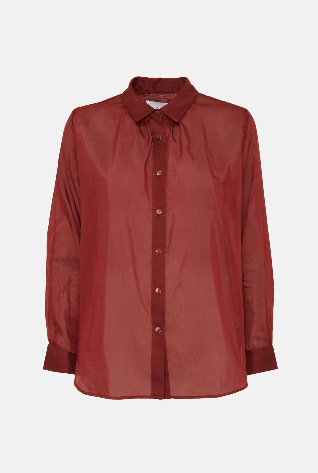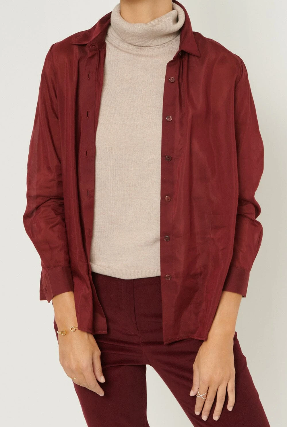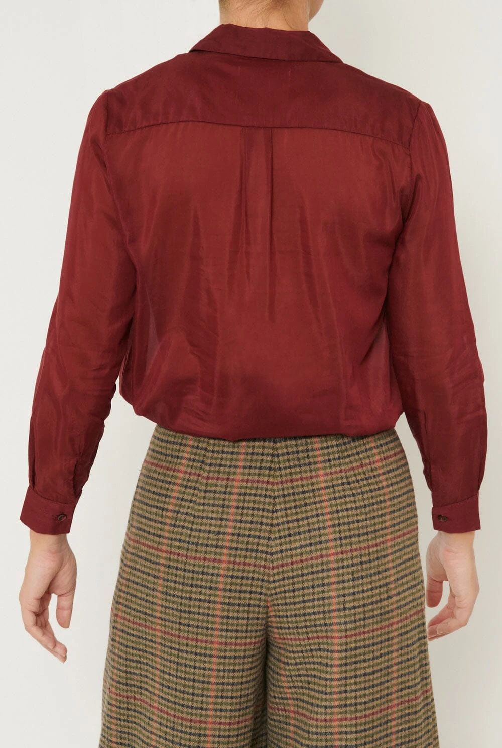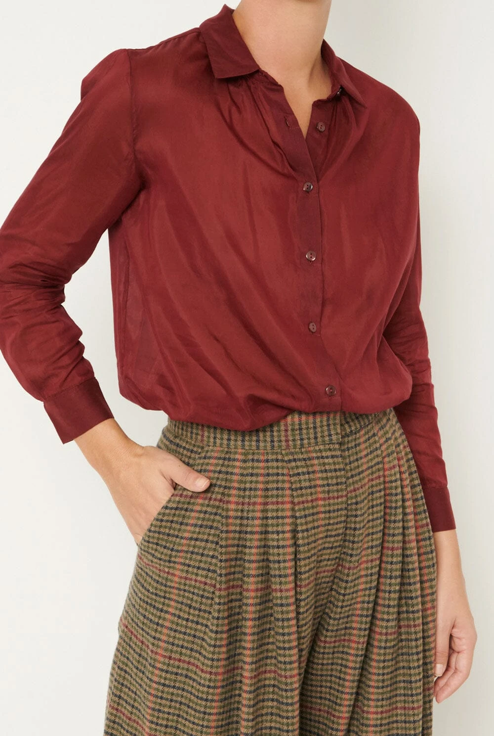 Maroon silk and cotton shirt with gathers at the collar.