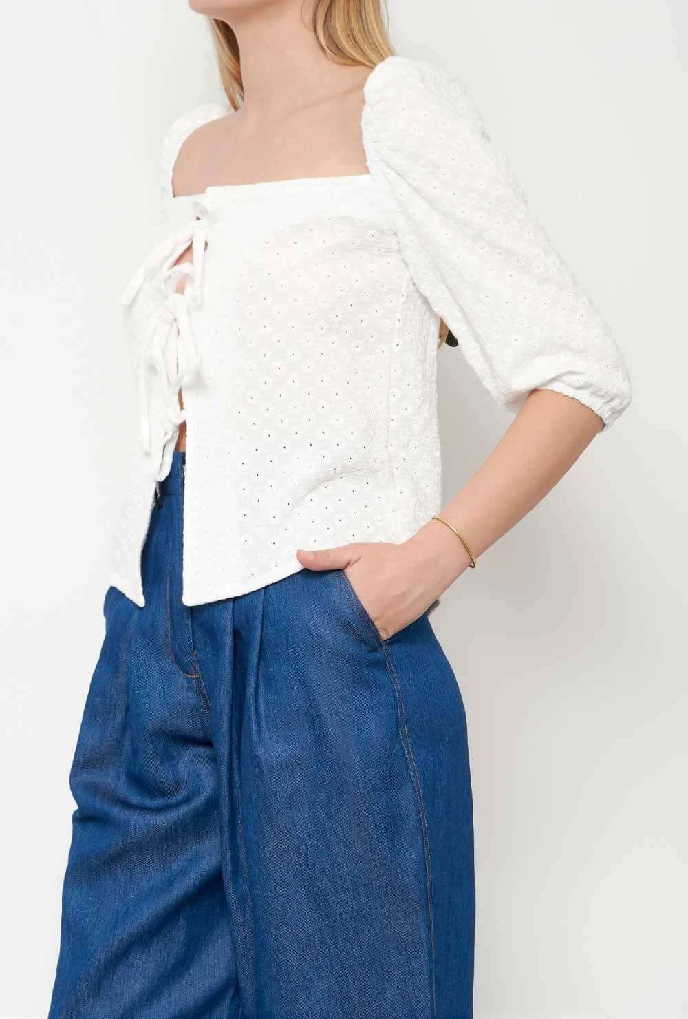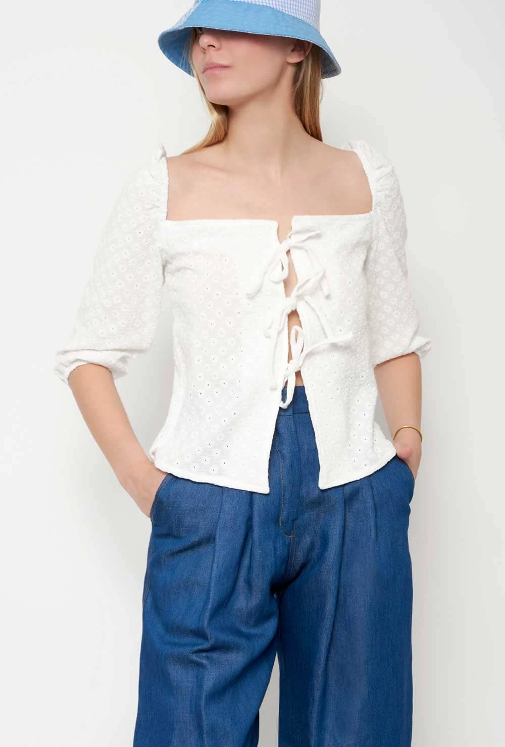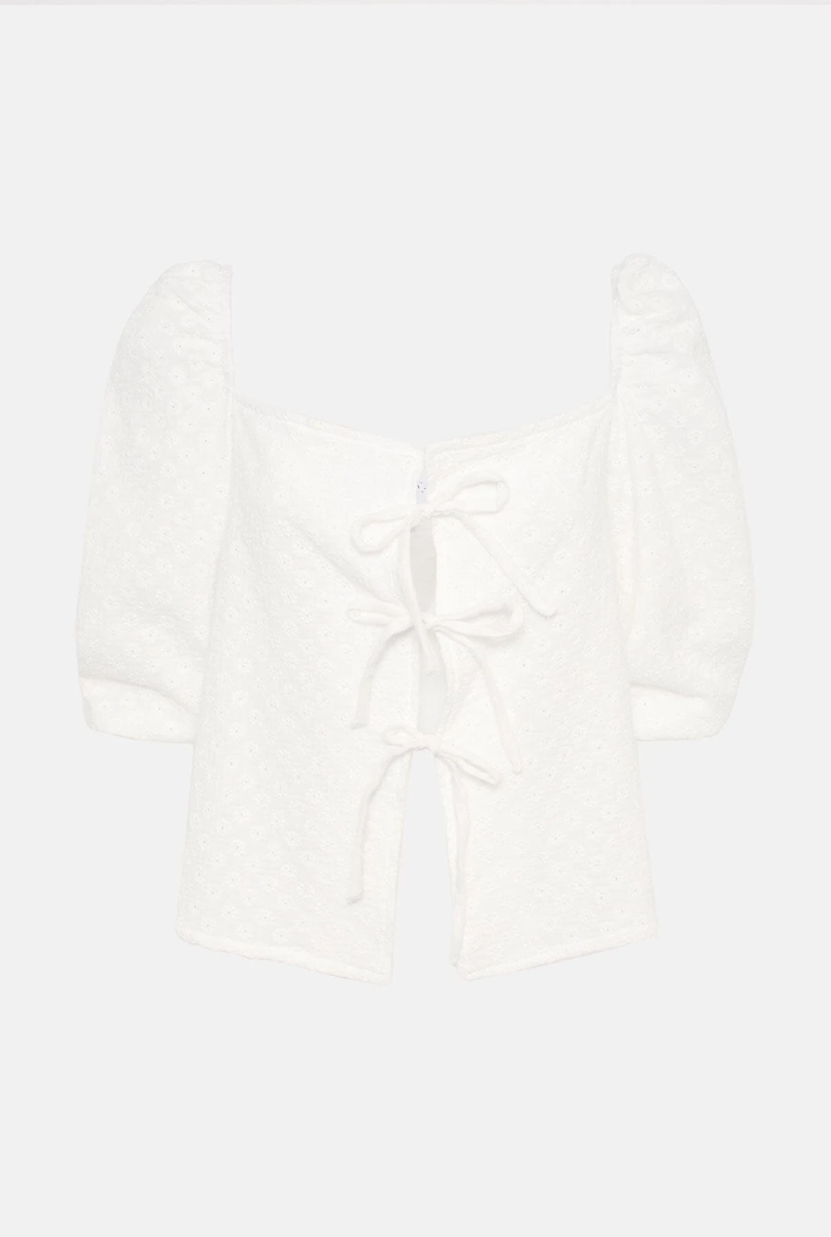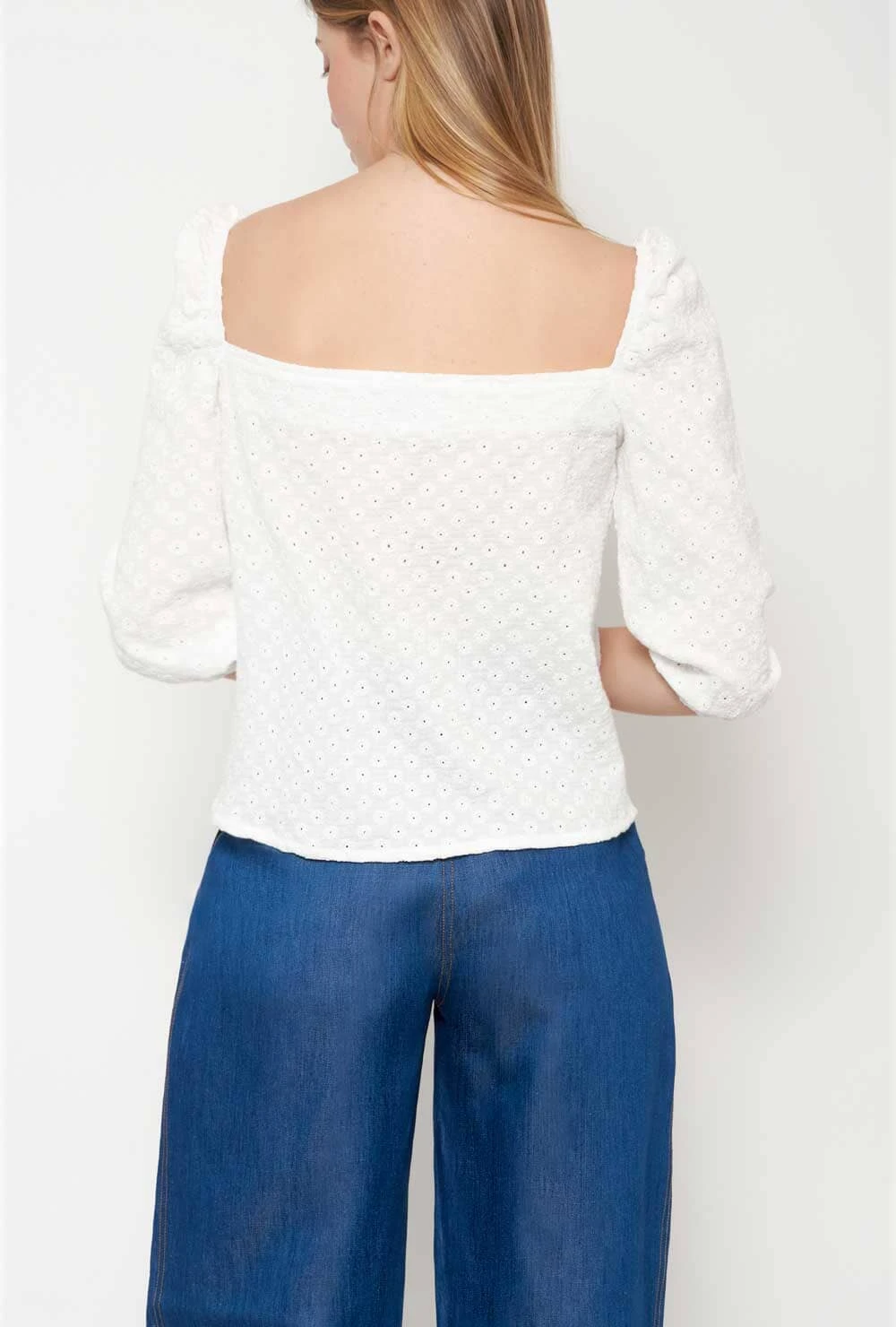 Shirt in embroidered cotton fabric with puffed sleeves. Bardot neckline Closes with ties at different heights. Wash maximum at 40 degrees. iron at medium temperature, do not use bleach, do not tumble dry. Designed by Alava Brand