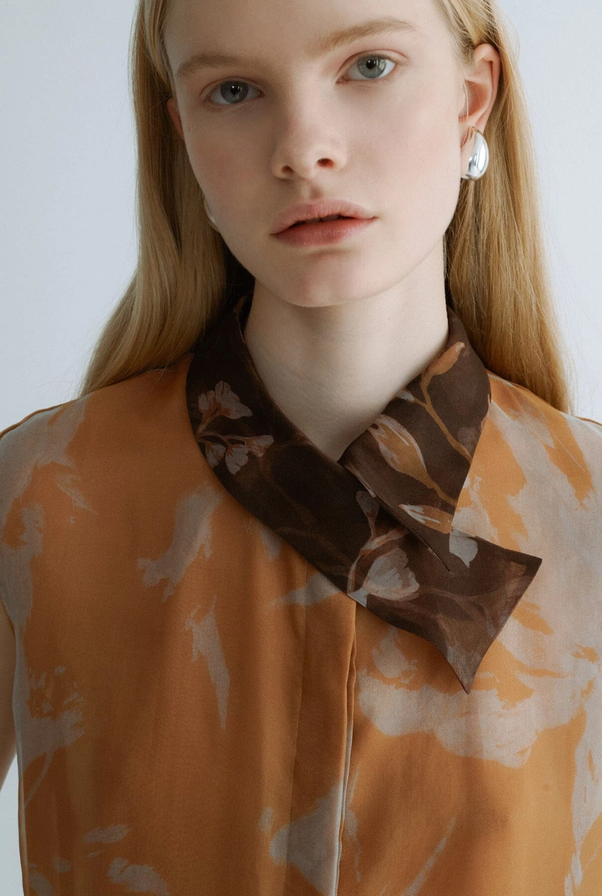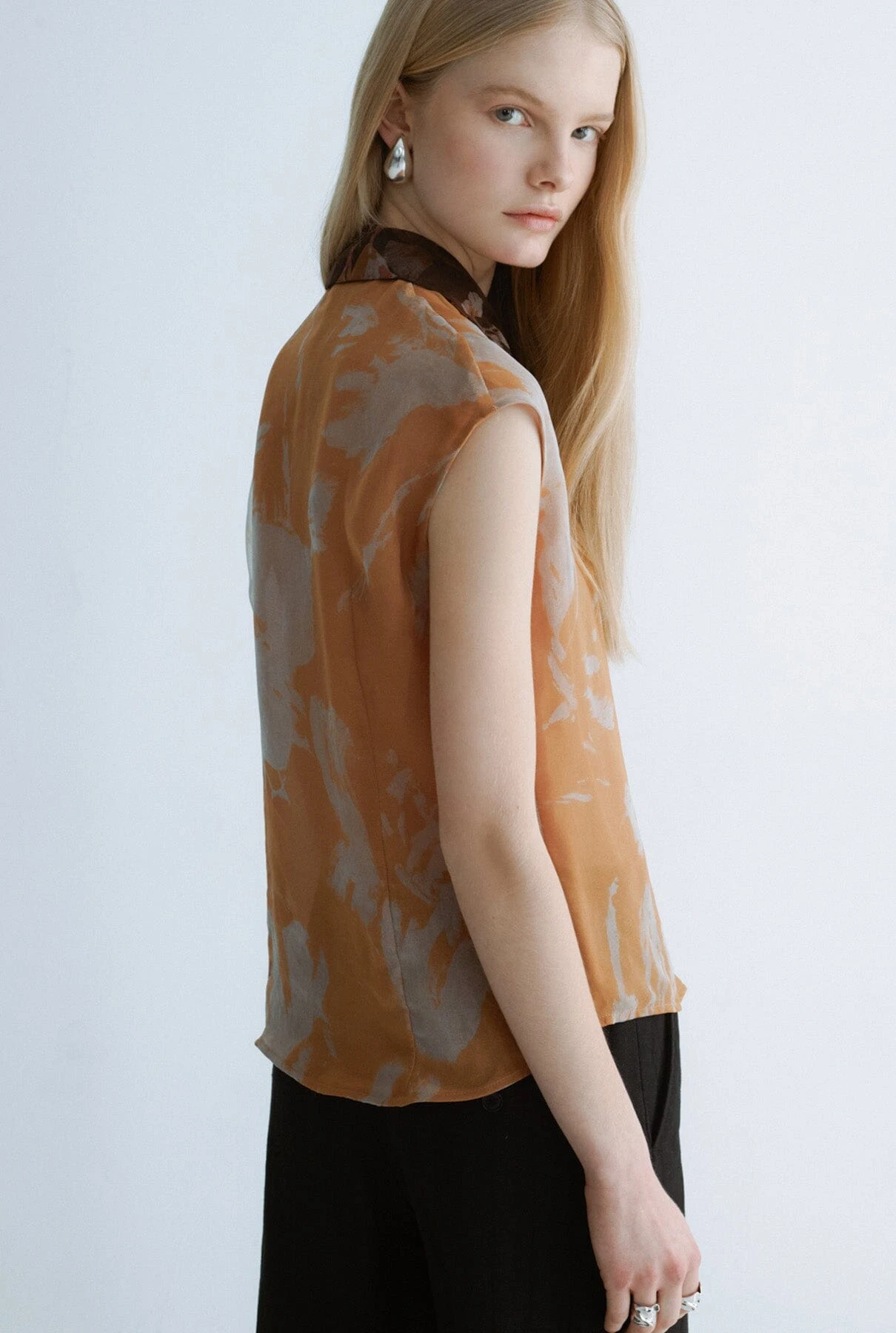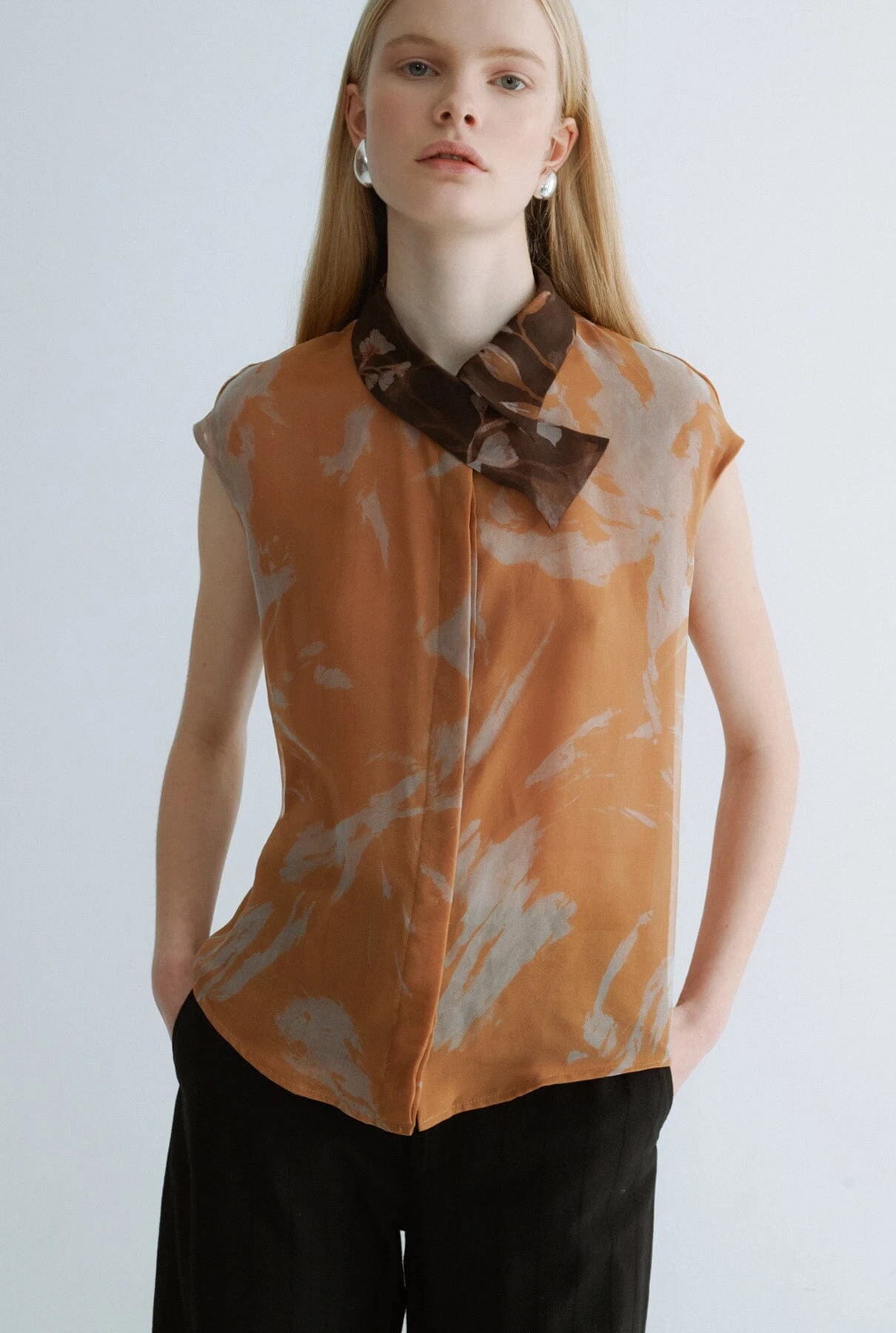 Miguel Marinero signature shirt in printed organza. Asymmetric collar that provides a sophisticated and characteristic look of the firm. A versatile option for elegant meetings or a more sophisticated look as a guest.