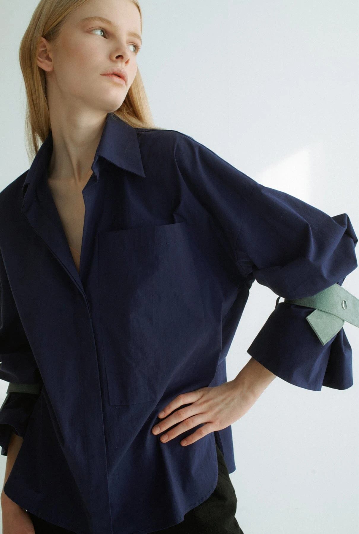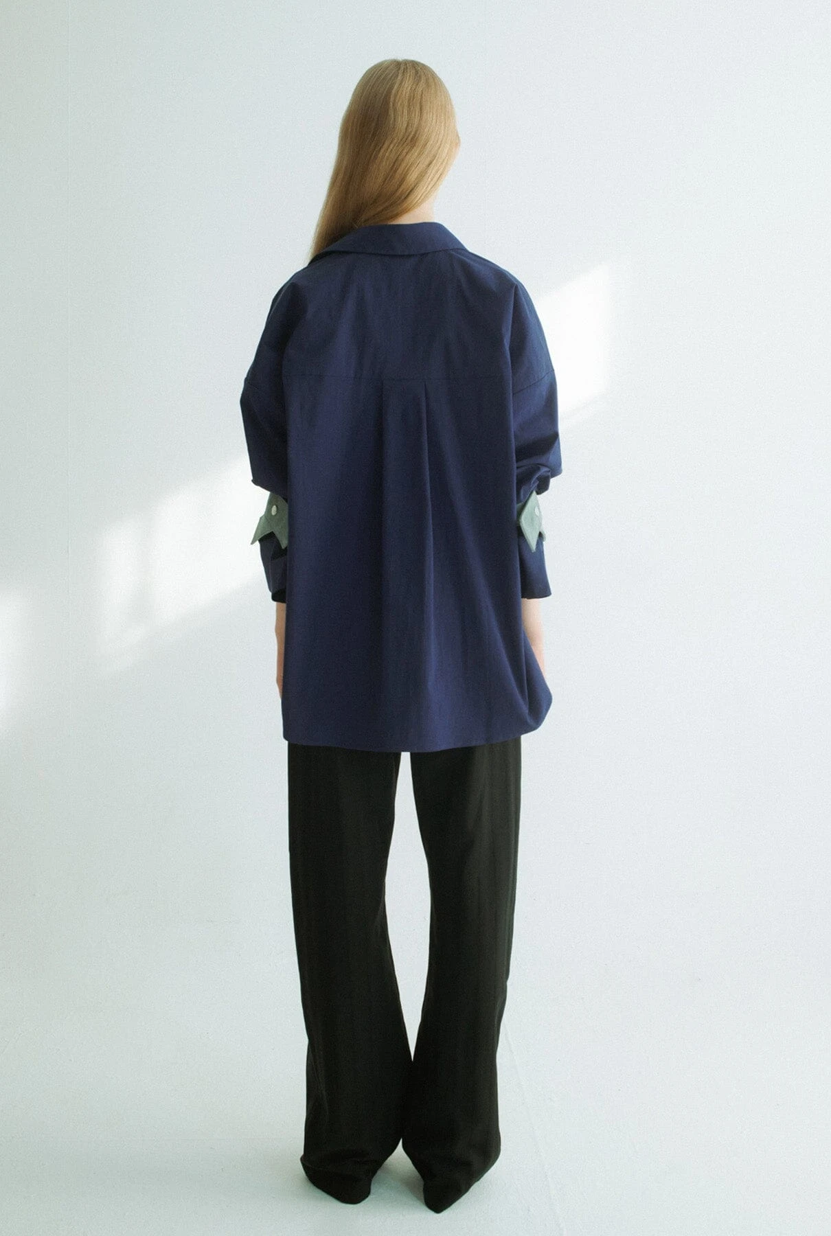 Miguel Marinero shirt in blue cotton with blue suede detail on the cuffs. The suede on the sleeves makes it special and unique, providing a sophisticated and characteristic look of the firm. Complete your wardrobe with this wardrobe staple shirt, a versatile option for elegant meetings or a more casual look, oversize style.