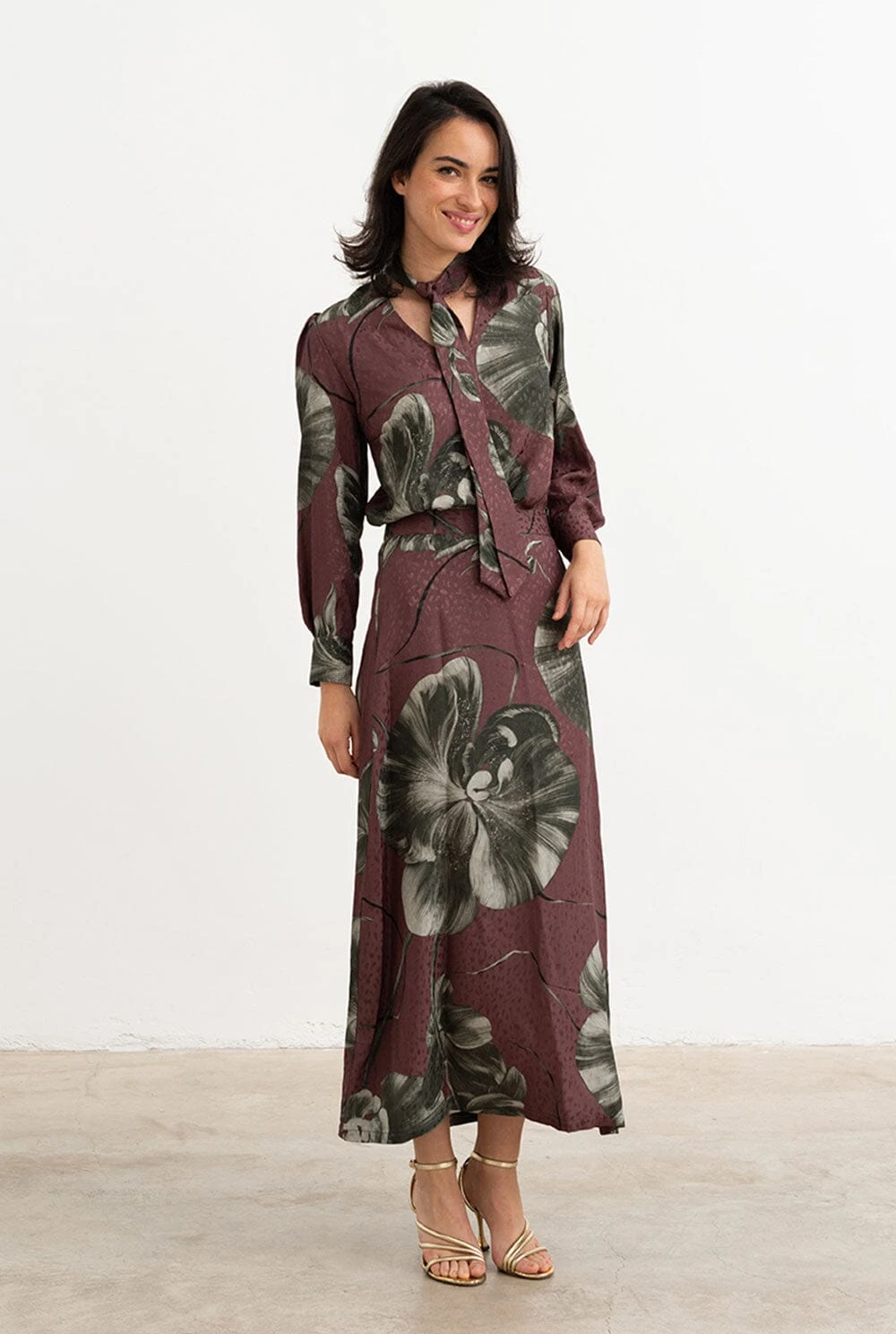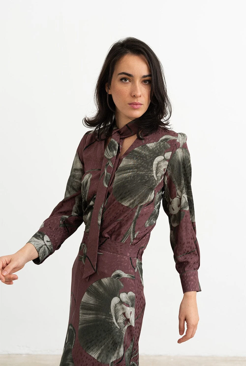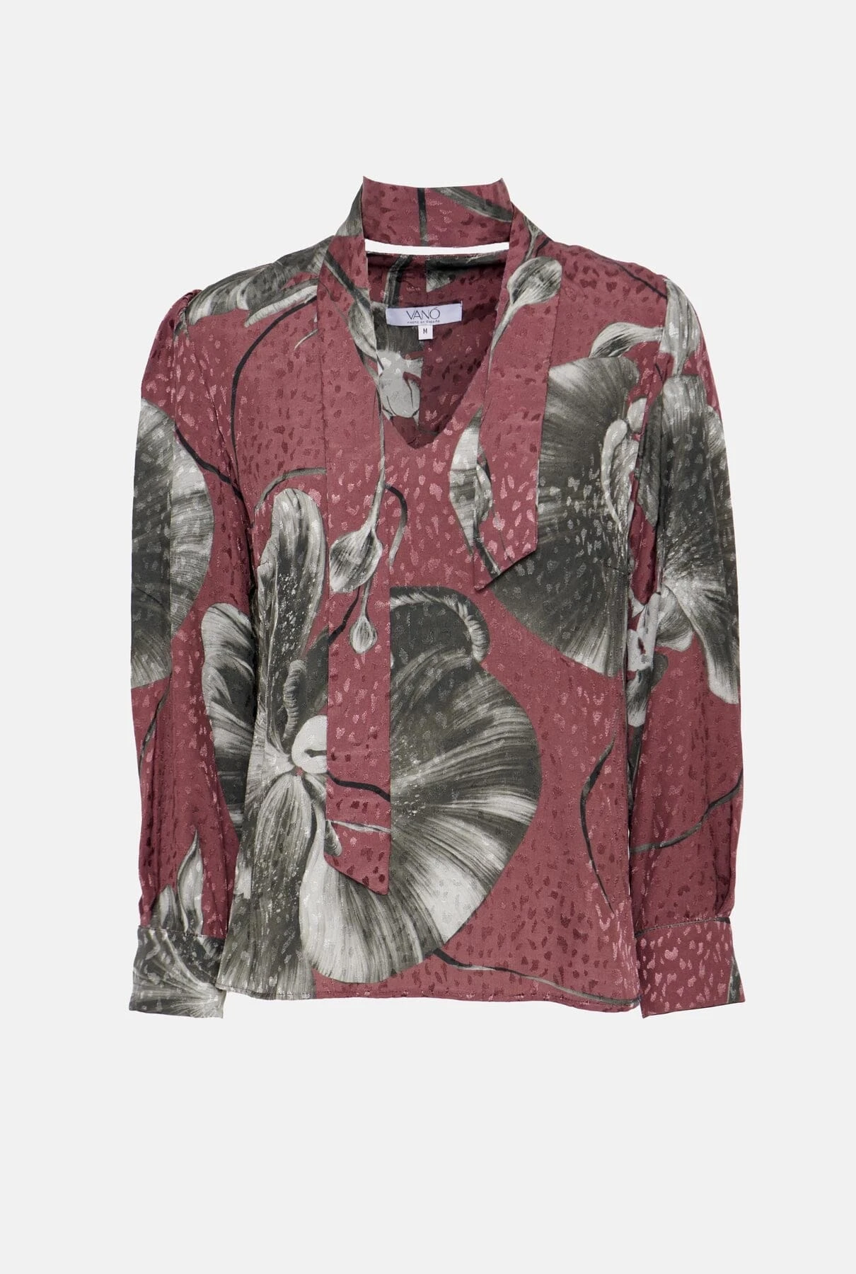 Printed shirt in burgundy and gray printed fabric, V-neckline, multi-position bow on the neck. Midi sleeve with closed cuff with two summarys.