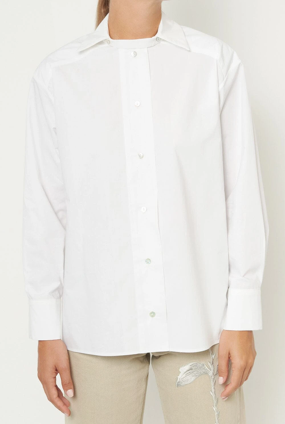 Shirt with shirt collar and tie. The tie can be removed and put on with a pull tab closure, allowing you to have a basic turndown collar shirt open or closed with the tie. The composition is Cotton, it is recommended to wash by hand, although it can also be washed in a washing machine on cotton programs. Do not use bleach, iron at low temperature, do not tumble dry.