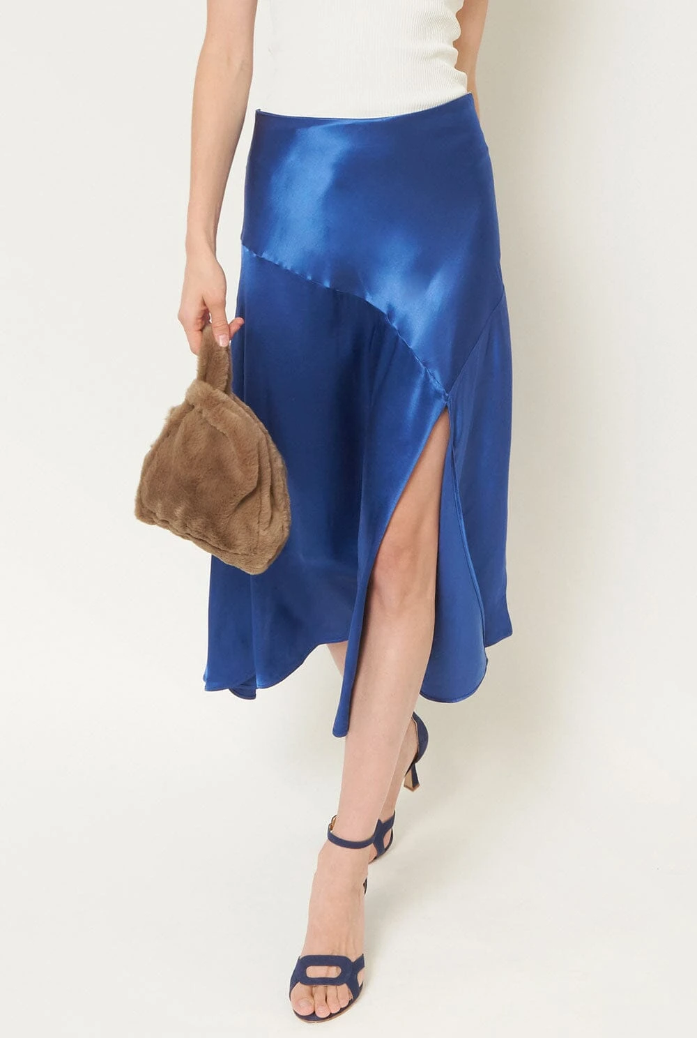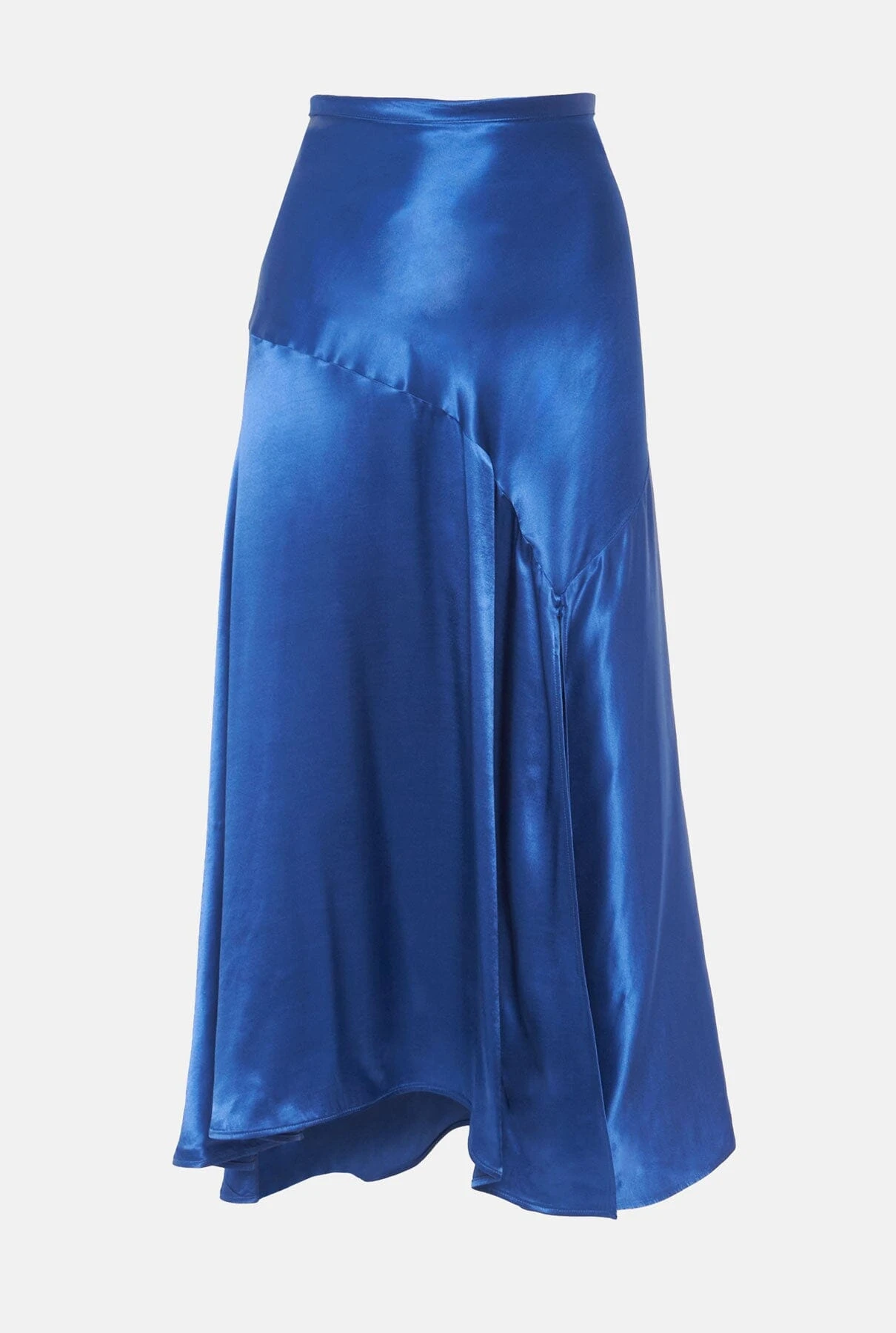 Satin midi skirt with high rise and front side slit to mid-thigh. With ruffle at the bottom of evasé cut. Hidden side zipper closure.