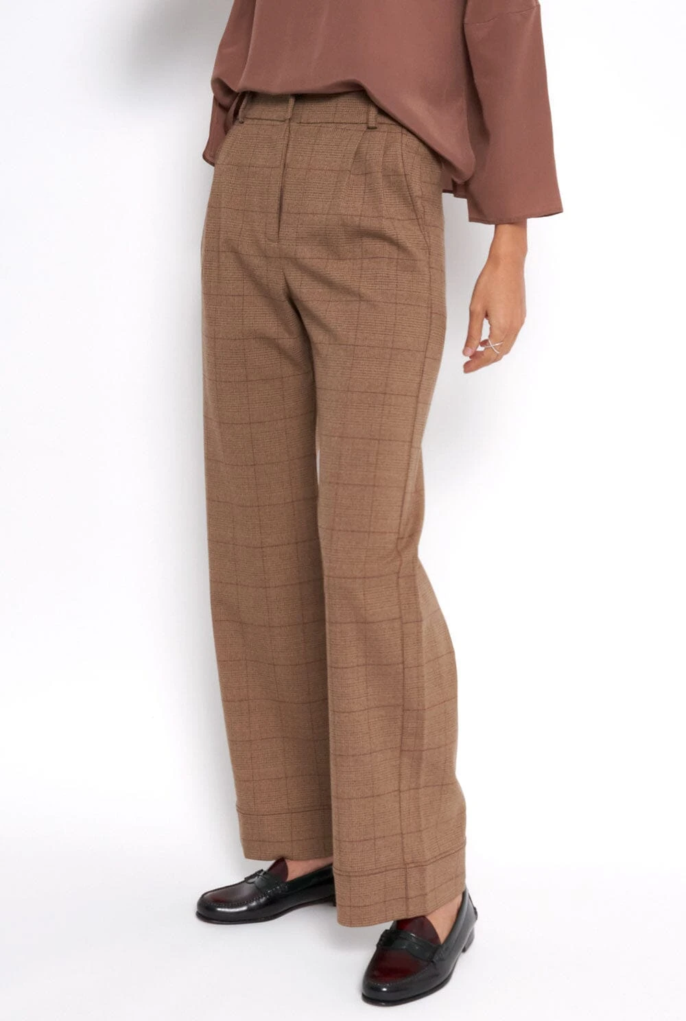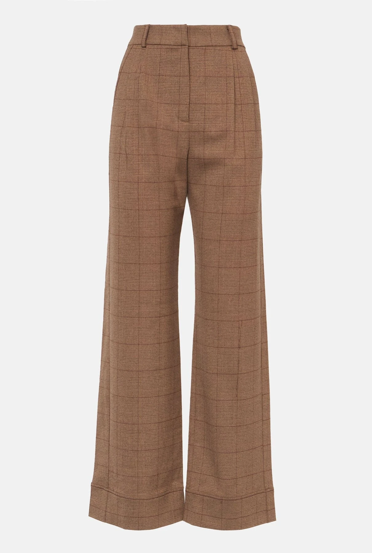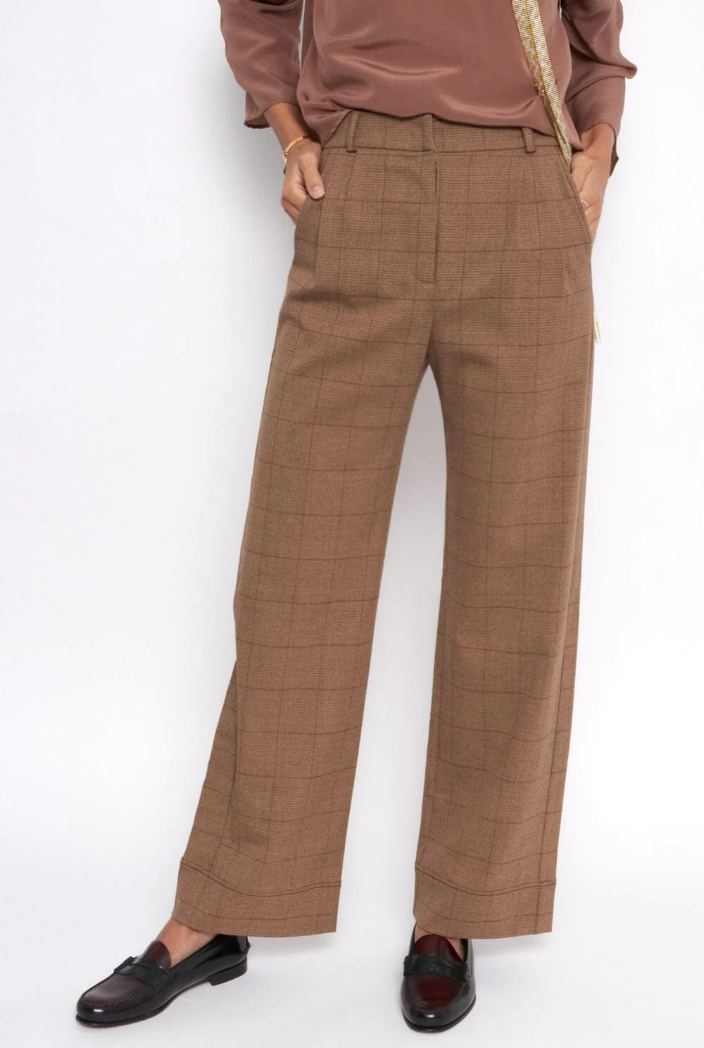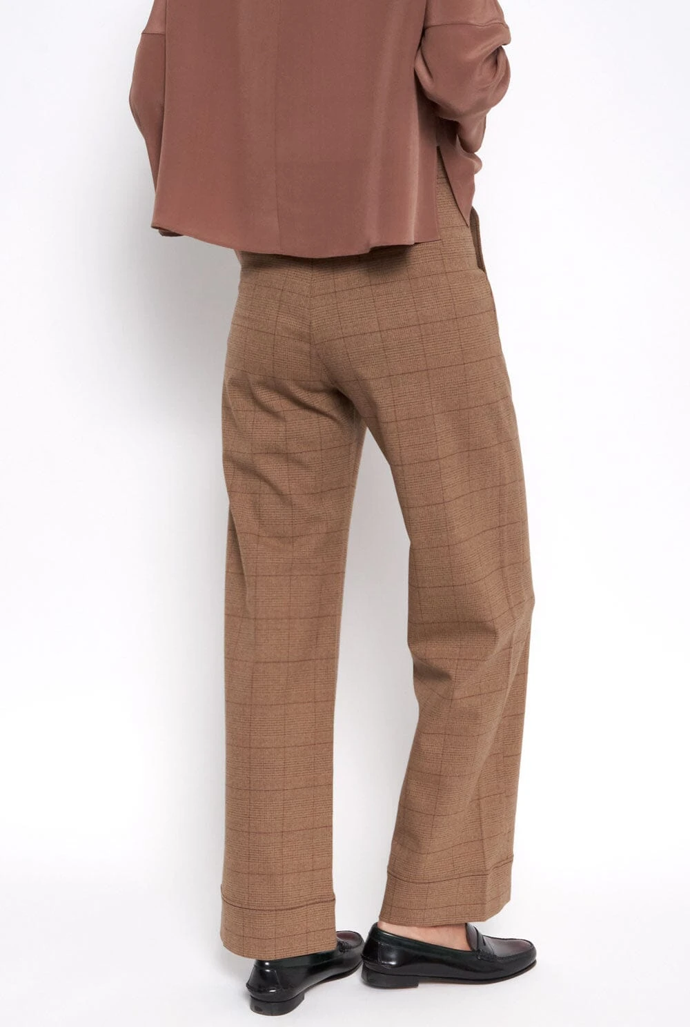 Straight, ankle-length dress trousers with turn-up waistband and bottom. Centre front zip and summary fastening. Slant pockets at front and basic welt pocket at back right. Contrast colour on the decorative stitching on the front pockets and on the bottom. Herringbone fabric composed of 54% polyester, 44% virgin wool, 2% elastane in beige.