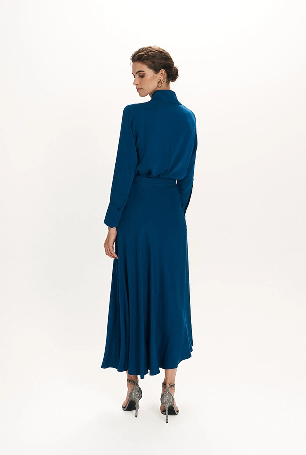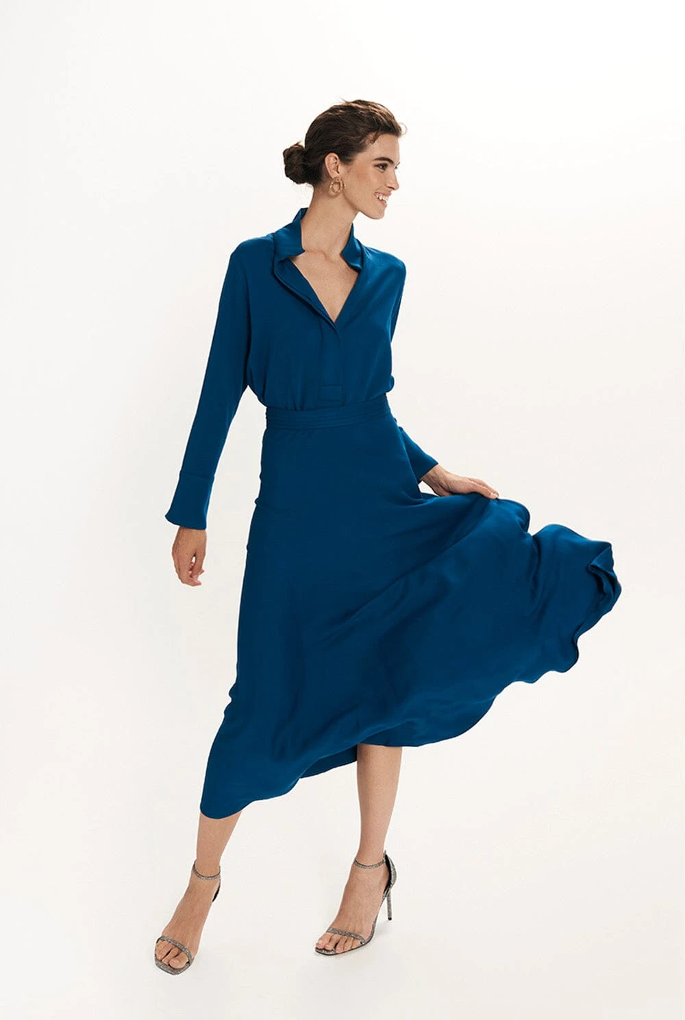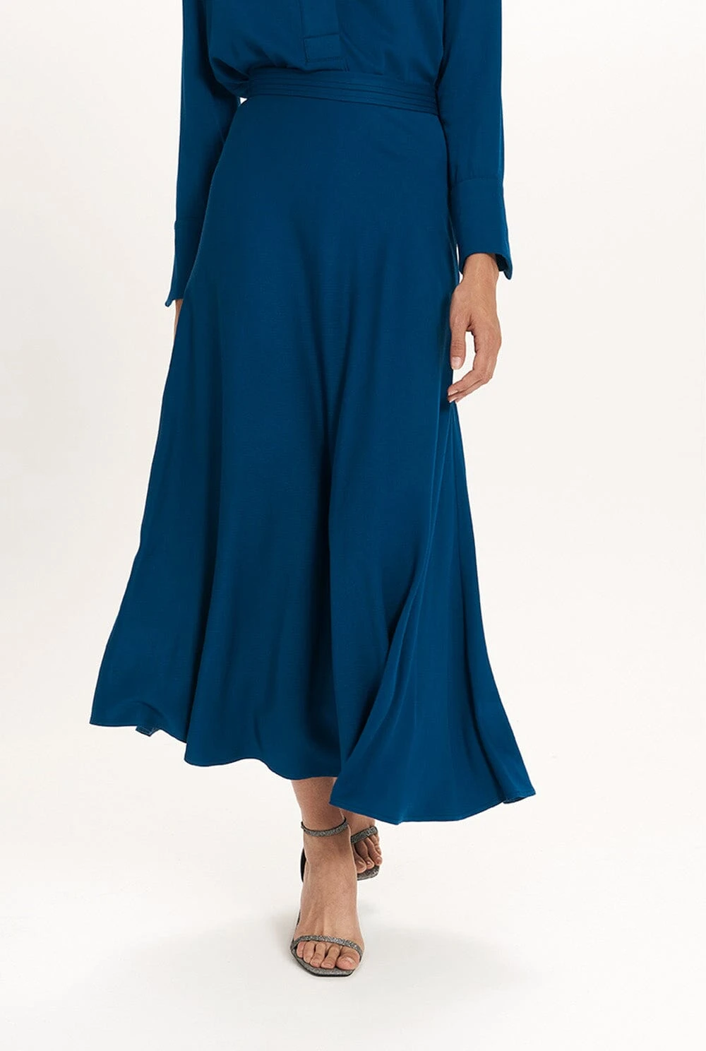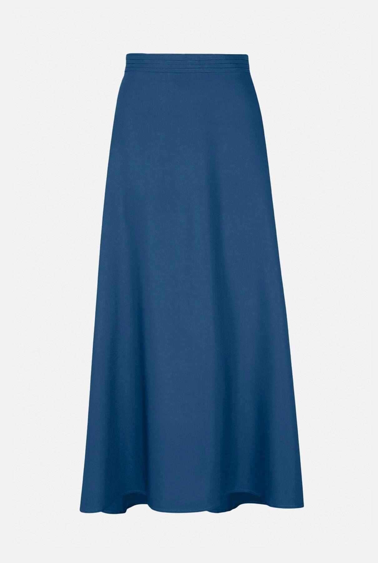 Skirt with lots of flounce and movement. The skirt is cut in layers and has bias binding in several places, so that, with the drape of the fabric, the result is a skirt with spectacular movement. It has an irregular hem and a zip on the left side. The waistband is detailed with a ribbed detail.