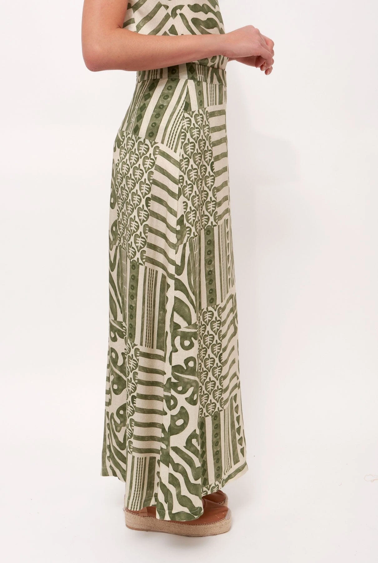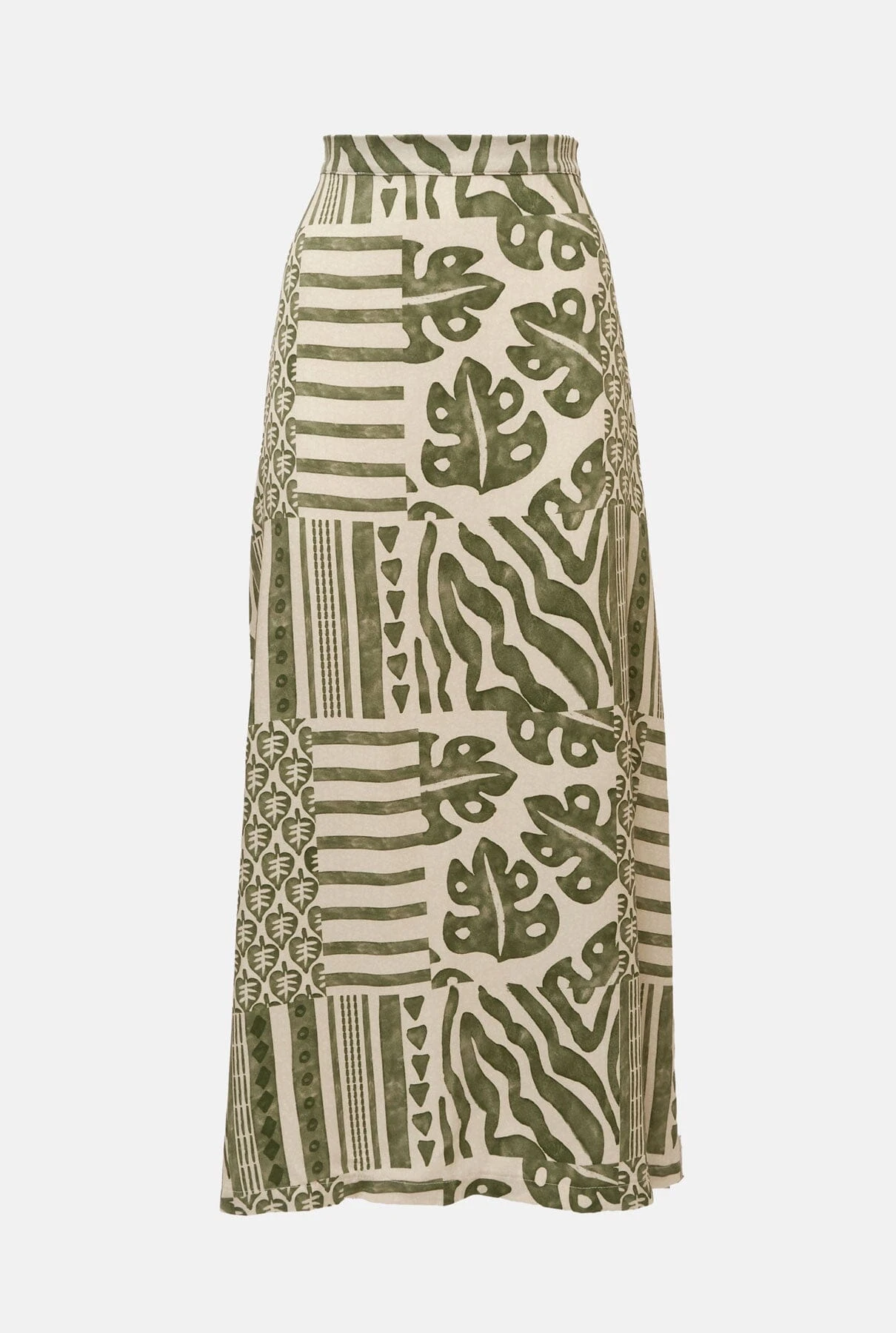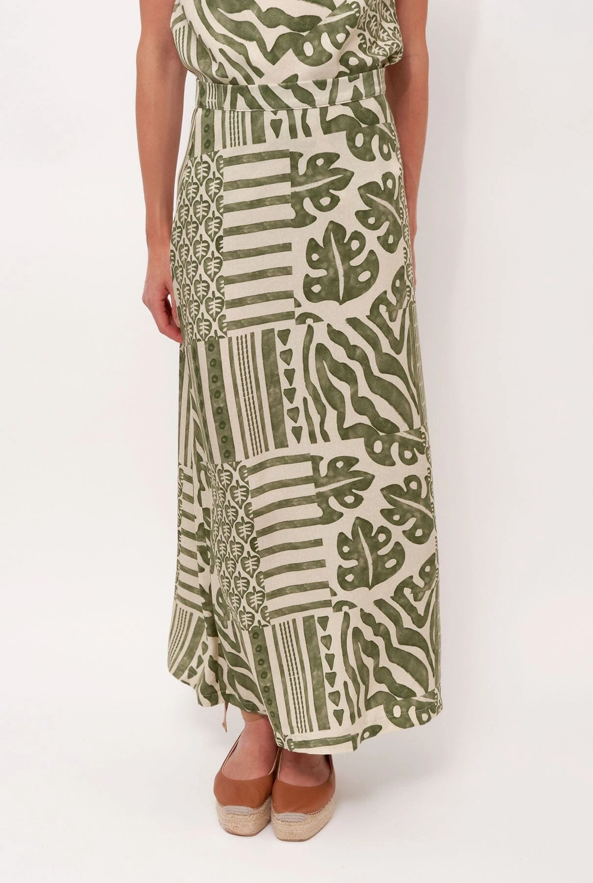 Midi skirt in green and mustard printed fabric. Back zipper closure.