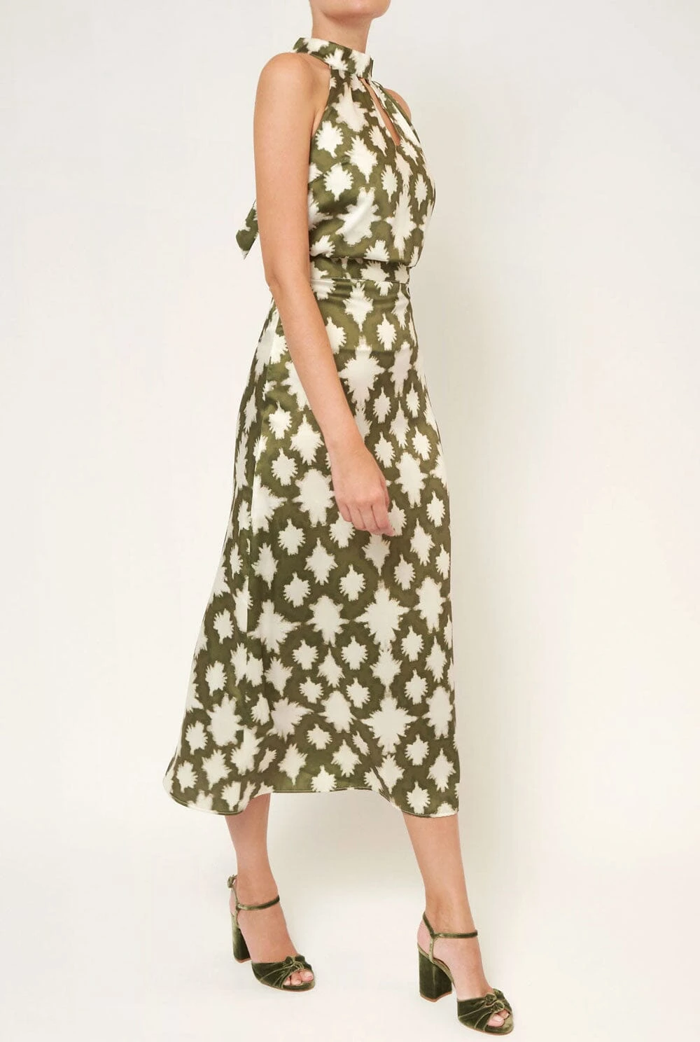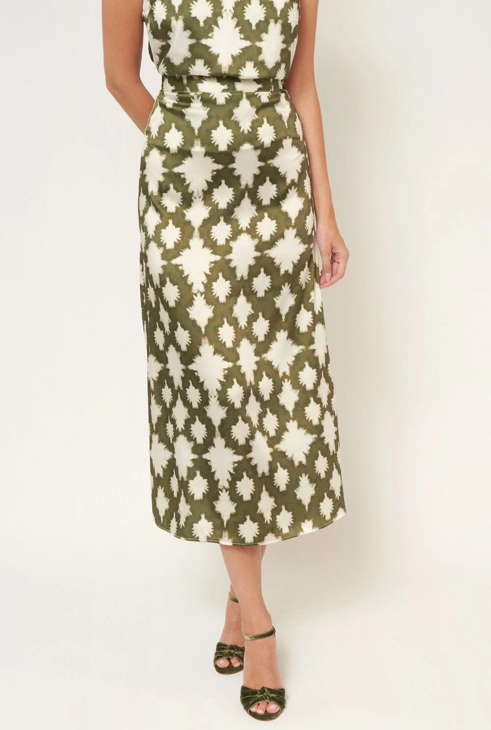 Green and off-white printed midi skirt. Back zipper closure. Wash at 40 degrees, do not iron, do not tumble dry, do not dry clean and do not use bleach