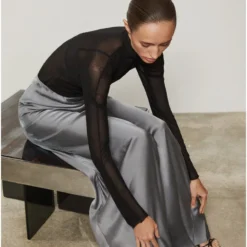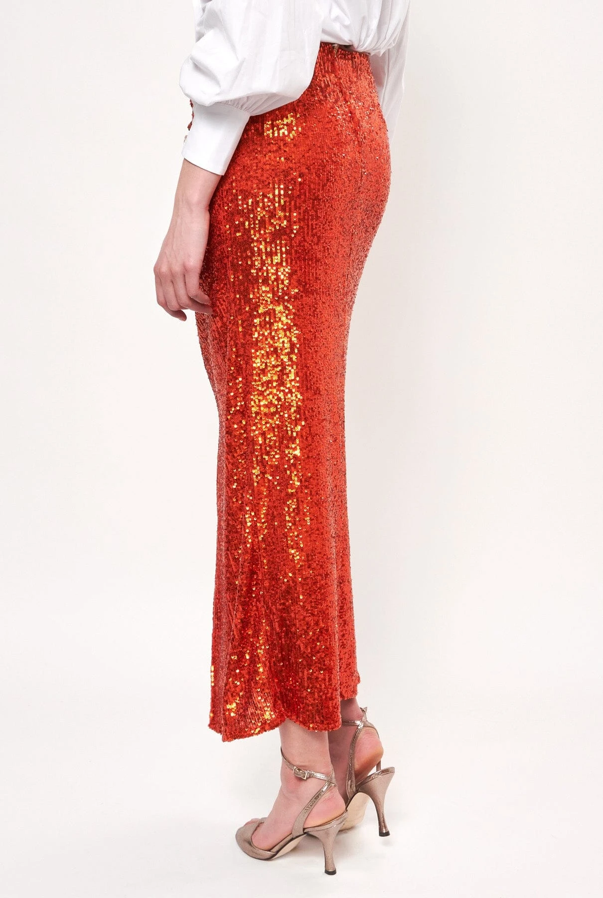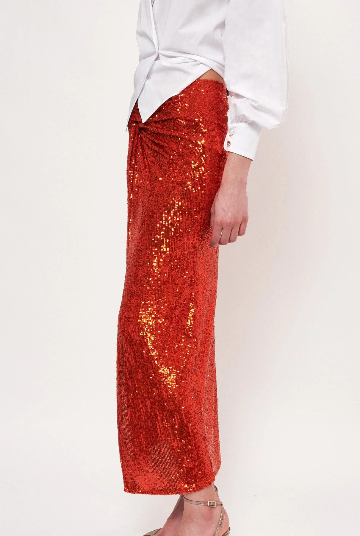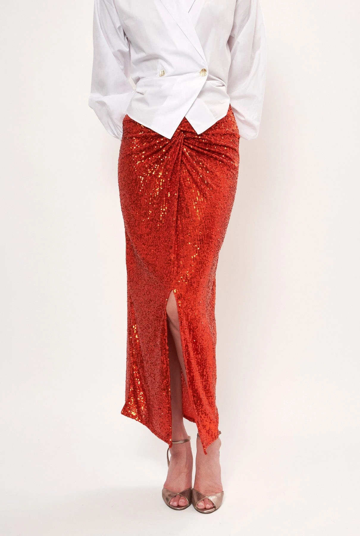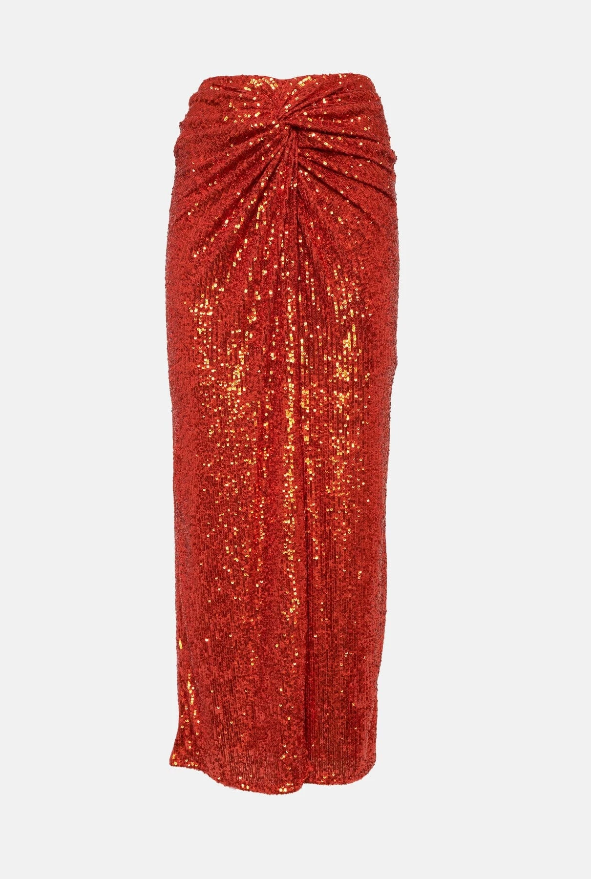 Dazzle at any occasion in our maxi length paillette skirt, which fuses glamour and comfort. The knot detail at the centre of the waist adds a touch of modern elegance, highlighting your figure in style. This skirt is the perfect choice for those looking to stand out with glitz and sophistication at special events.