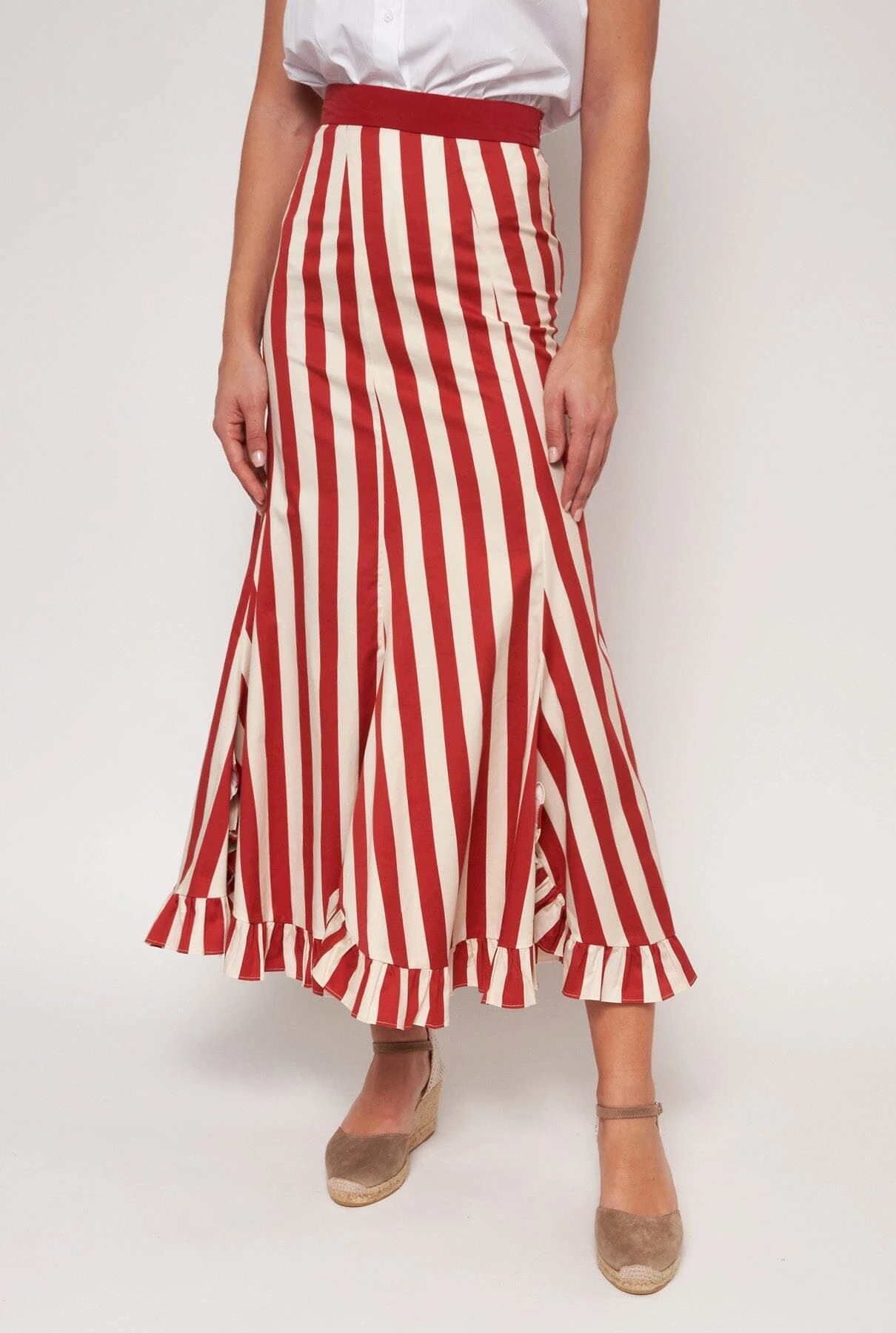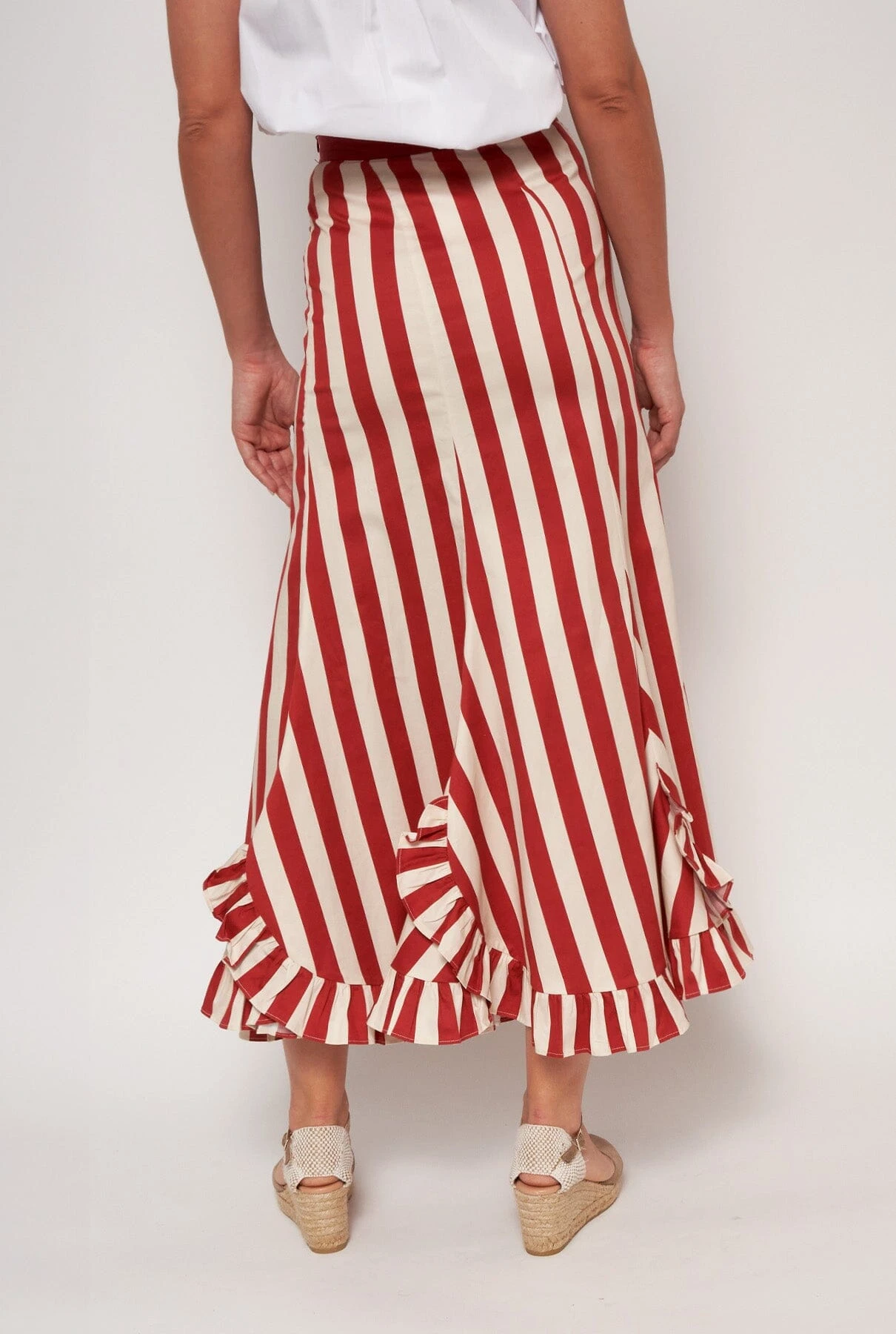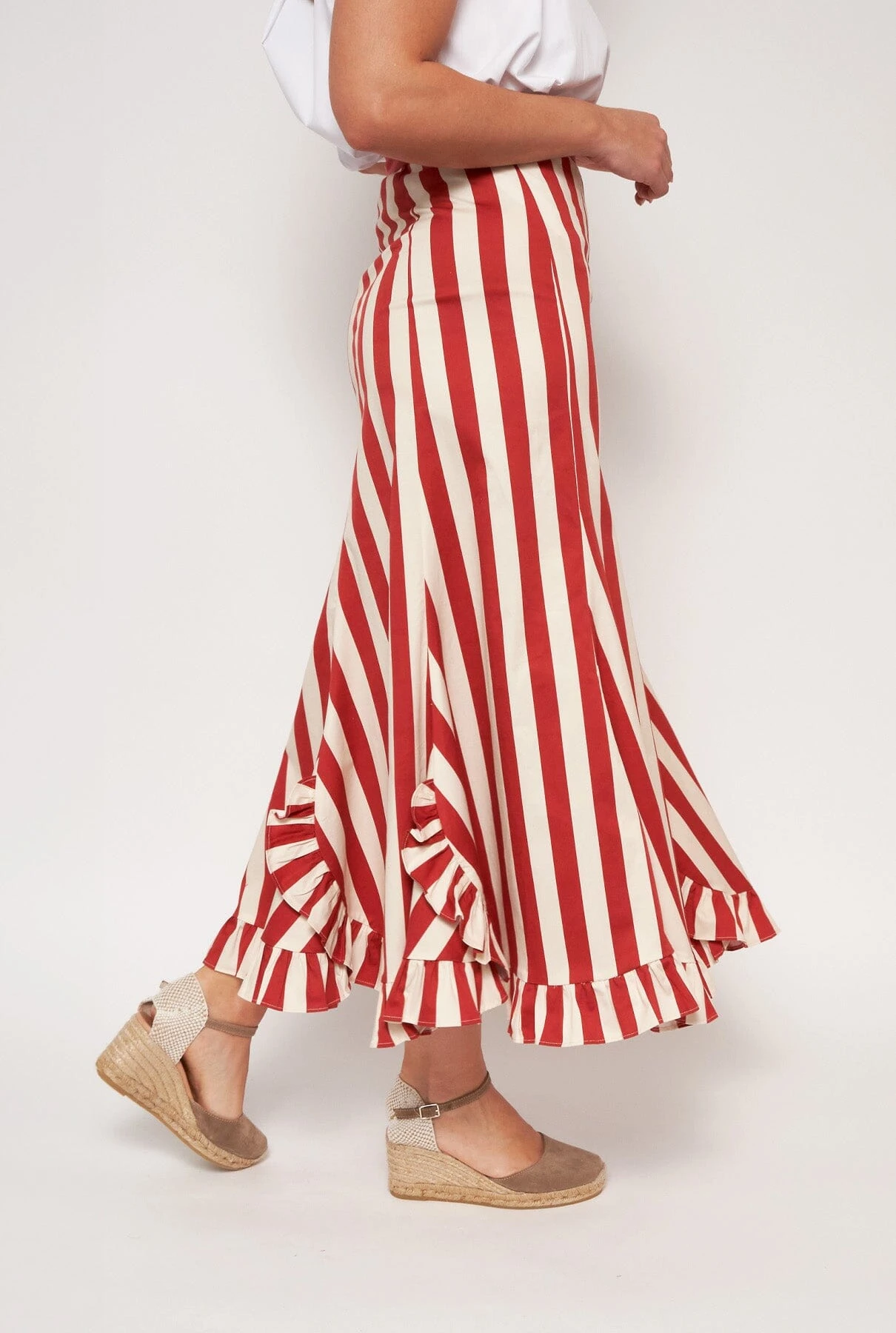 Long skirt with ruffles at the hem, made from a lightly satiny cotton and lycra fabric. Stripe print in a russet and ecru tone.
