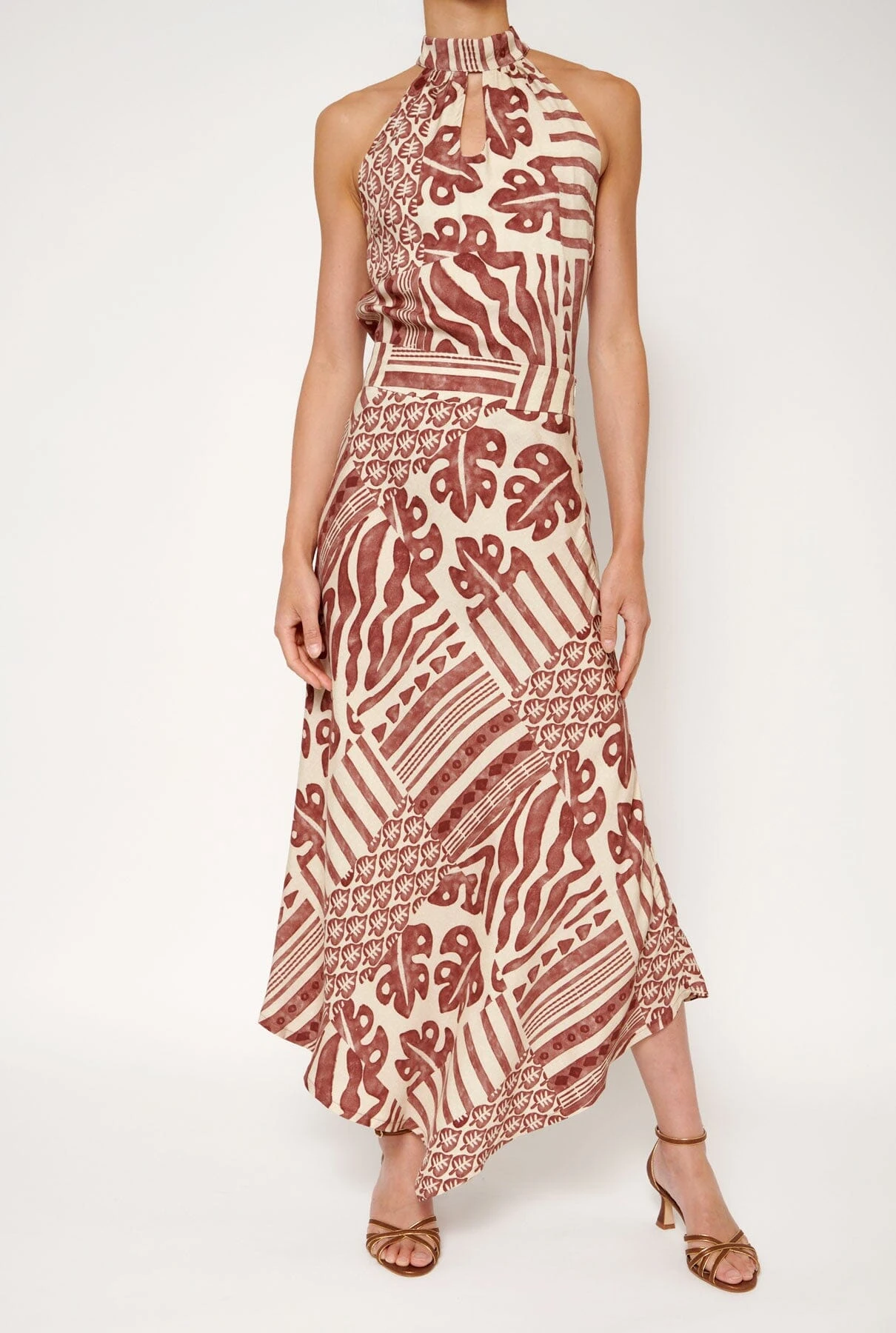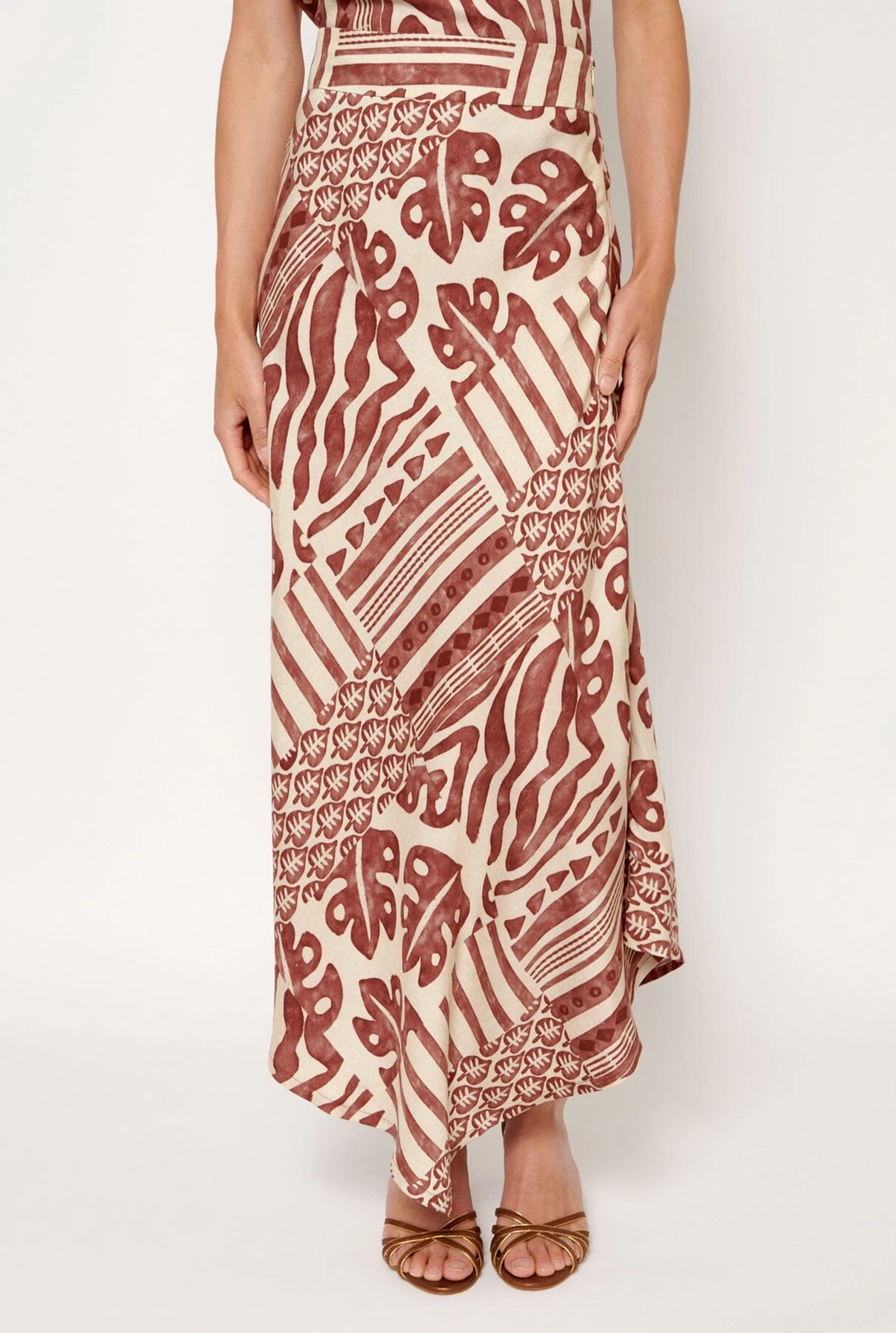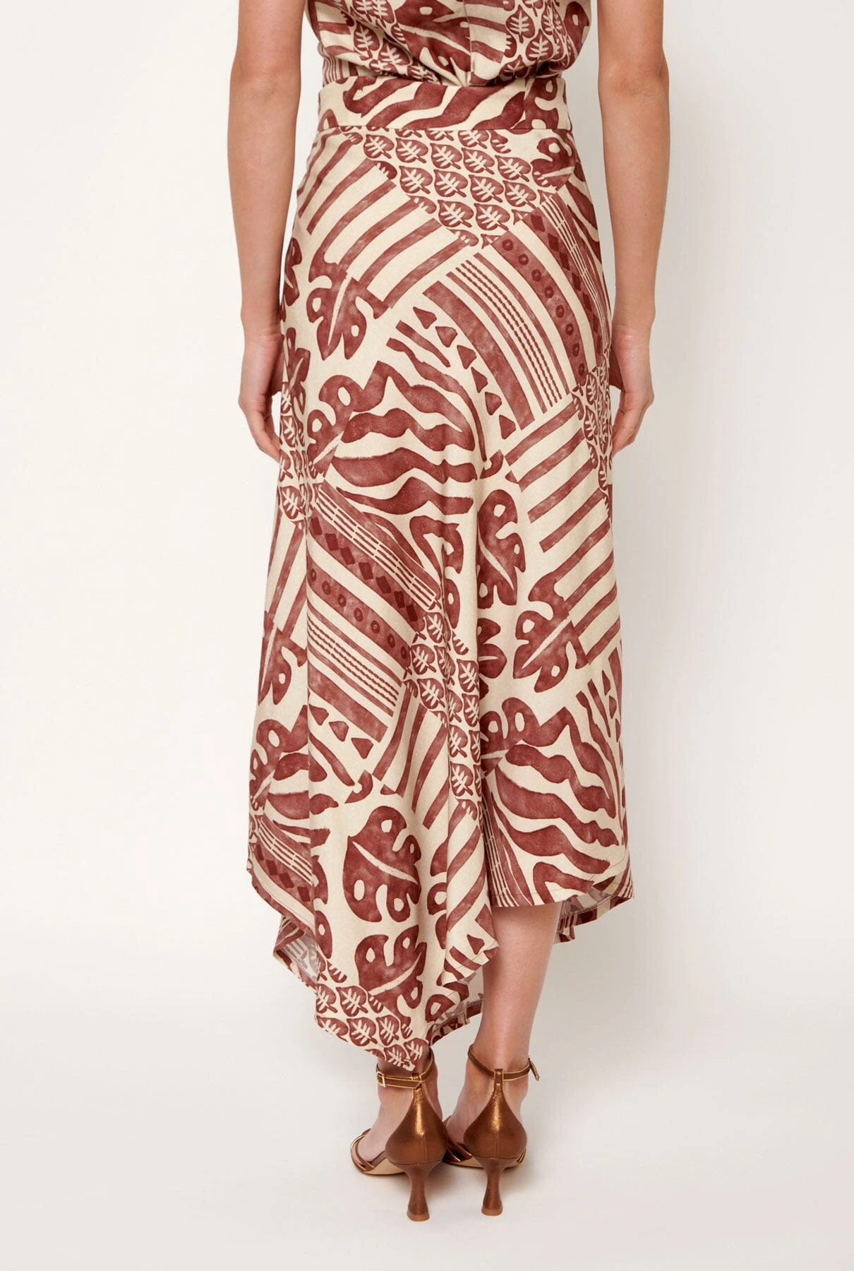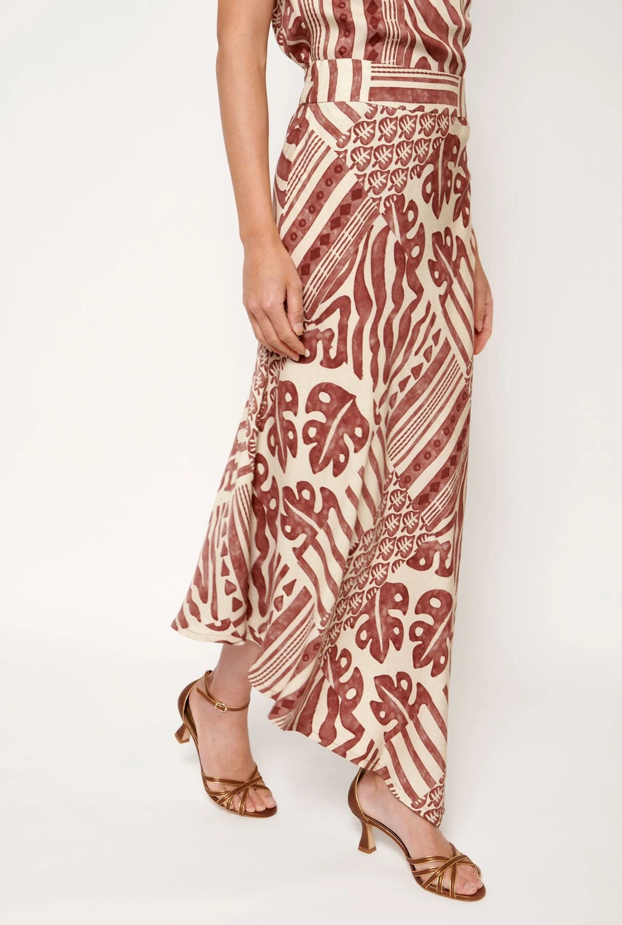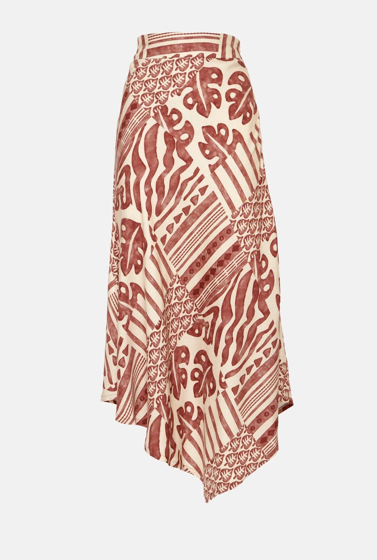 Midi skirt in red and beige printed fabric, asymmetric lower part. Zipper closure.