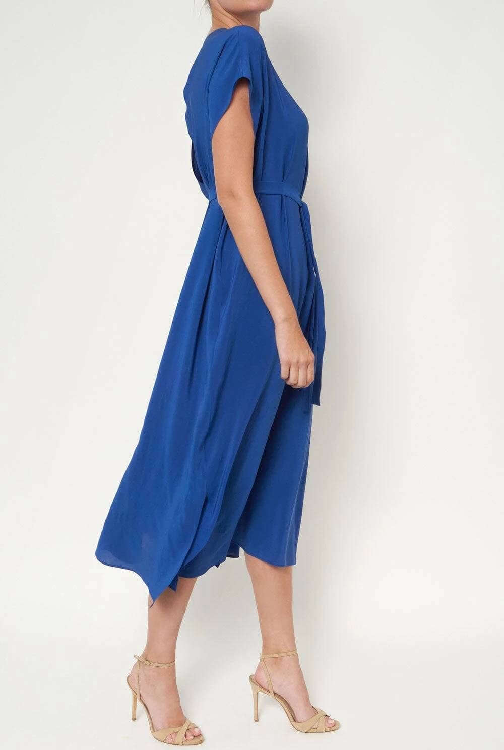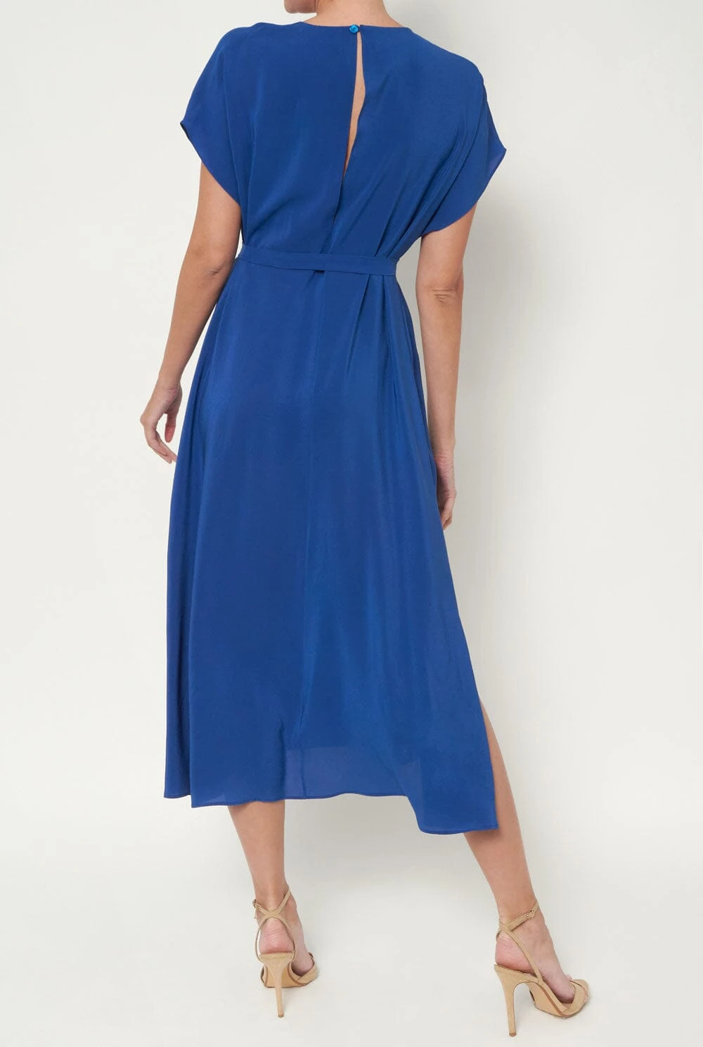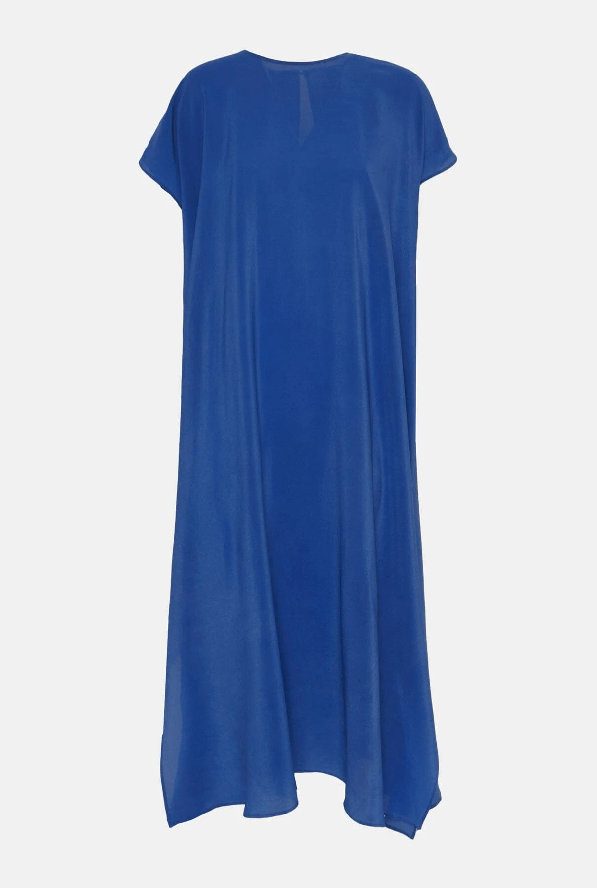 Naturally dyed with Indigo in our studio in Madrid. 100% Silk crepe long and oversized dress with a long back opening and slits on both sides with matching belt.