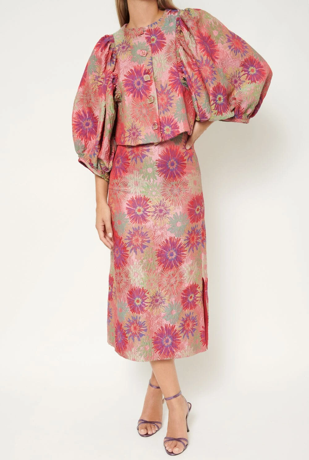 Skirt made of jacquard fabric with flowers pattern. The style is midi and straight, a little bit evase at the bottom with a split in the left side to help to walk.