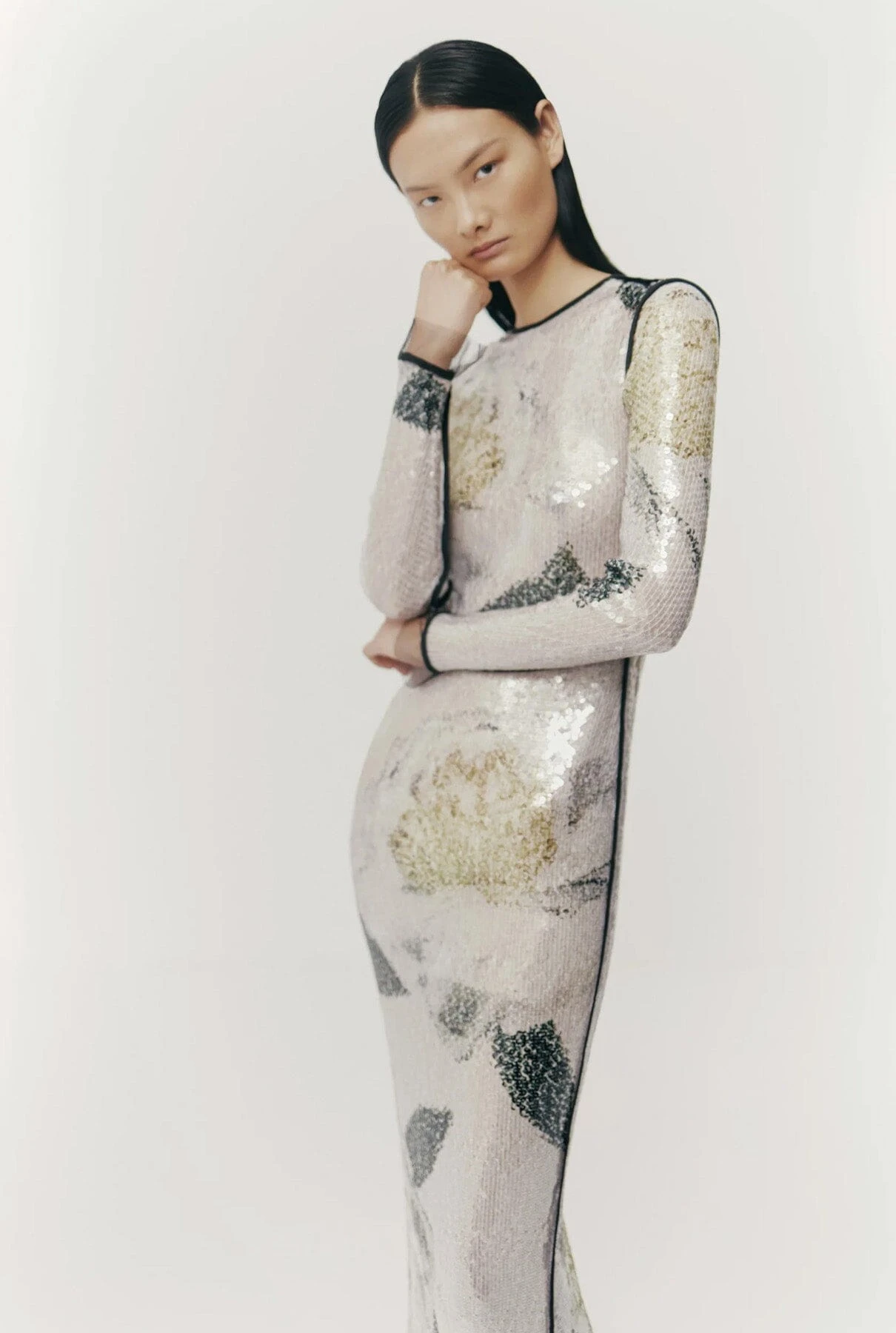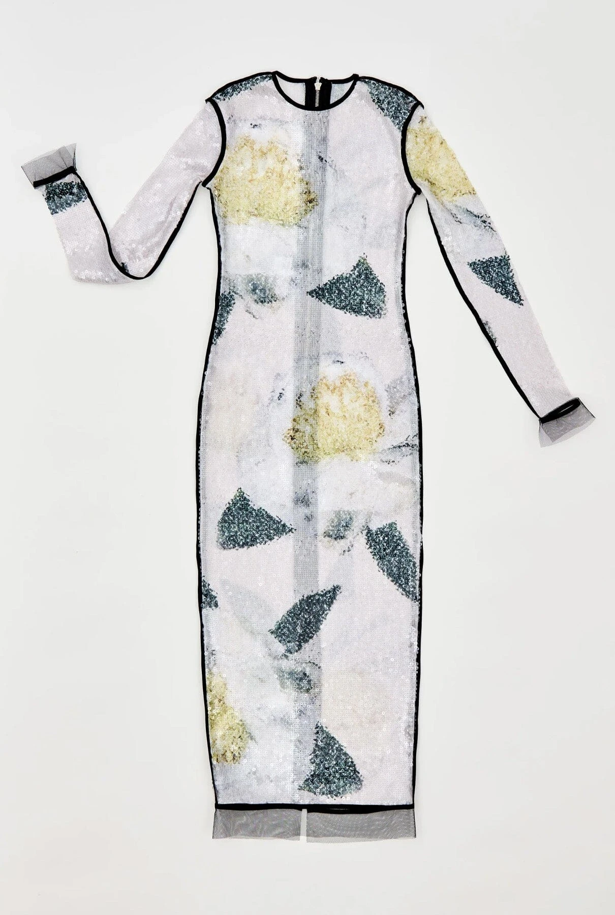 Midi dress with long sleeves and round neck, made in transparent printed sequins, finished with black contrast piping. Closes in the back with metal zipper heart. Botton hem with tulle nego.