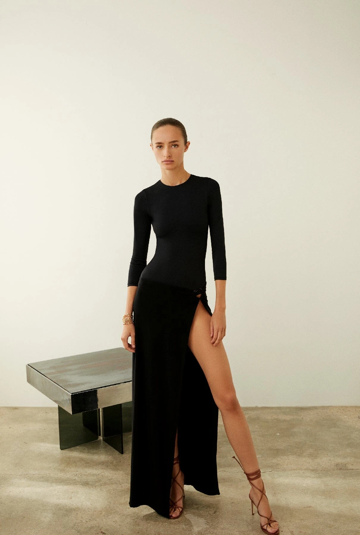 Introducing our signature long skirt, featuring a notable side slit fastened with a rounded piece in acetate. This versatile piece effortlessly transitions from beach to the party, offering a stylish and adaptable addition to your wardrobe
