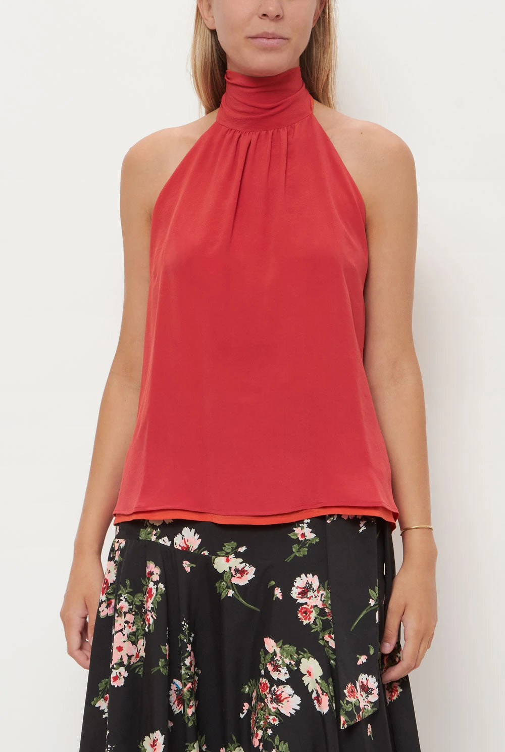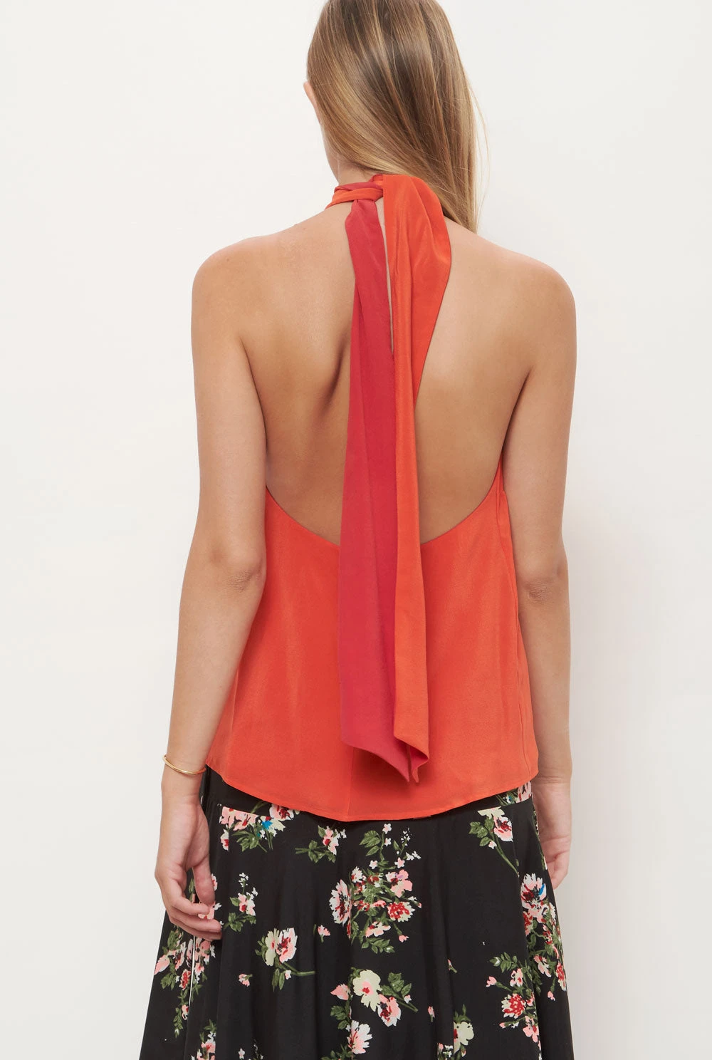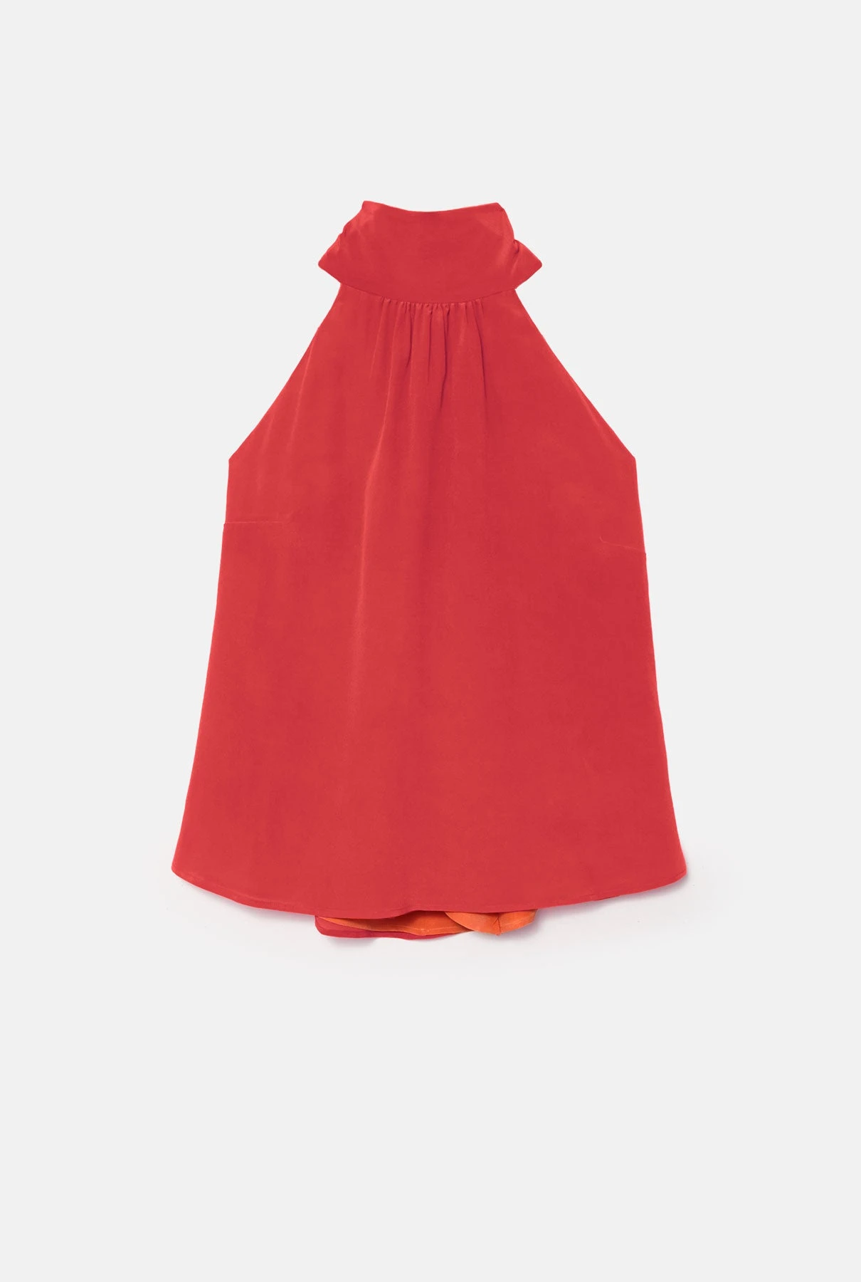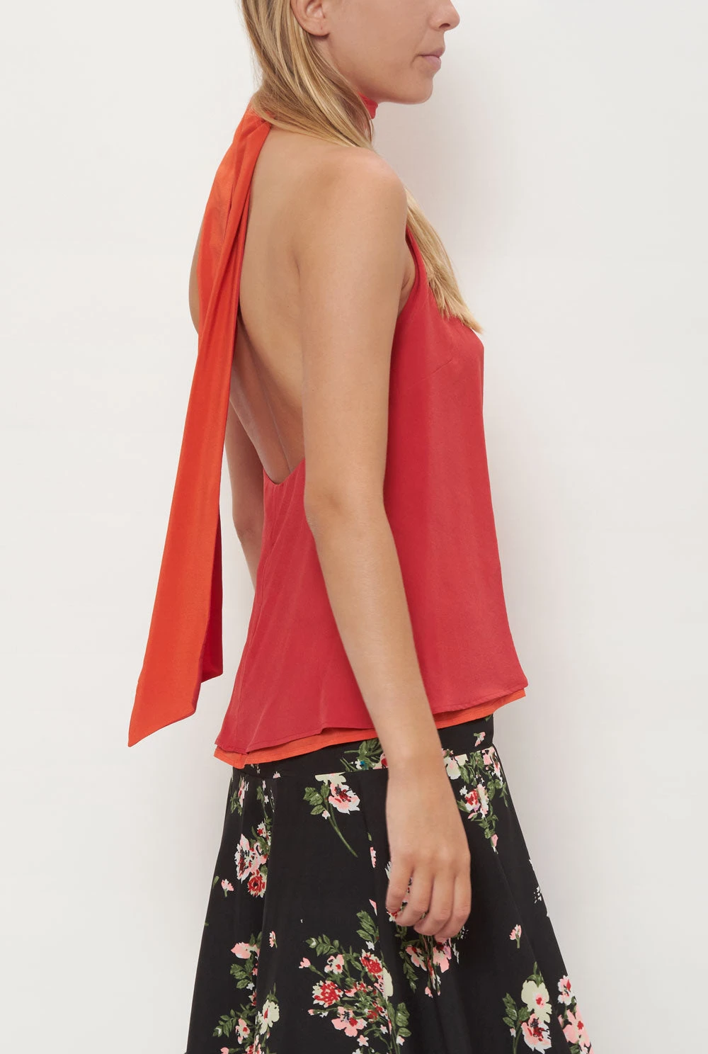 The Halter top is a two-tone reversible top that ties down around you neck, making it two tops in one. Made out of 100% silk crepe.