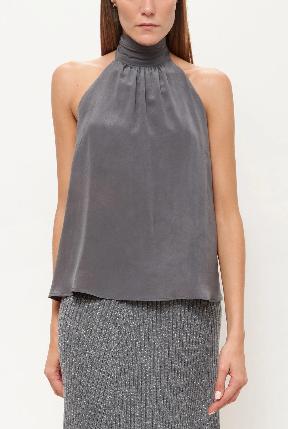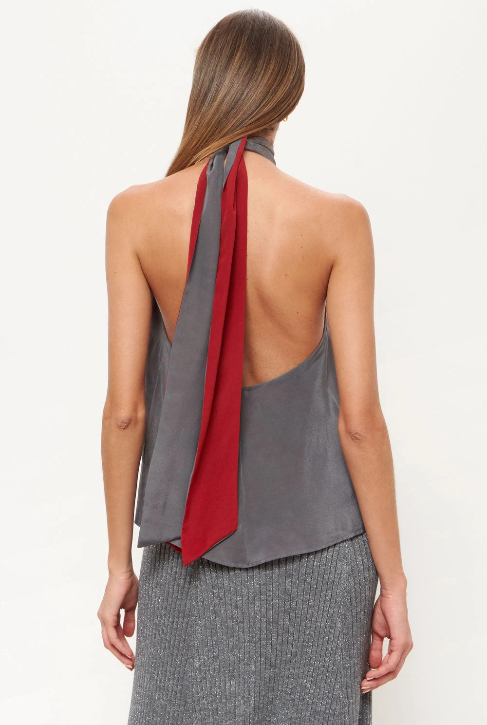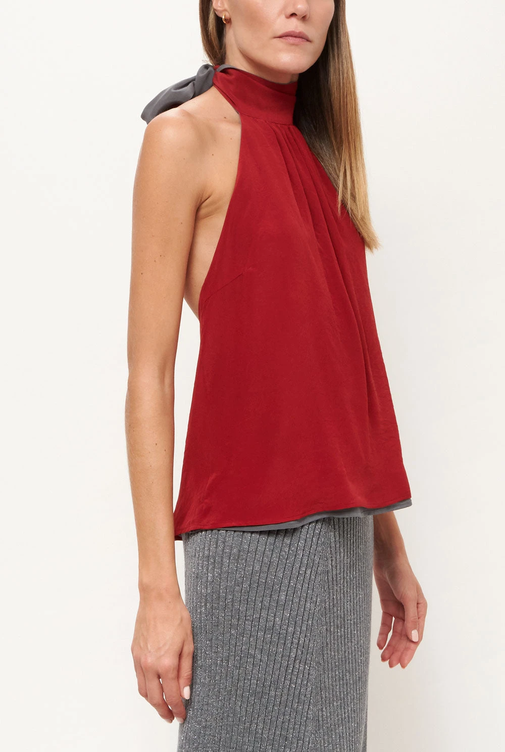 The Halter top is a two-tone reversible top that ties down around you neck, making it two tops in one. Made out of 100% silk crepe.
