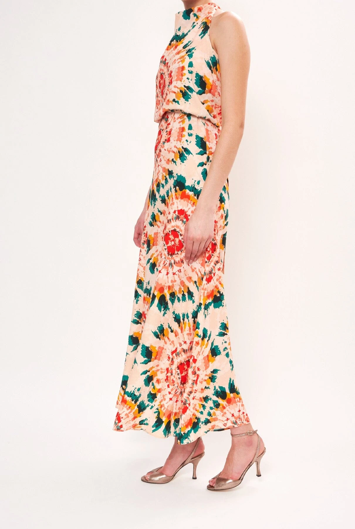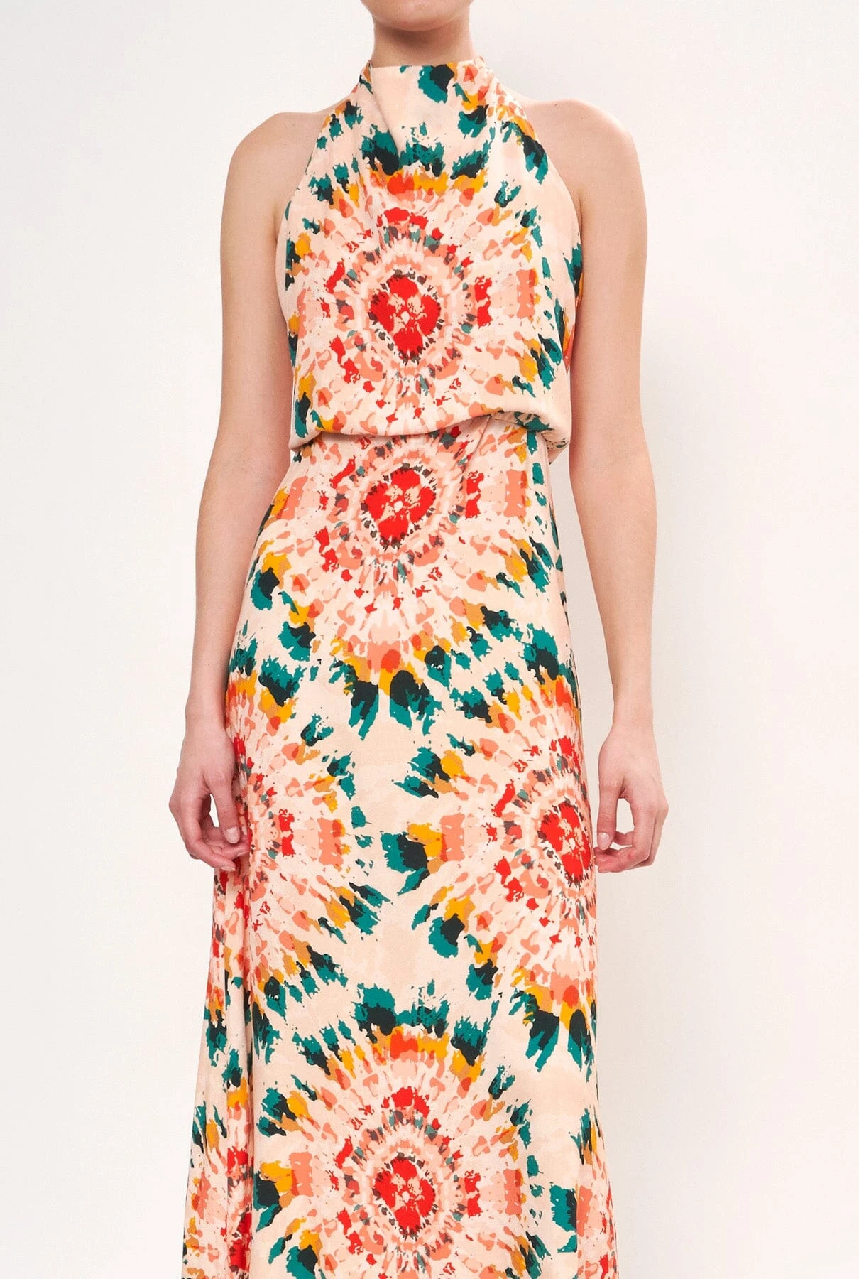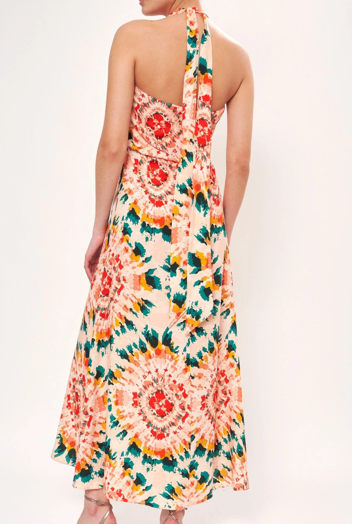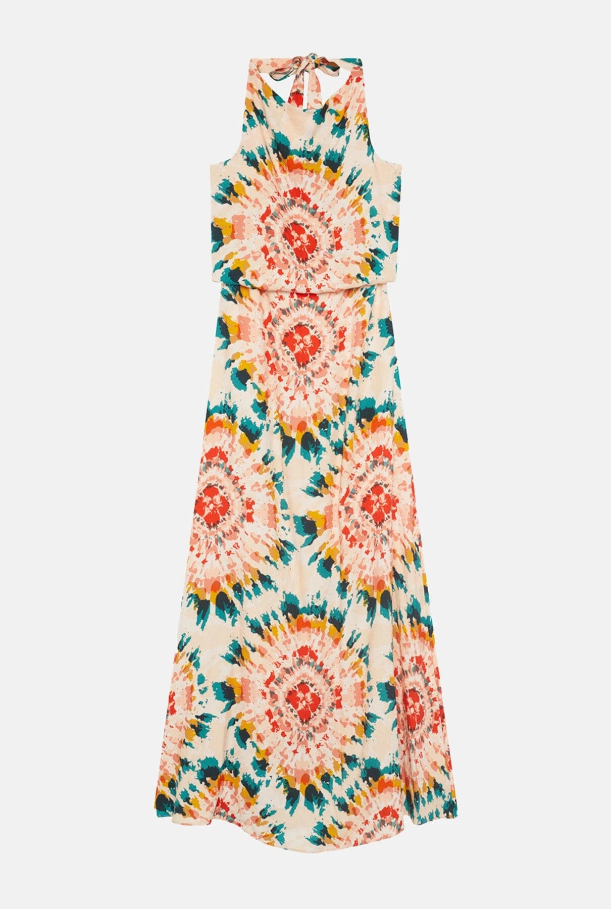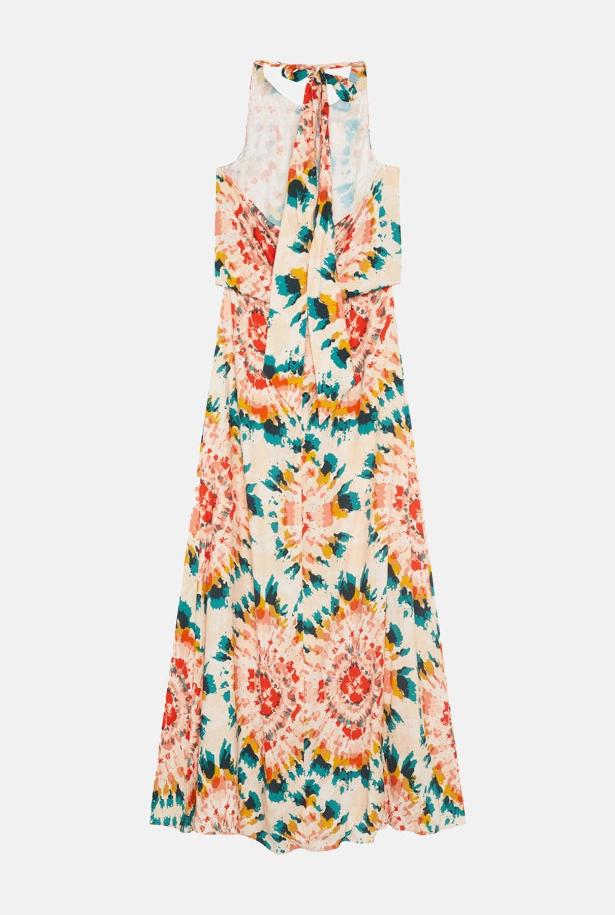 Long printed dress with a loose halter neckline and a large loop at the back to hold it in place. The body has an overshirt effect. In 2 tones: Ibiza pinks and Mosaic.