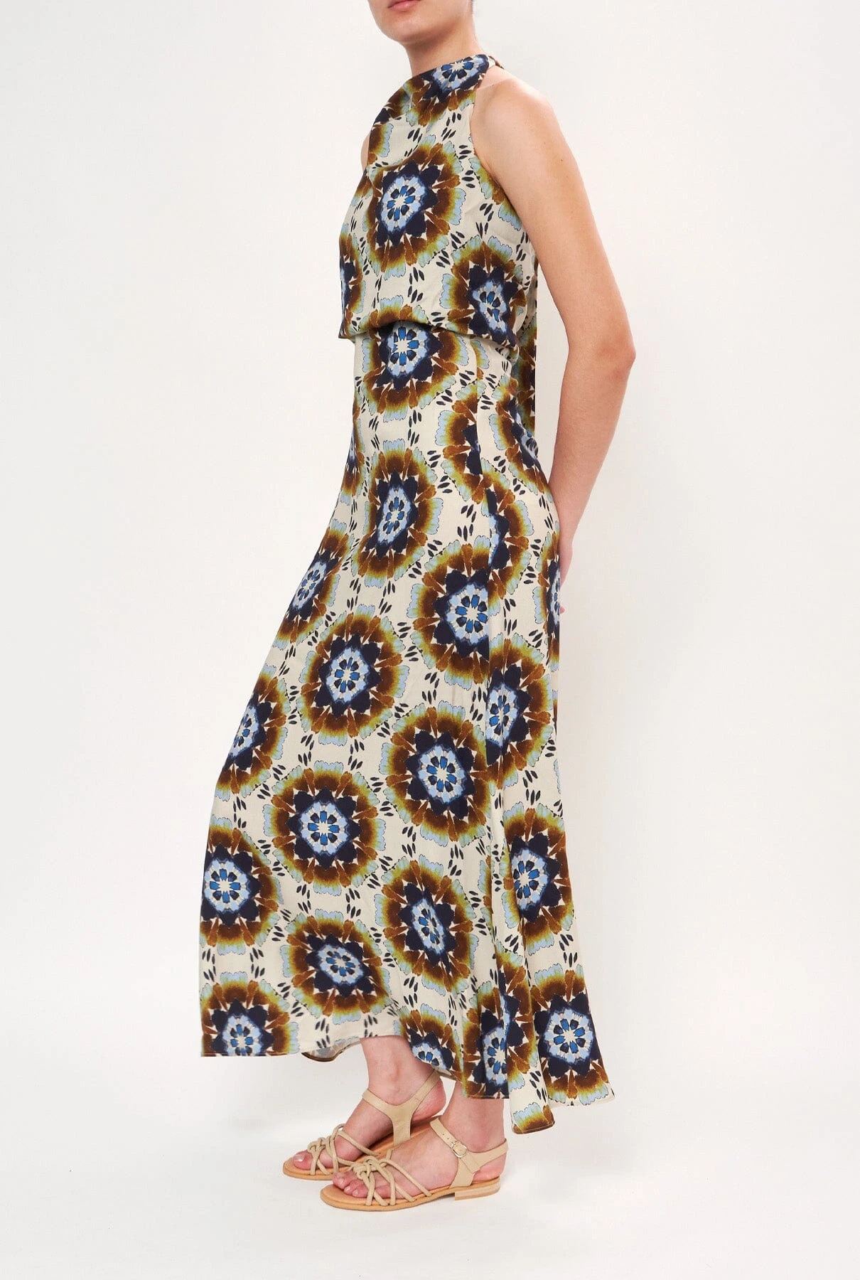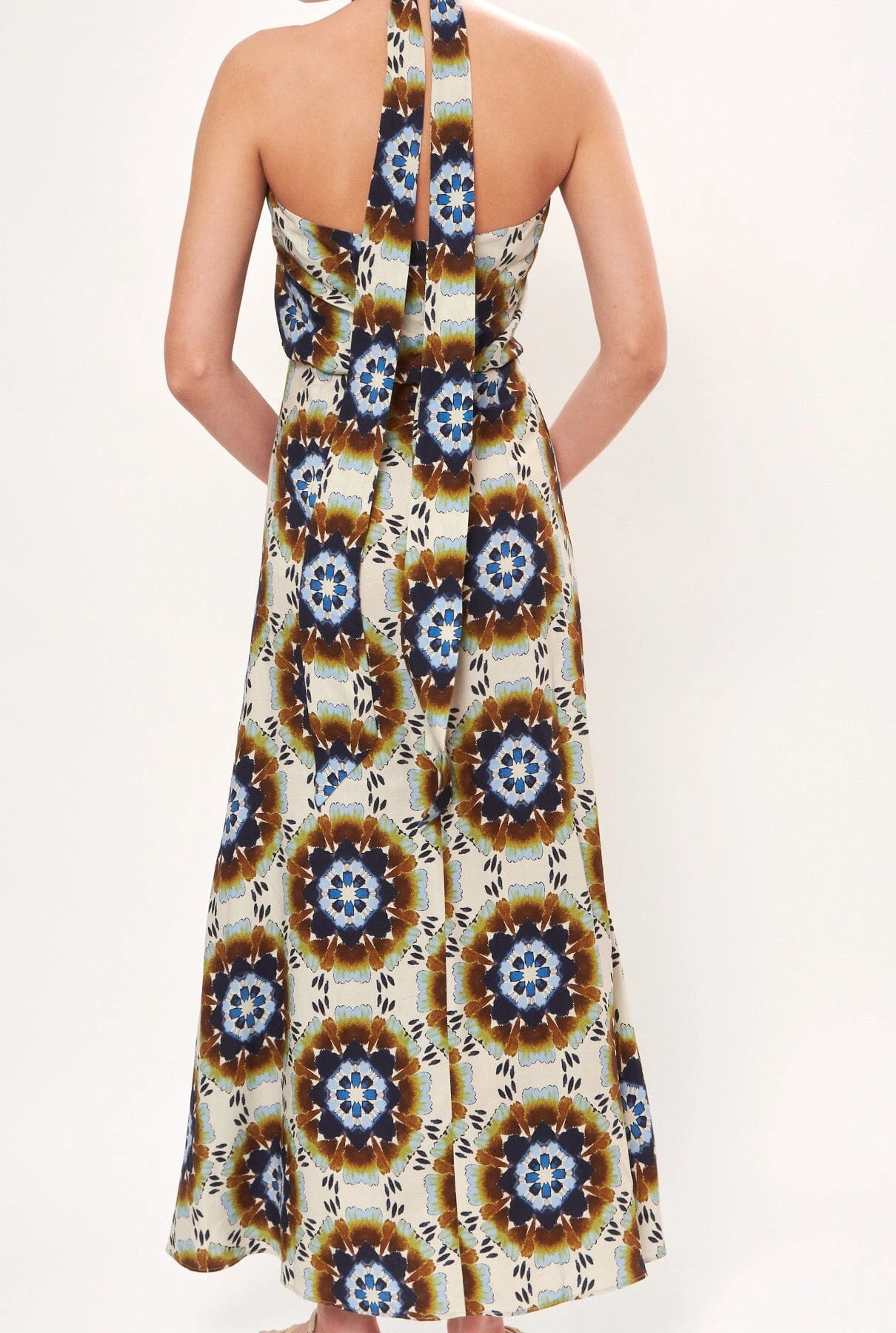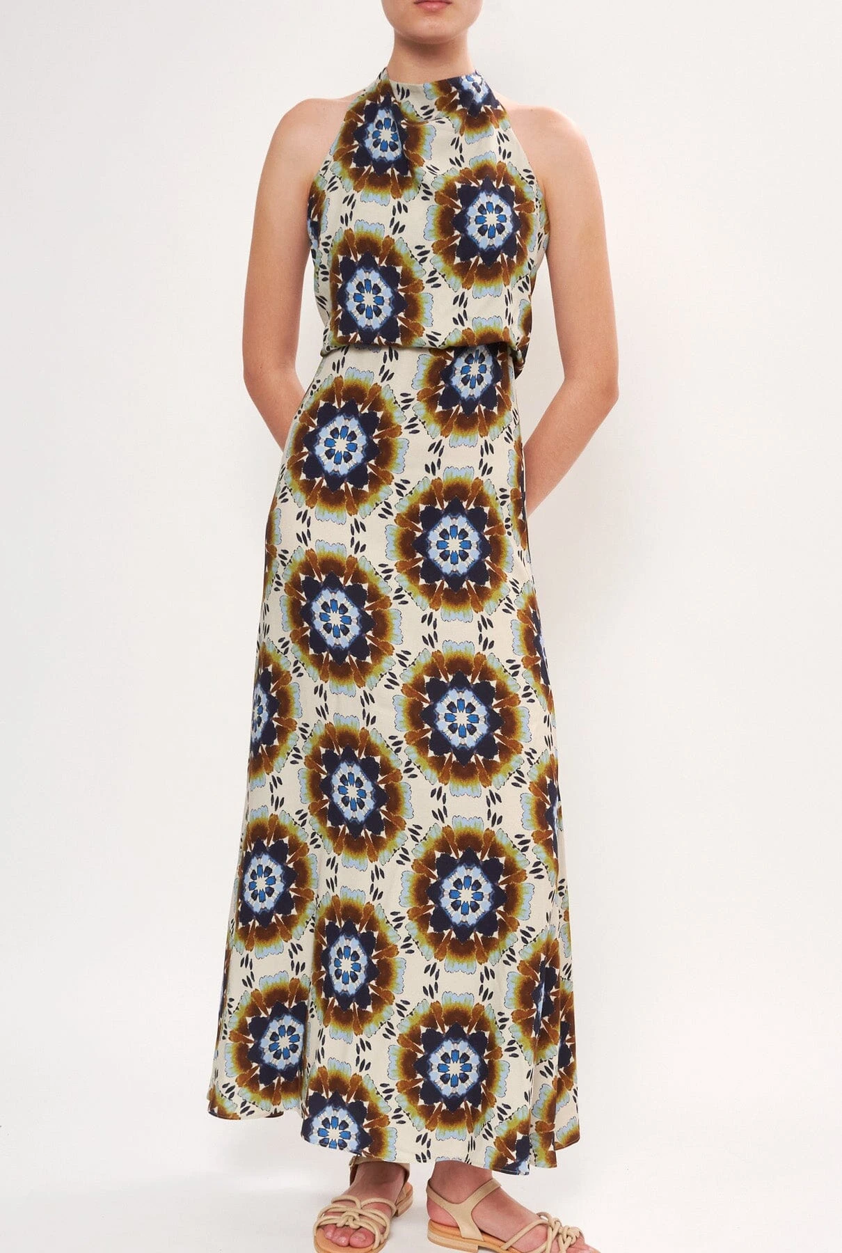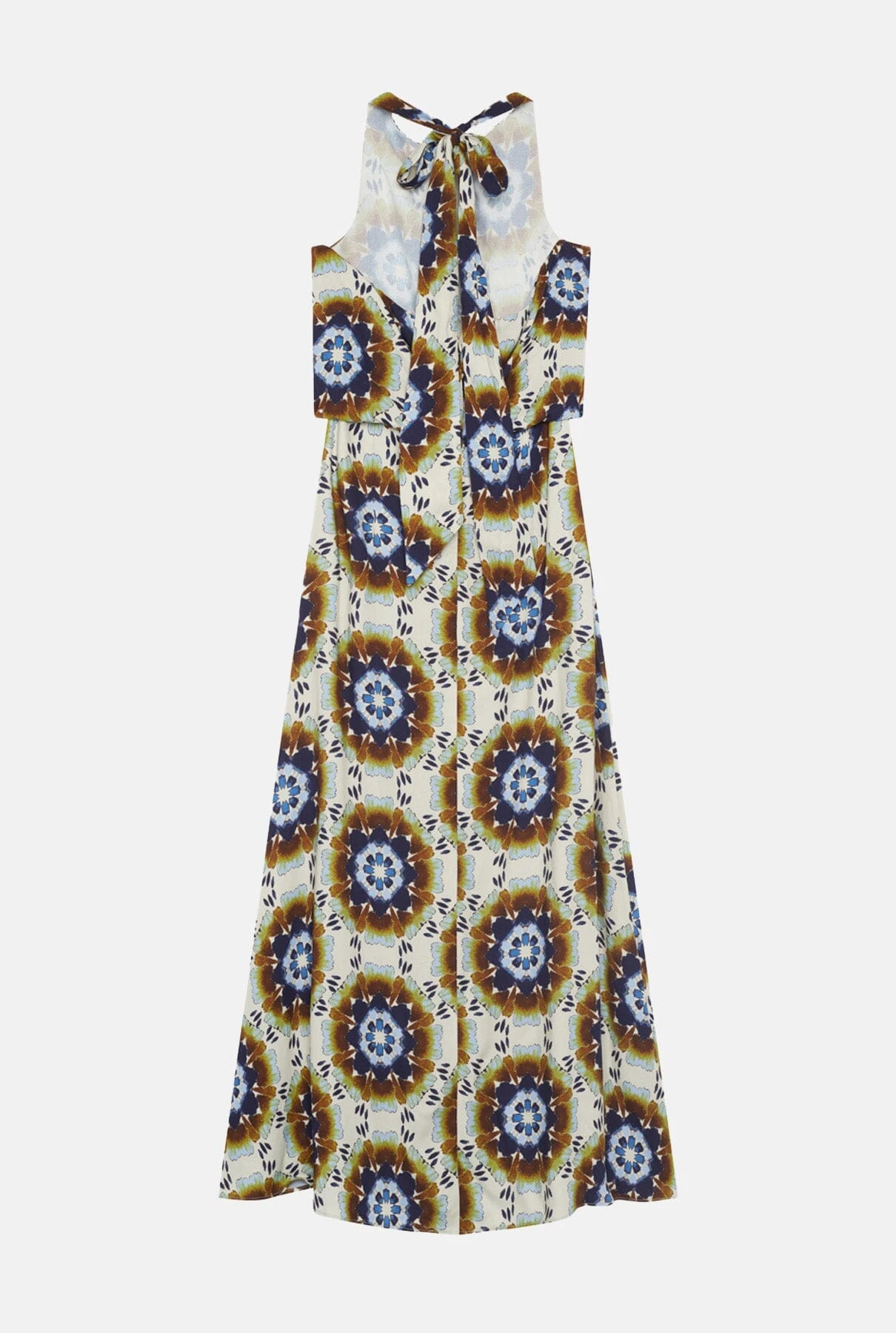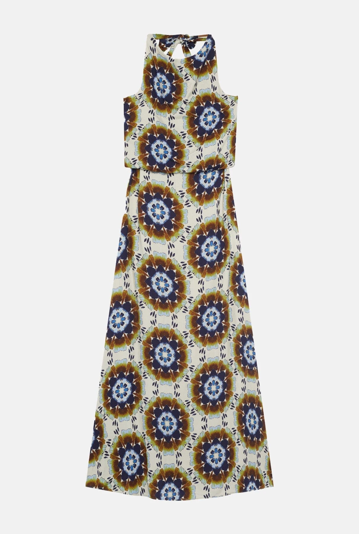 Long printed dress with a loose halter neckline and a large loop at the back to hold it in place. The body has an overshirt effect. In 2 tones: Ibiza pinks and Mosaic.