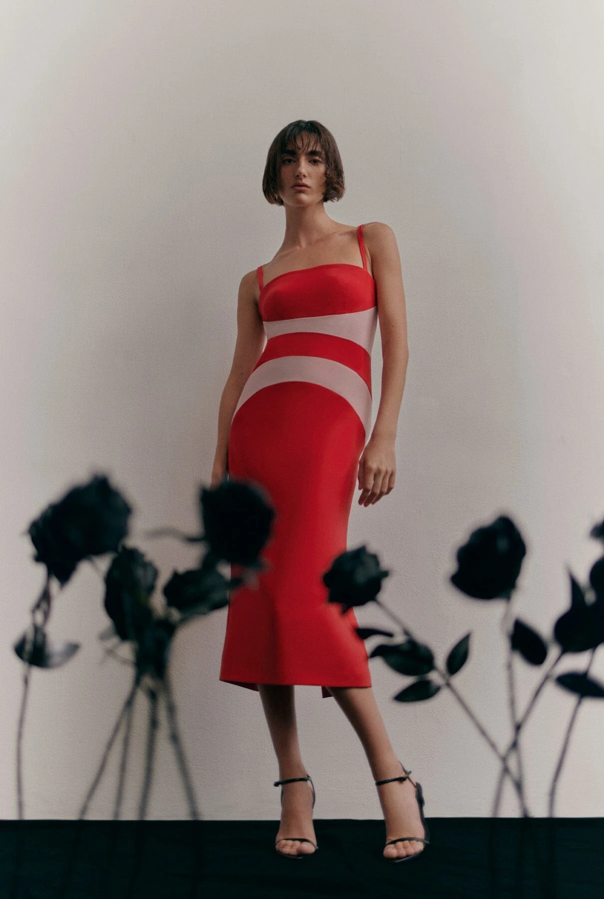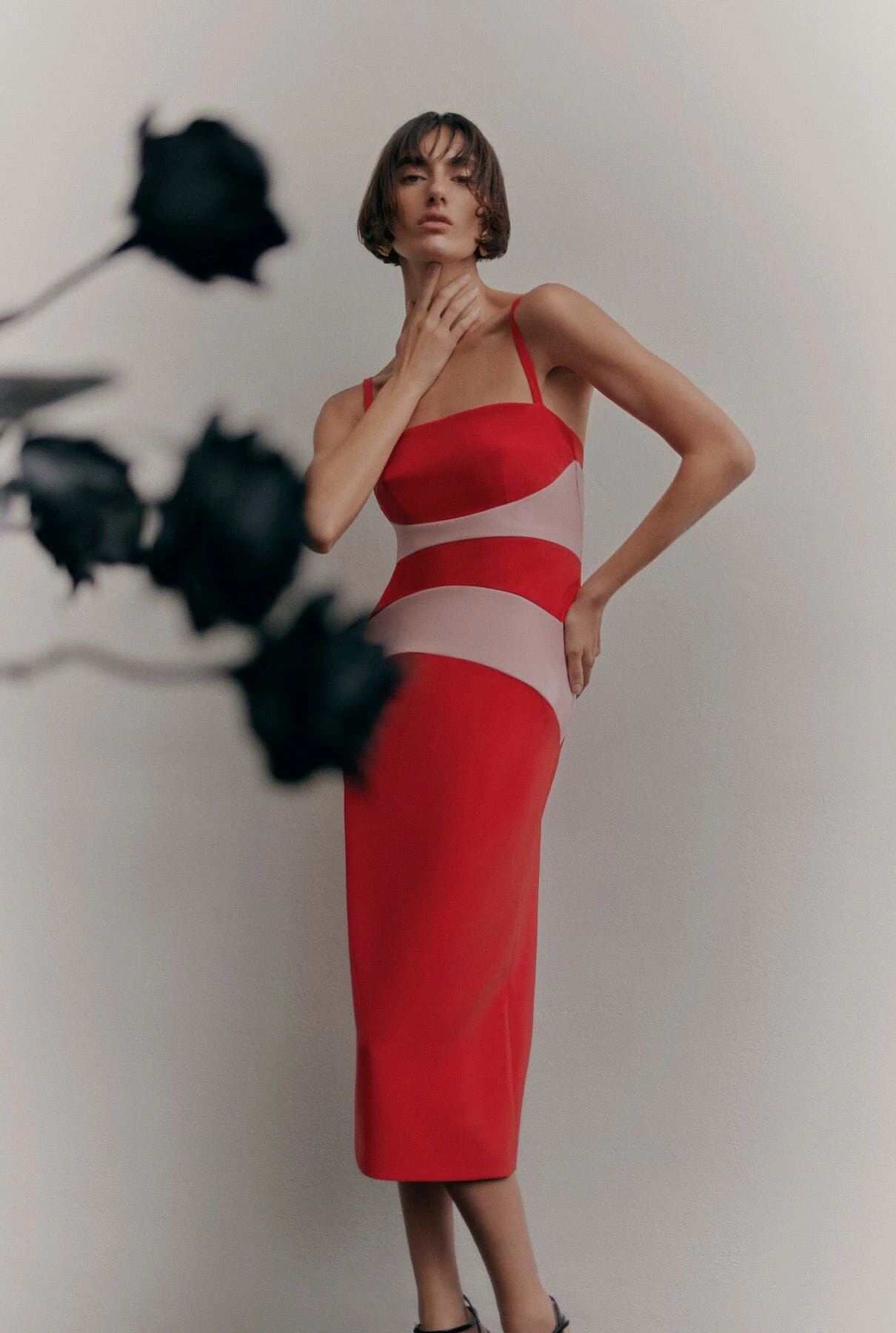 Midi-cut strapless dress with two-tone striped detail on the body. Invisible back zip fastening and lining. Made in Spain. Available in more colours.