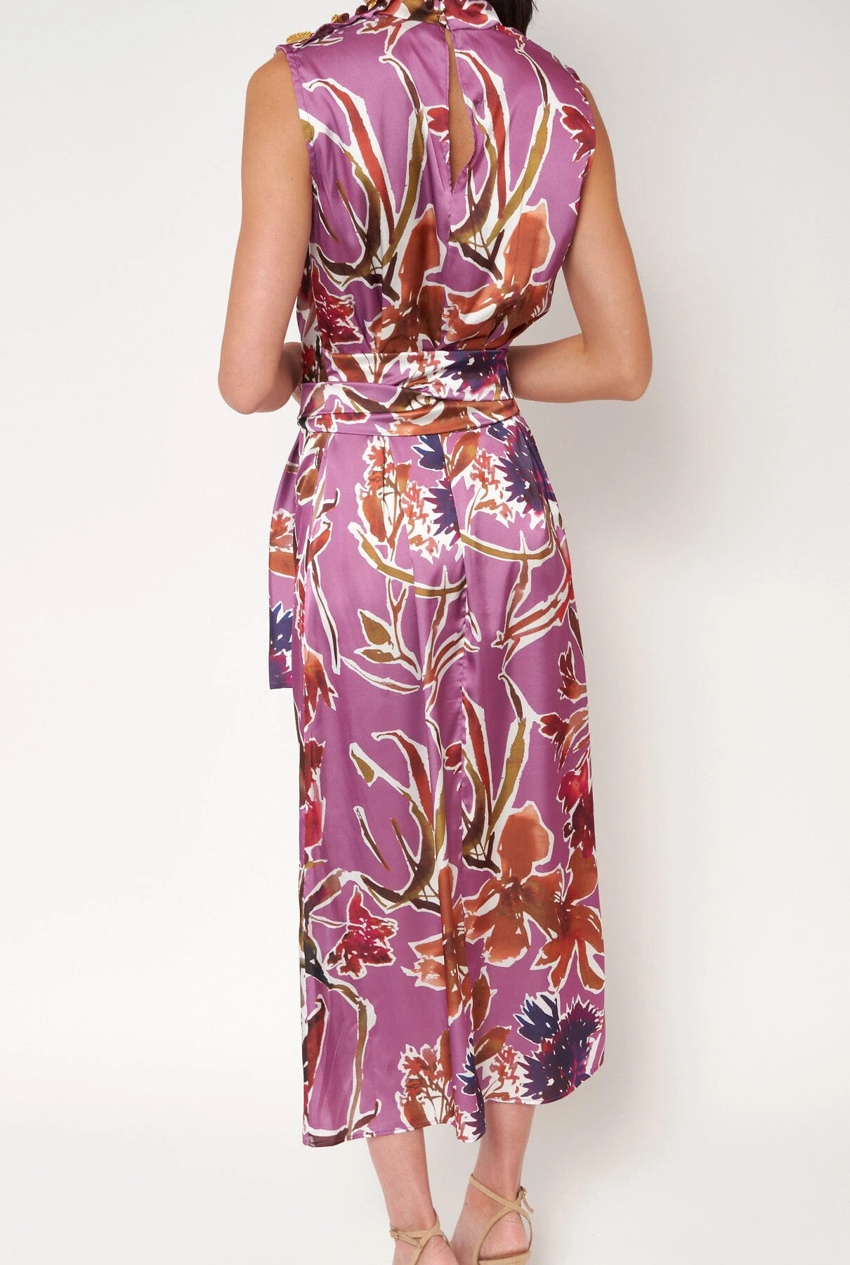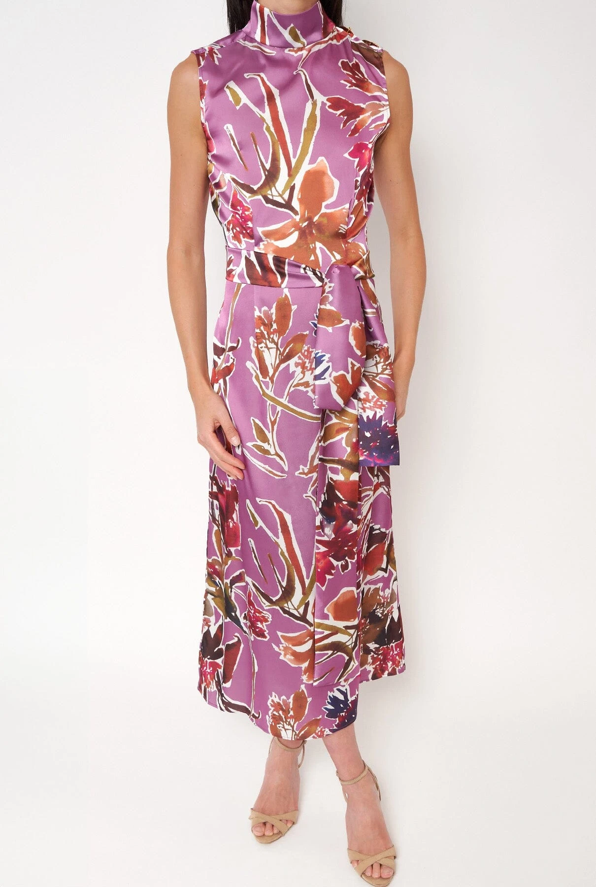 Midi dress without sleeves, high collar with three summarys on the side. Side ties to adjust the waist in front or back.