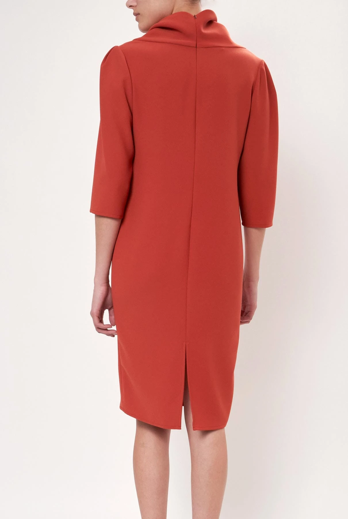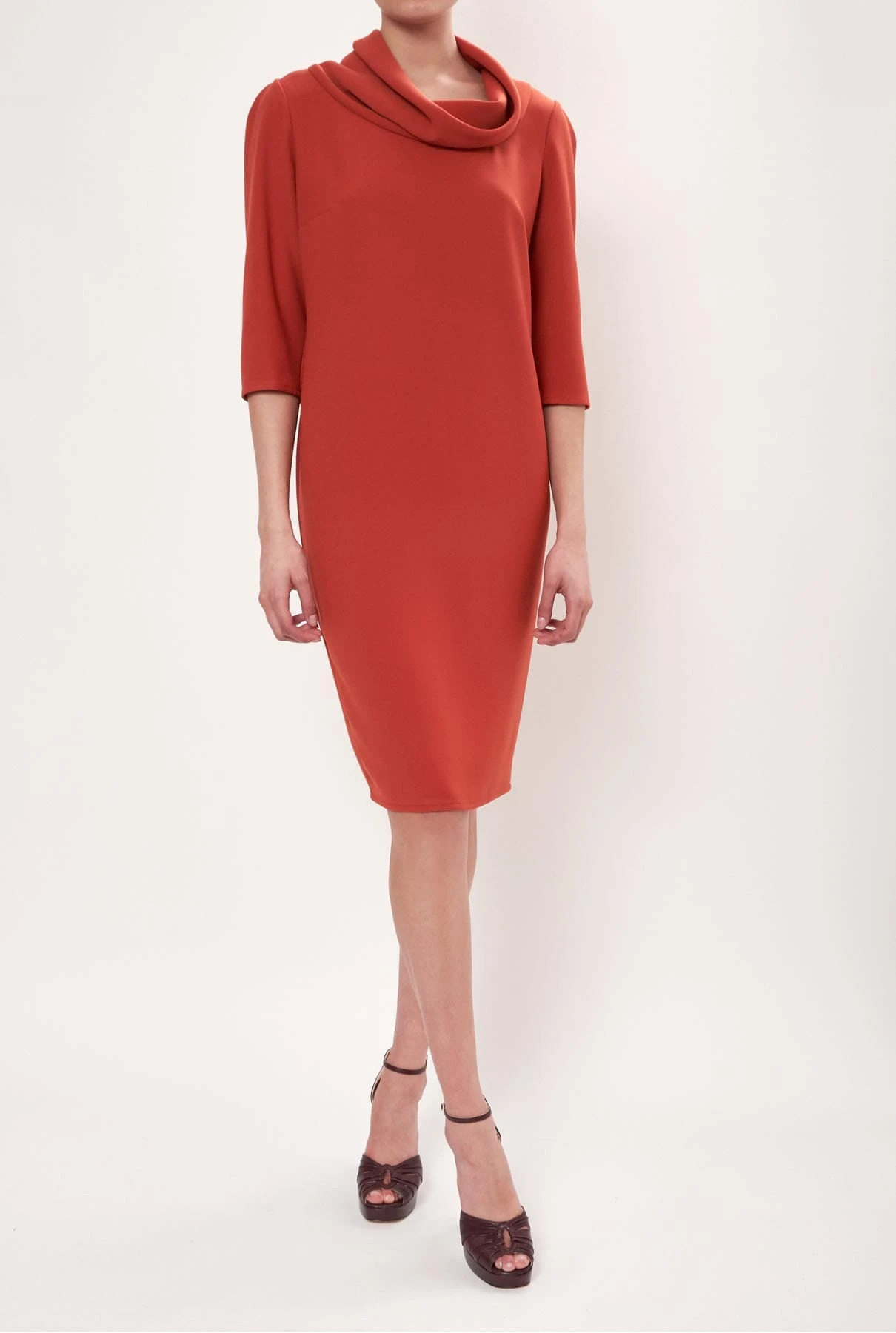 Crepe dress, half sleeve and midi length. Asimmetric collar Invisible back zipper. Designed by Ulises Mérida.