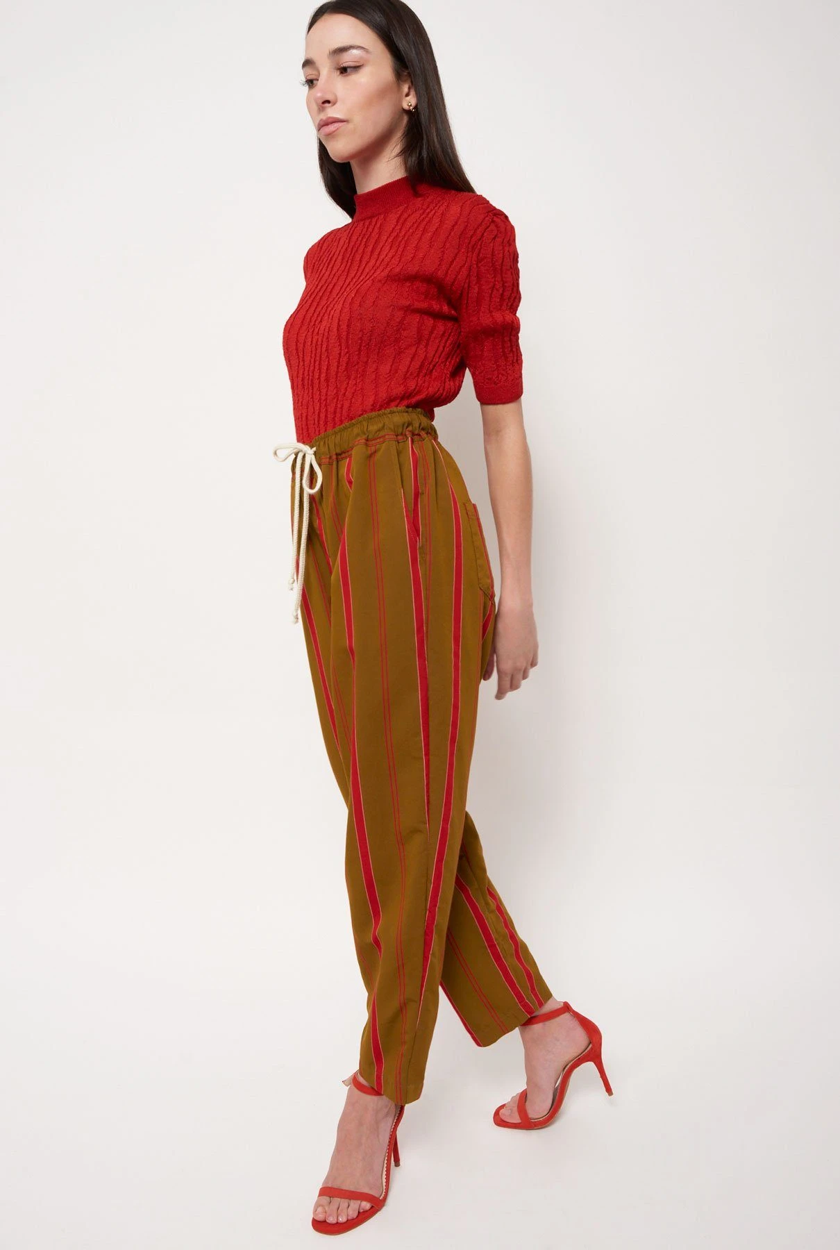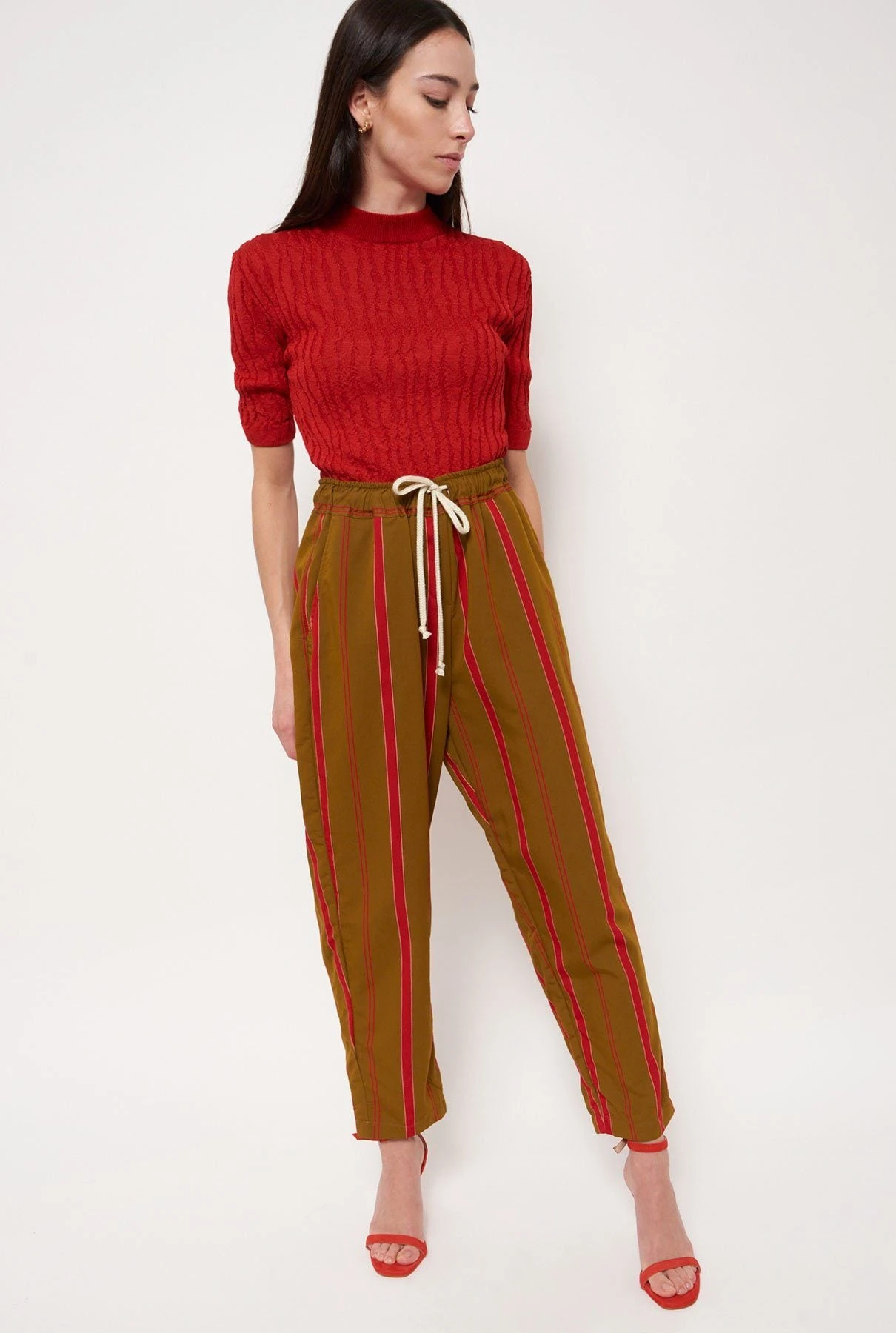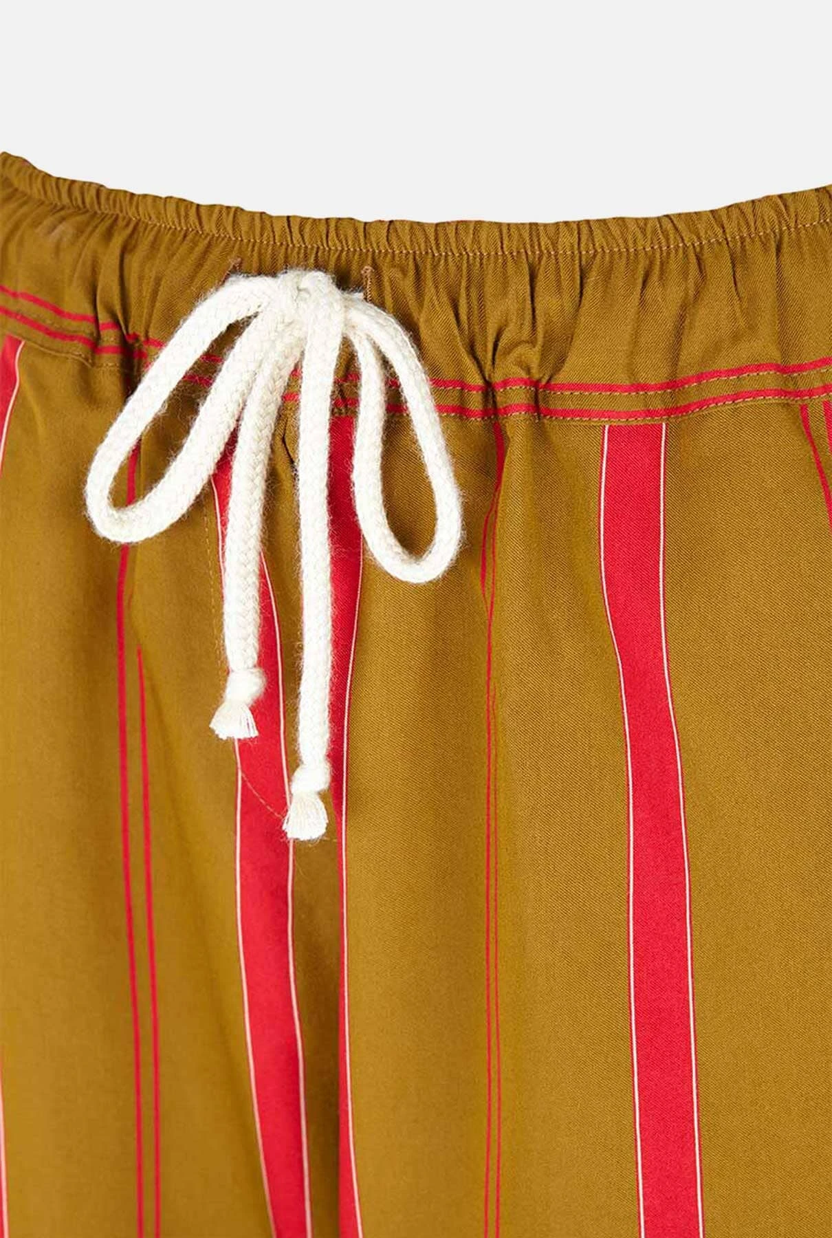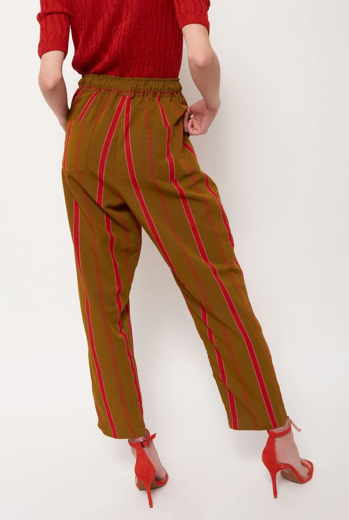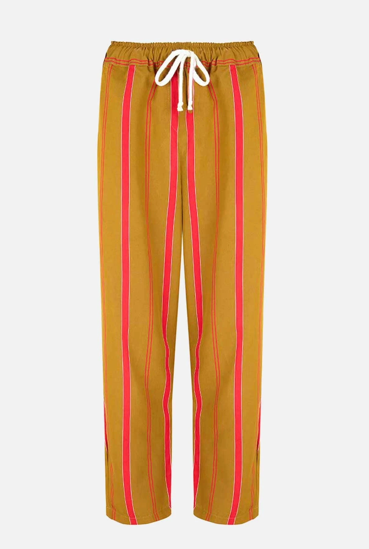 Ochre colored trousers with red vertical stripes. Adjustable in the waist and pocket in the back side. Combine it with the [Jackie] shirt for a full fit. Unisex fitting. Designed by Amlul