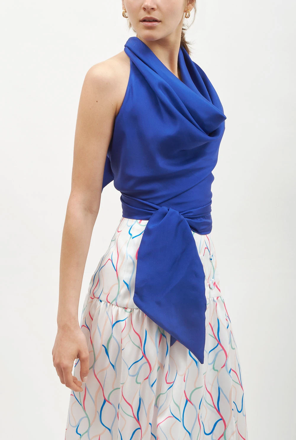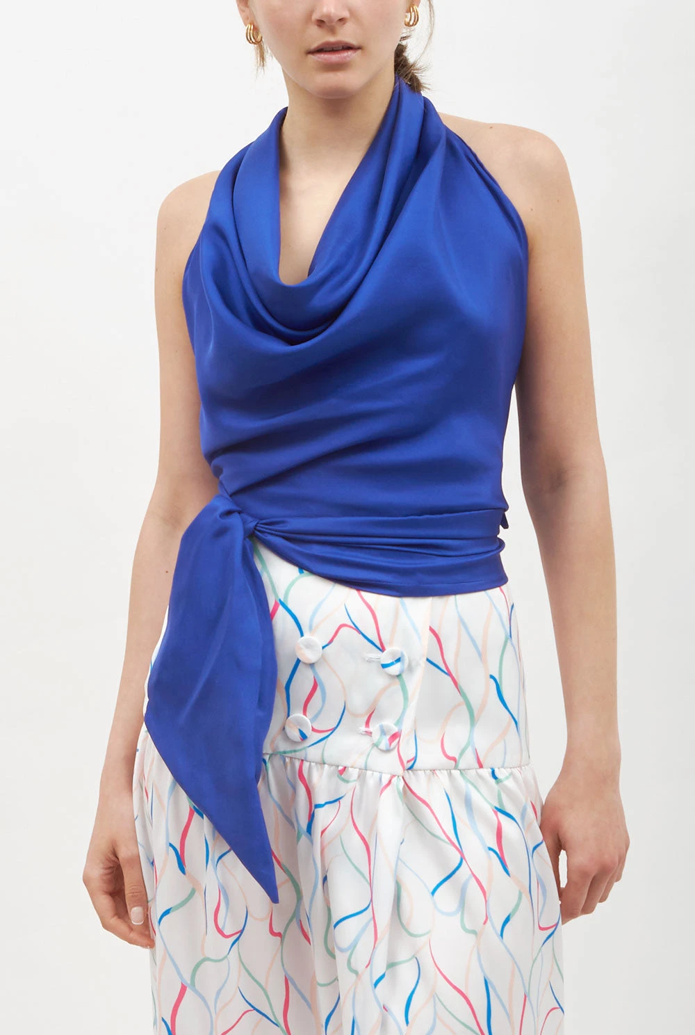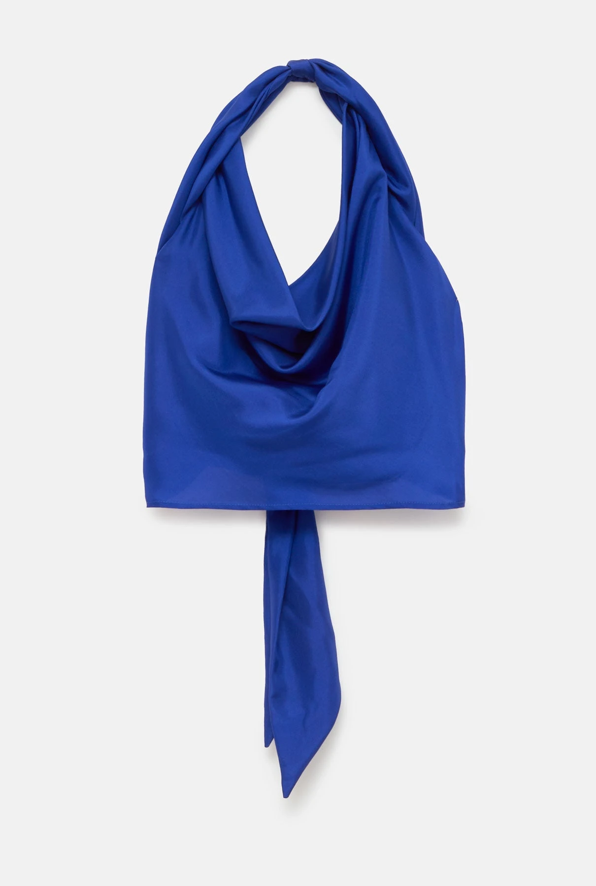 Delicate one-size top with scarf ddesign effect made of fine silk fabric. Halter neckline, tied at the neck and waist. Wash: delicate fabrics. Irom: better use vapor. Designed by Diddo