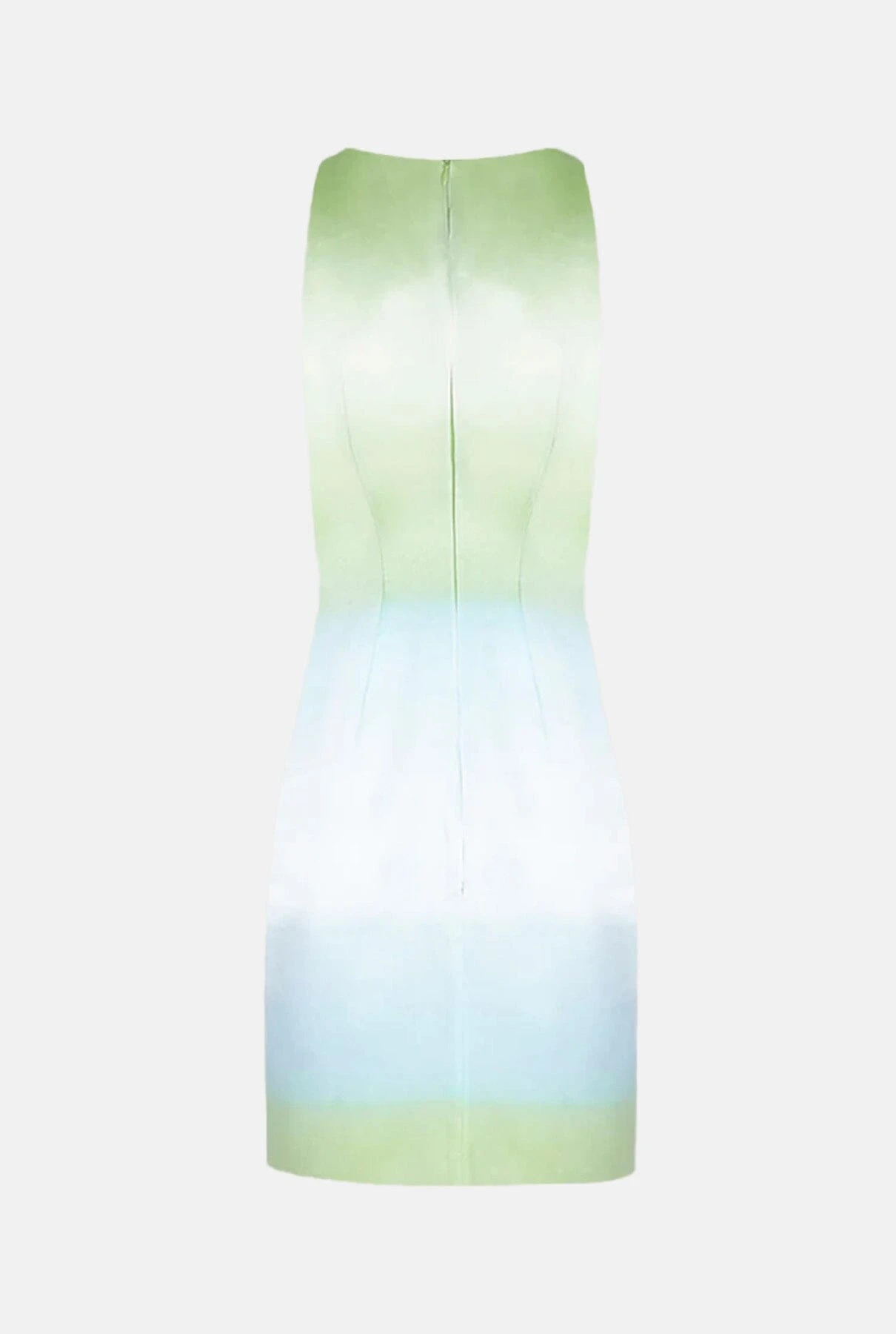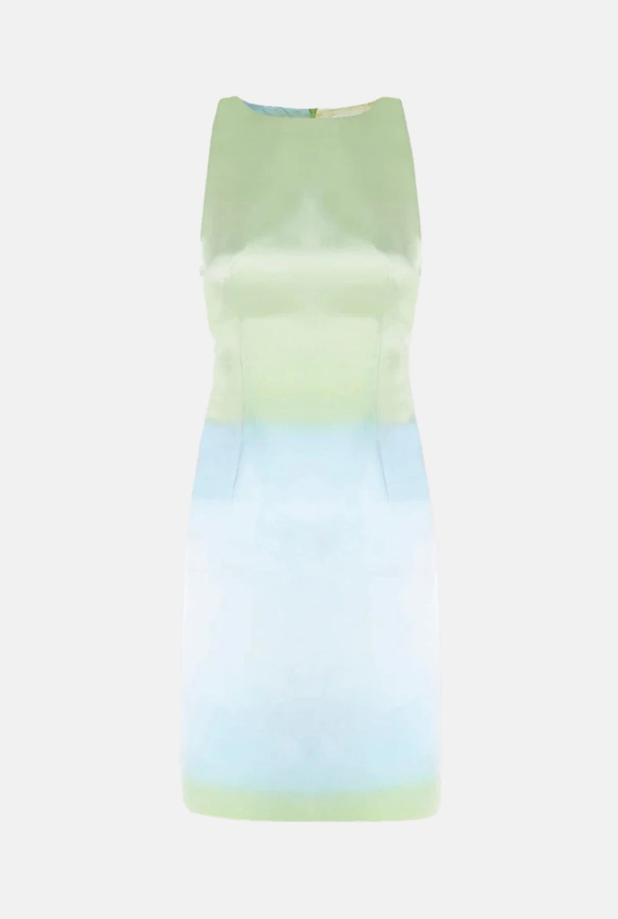 Midi dress made of satin fabric, including three different colors, green, blue and yellow.