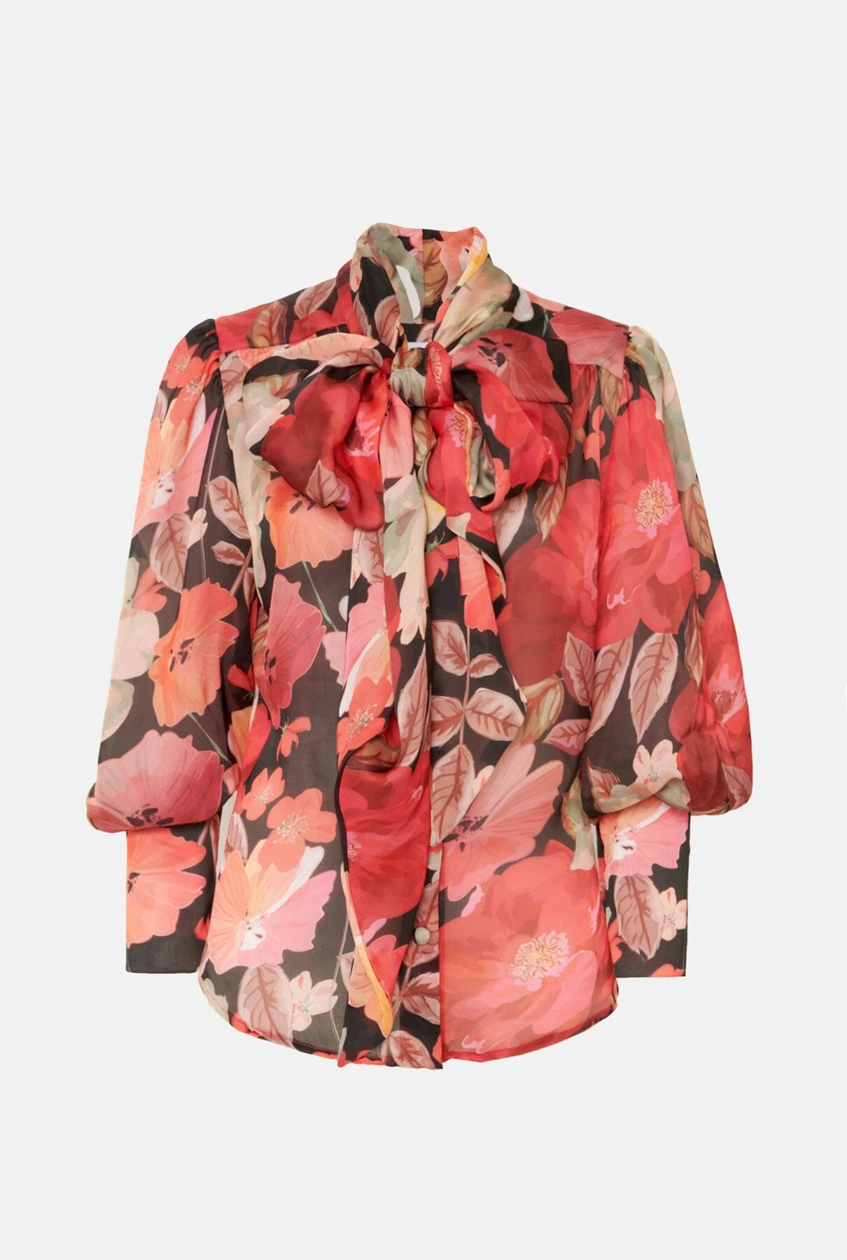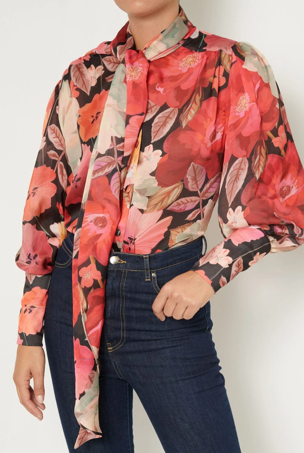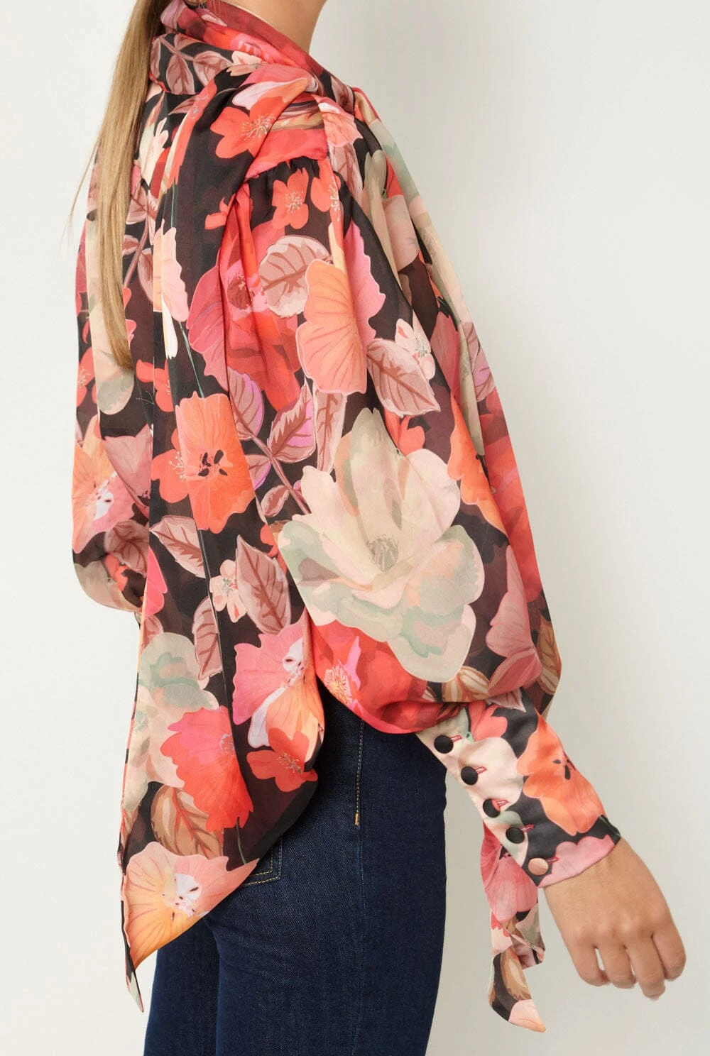 The LENY desing is made in fluid and semi-transparent flower print textile that will make you feel special. Long sleeves with volume finished in cuffs with covered summarys like front closure. Extra long lacer at the collar.